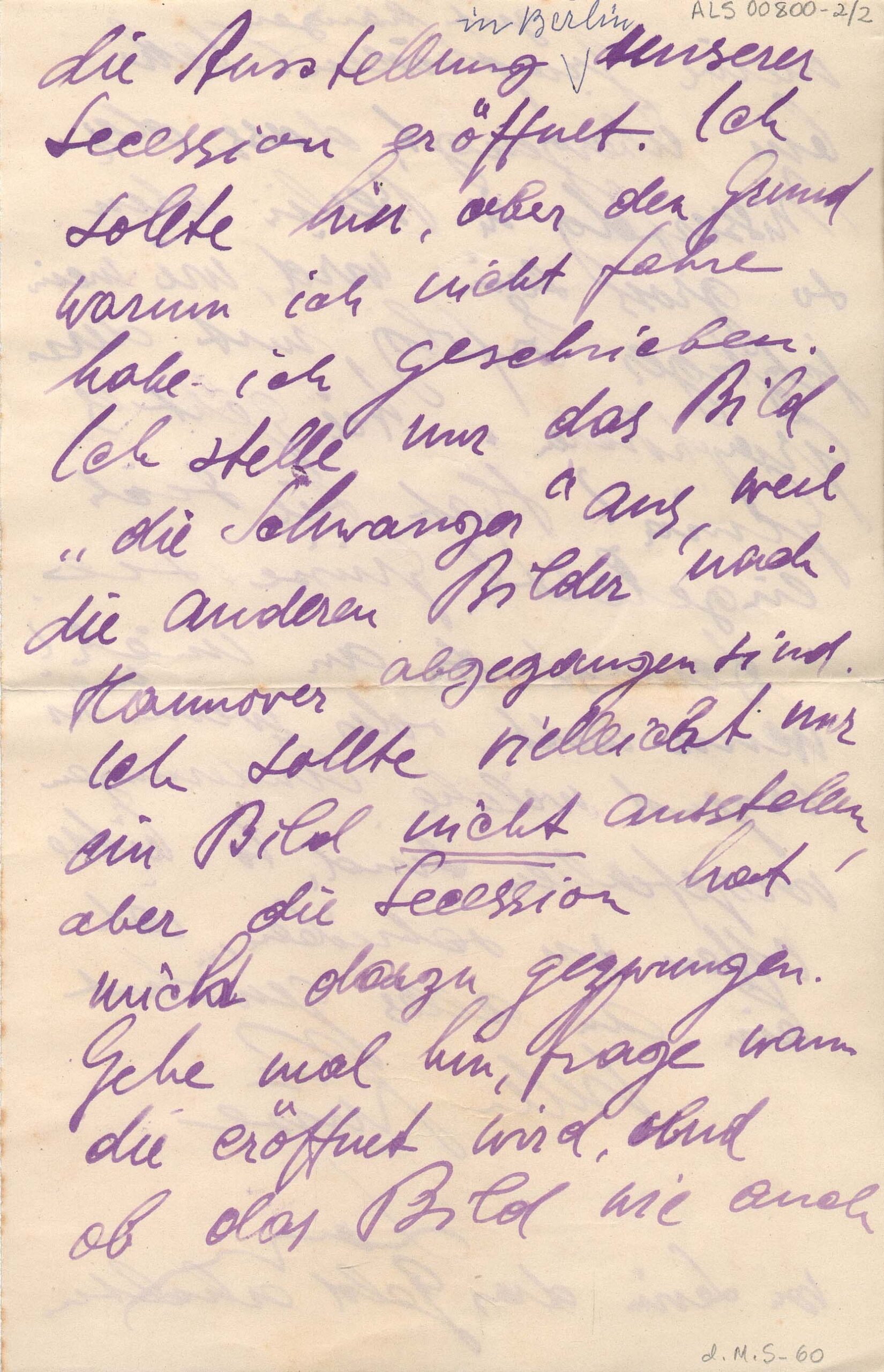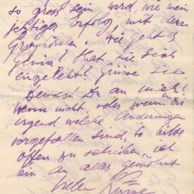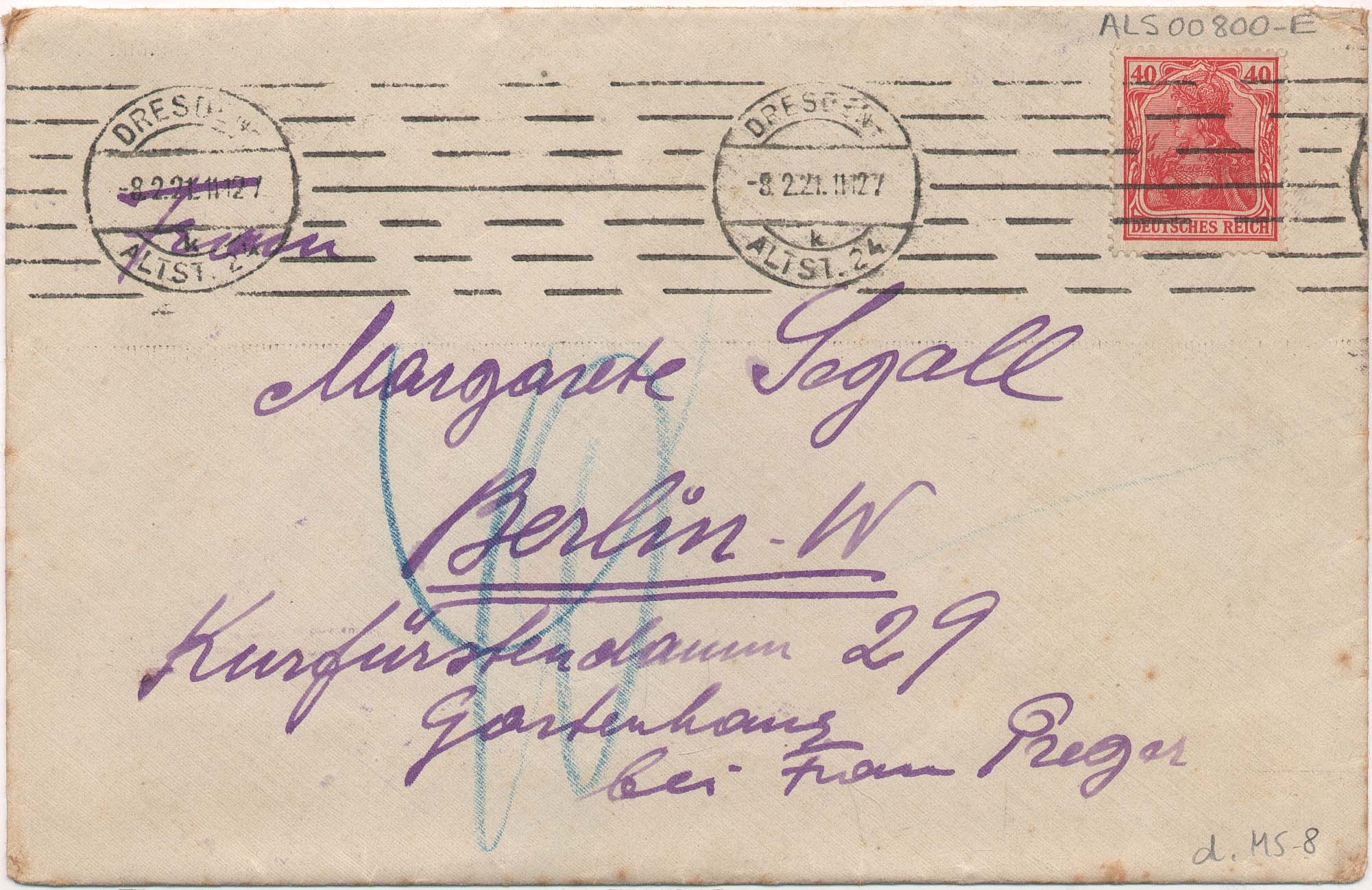 Carta sem data, indicado "Freitag" [sexta-feira]; acompanha envelope ALS 00800-E, postado em 3-2-1921; Segall em Dresden, Hübnerstr, 19; Margarete em Berlin - W, Kurfürstendamm, 29, Gartenhaus, bei Frau Preger; doação Margarete Suhr, d.MS - 8 e 60