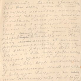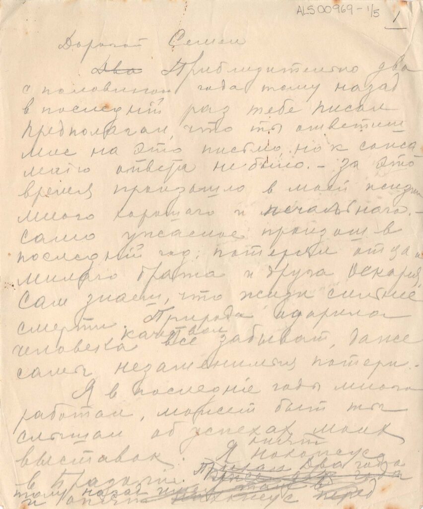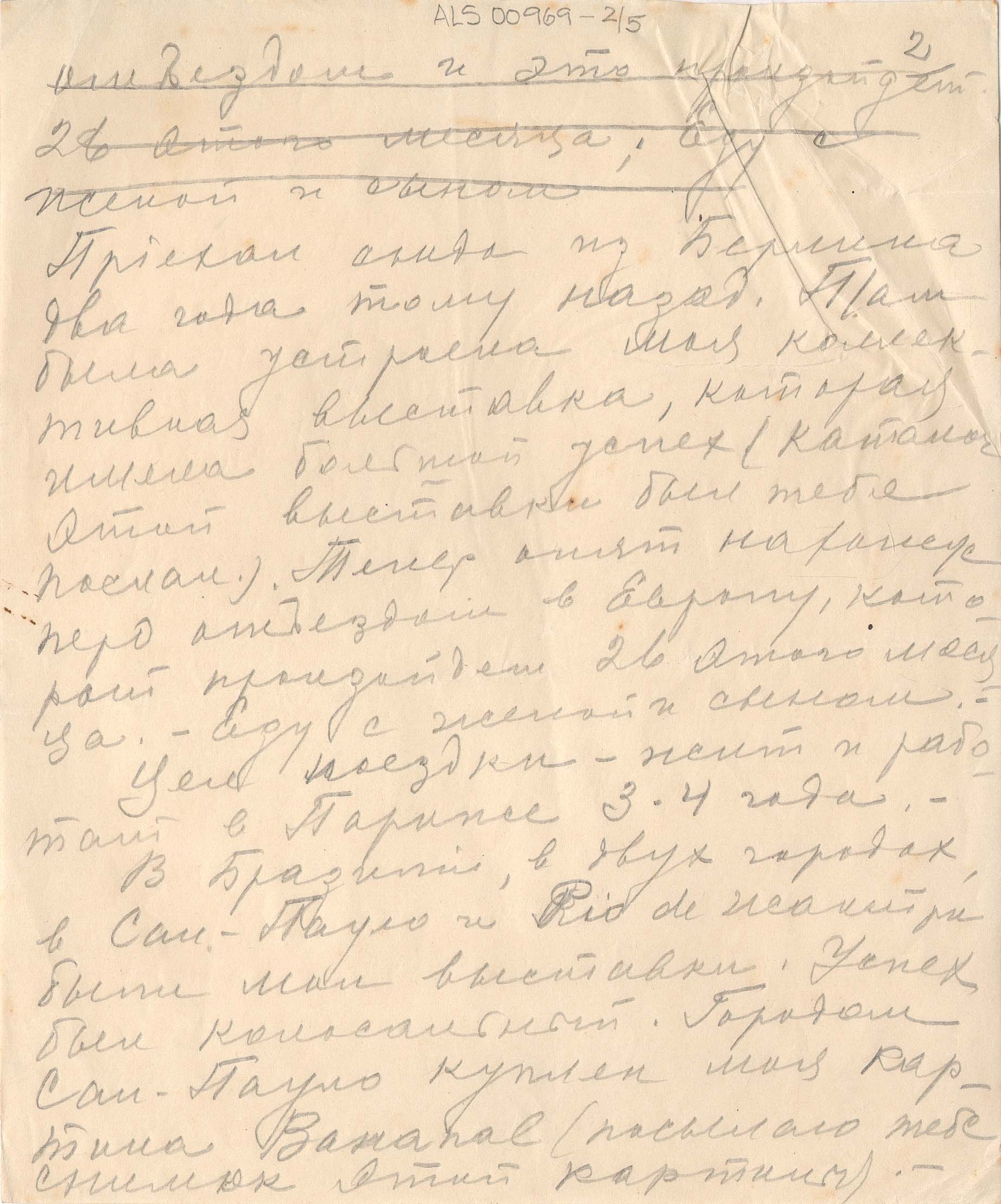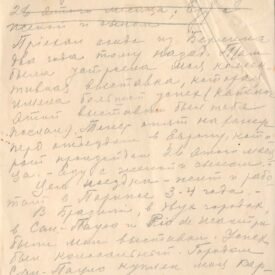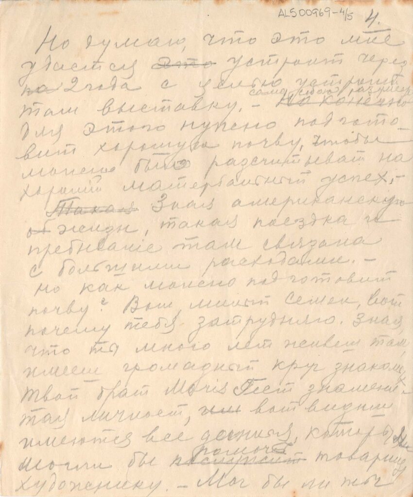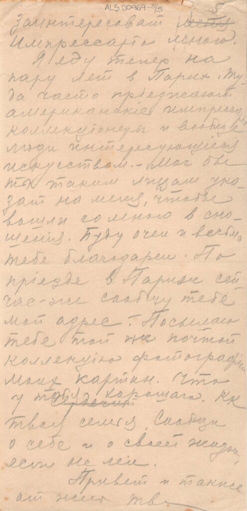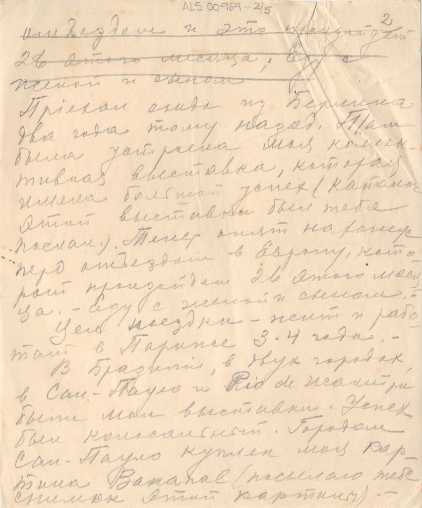Diz que há mais ou menos dois anos e meio escreveu e esperava uma resposta, que não veio; "nesse tempo aconteceu muita coisa na minha vida, alegres e tristes; no último ano perdi o pai, o irmão e amigo Oscar. Você sabe que a vida é mais forte que a morte; o homem esquece até as perdas que não podem ser substituídas. Pode ser que você tenha ouvido falar dos sucessos das minhas exposições. Cheguei de Berlim ao Brasil há doi anos. Em Berlim, fiz exposição que teve grande sucesso e te mandei o catálogo dessa exposição.Vou com a mulher e o filho para Paris, trabalhar por 3-4 anos.Lá estão empresários e colecionadores norte-americanos e pessoas que se interessam pela arte. Fiz exposições no Rio e em São Paulo, com sucesso. A cidade de São Paulo comprou meu quadro Bananal, do qual te mando a fotografia; tenho muitas encomendas de retratos; a juventude daqui se interessa pela arte, amou o meu trabalho e para mim isso é muito estimulante, tanto do ponto de vista financeiro como artístico. Ainda continuo a pensar seriamente sobre a América, viagem que adiei até agora, porque eu não tinha condições, do ponto de vista financeiro, mas acho que daqui a dois anos posso fazer uma exposição lá. Preciso de uma base para essa viagem, porque inclui muitos gastos. É por isso, querido Simeão, que eu te escrevo, porque você mora lá há muito tempo.Você podia me recomendar a essas pessoas para que entrem em contato comigo; eu ficaria muito agradecido a você. Pelo mesmo correio mandarei fotografias dos meus trabalhos"