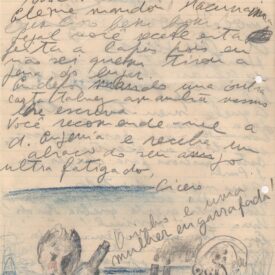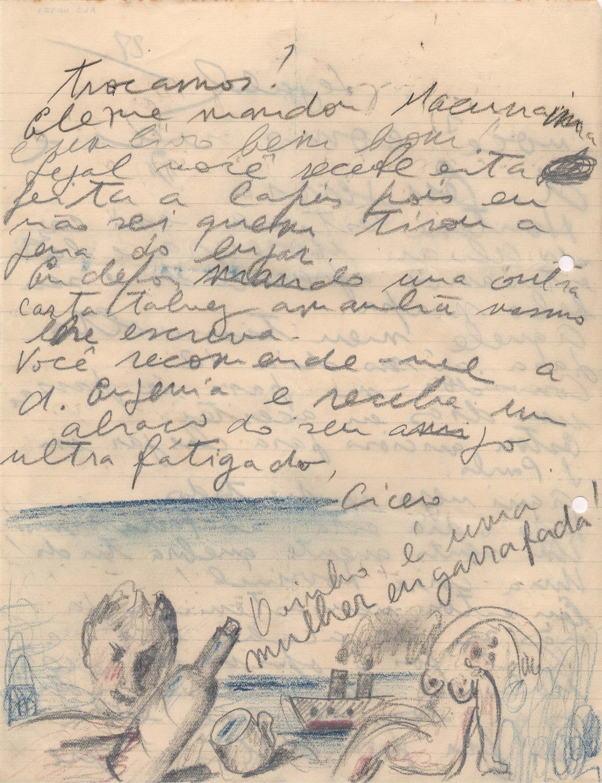 Desenho de Cícero Dias, a grafite e lápis de cor ao fim da carta, com anotação a grafite: ``O vinho é uma mulher engarrafada.``