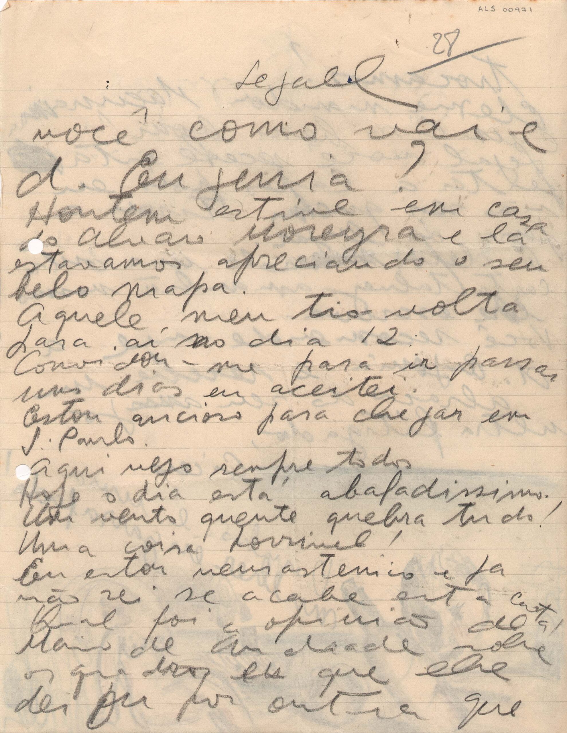 Esteve em casa de Álvaro Moreyra, apreciando "o seu belo mapa"; quer logo vir a São Paulo; pergunta qual a opinião de Mário de Andrade sobre os quadros que trocou com Segall; diz que Macunaíma de Mário de Andrade é "um livro bem bom"