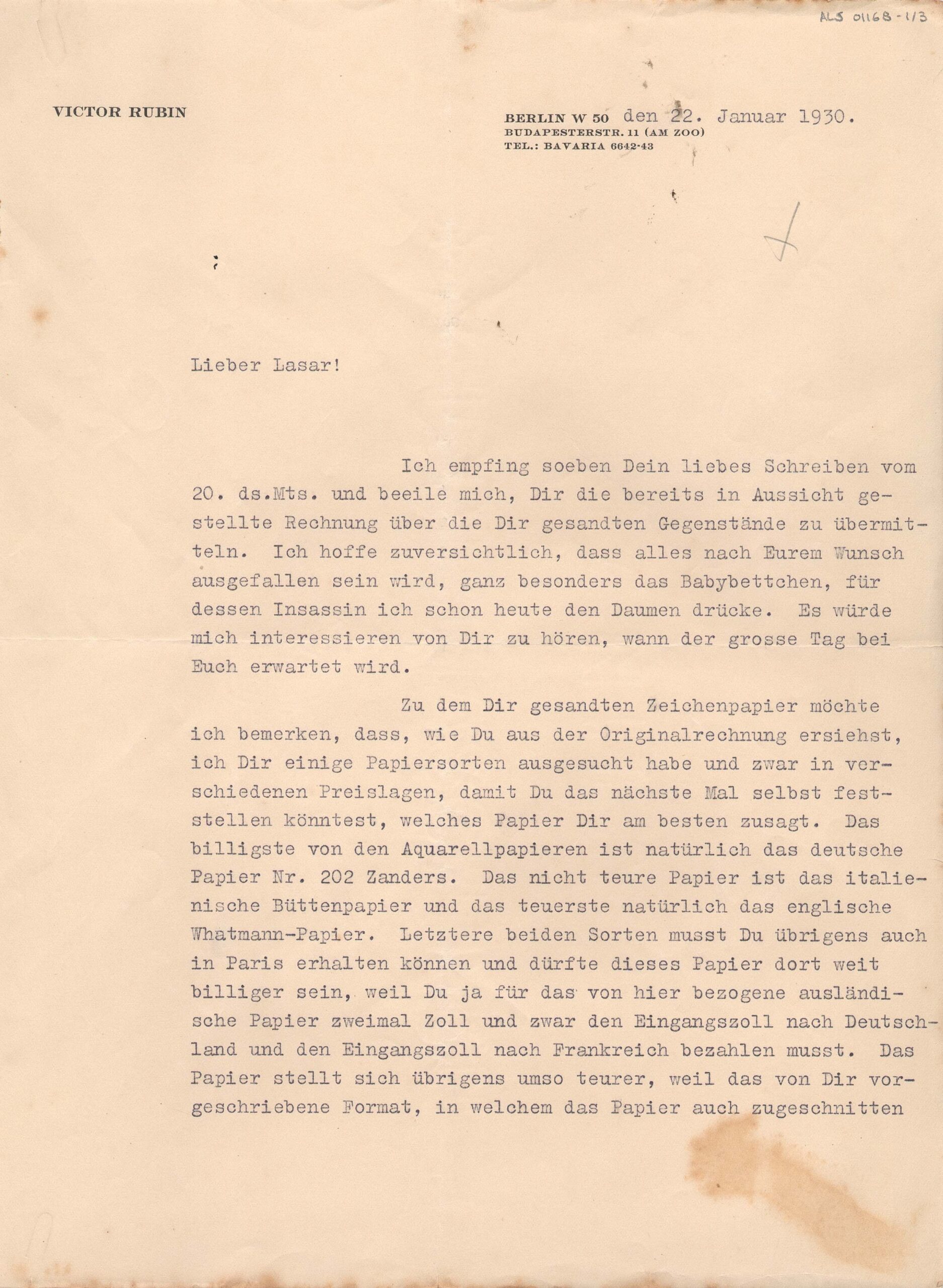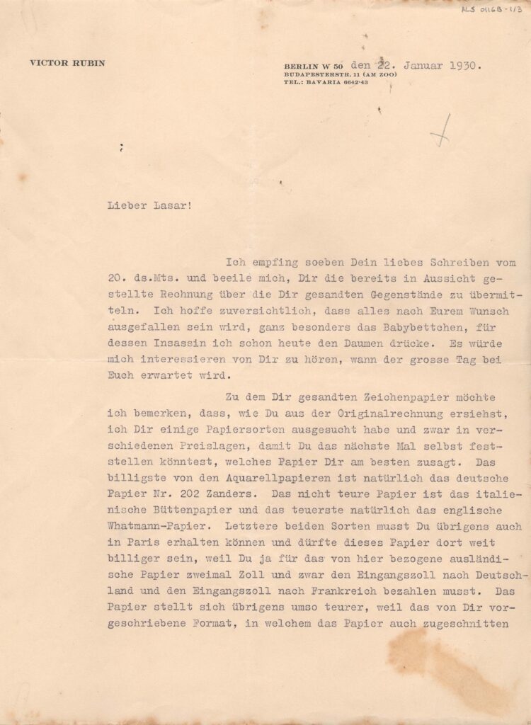 Folha timbrada: "Victor Rubin. Berlin W 50. Budapesterstr, 11 (am Zoo)"