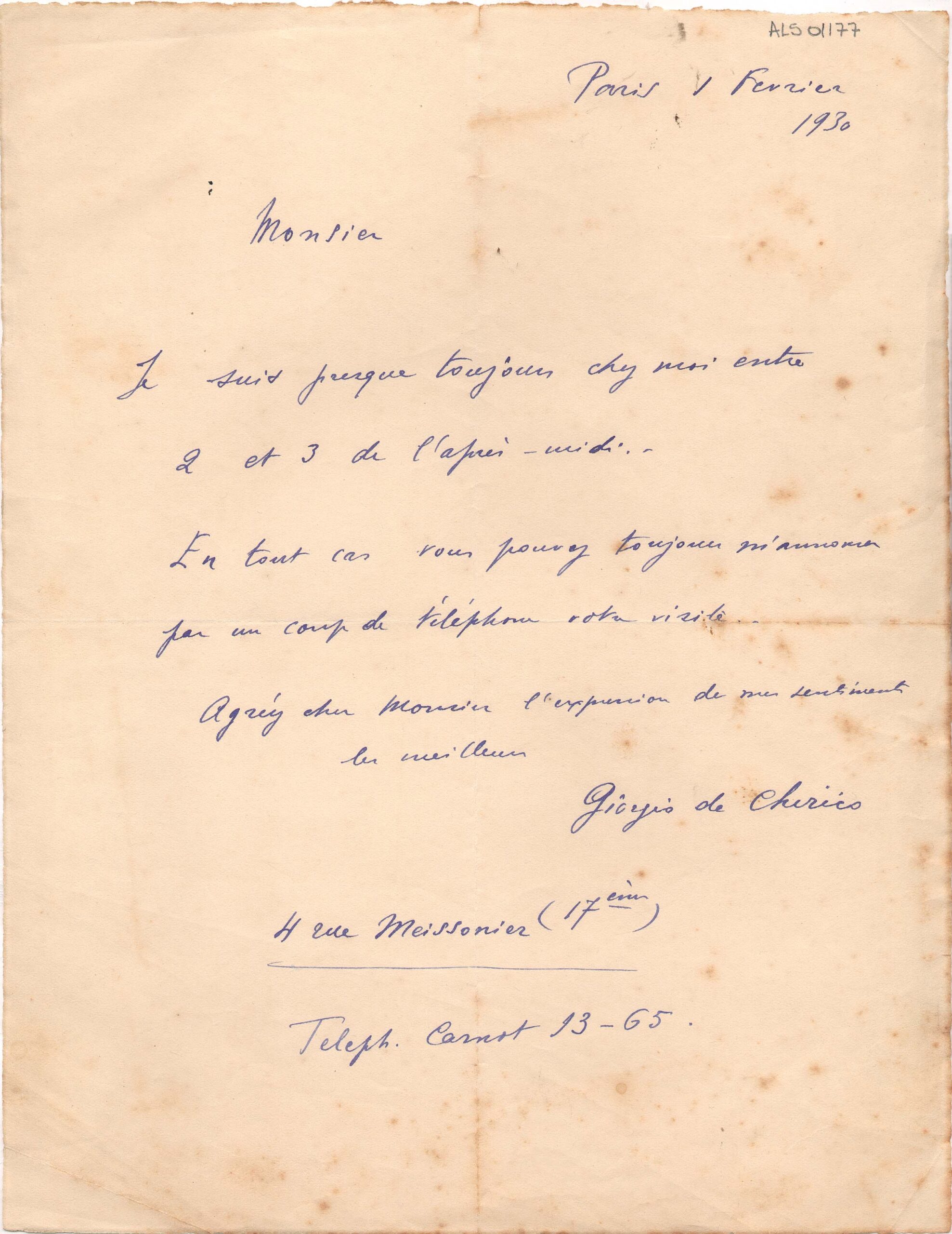 Carta de Giorgio de Quirico para Segall, Paris, 1º de fevereiro de 1930.