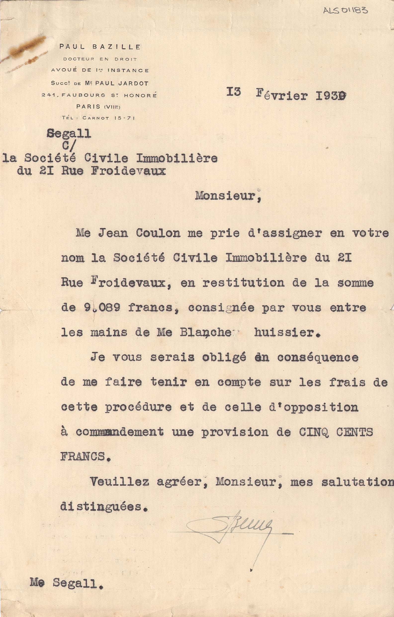 Carta de Paul Bazille, Société Civile Imobilière, administradora do endereço parisiense de Segall, 21 Rue Froidevaux, para Segall,