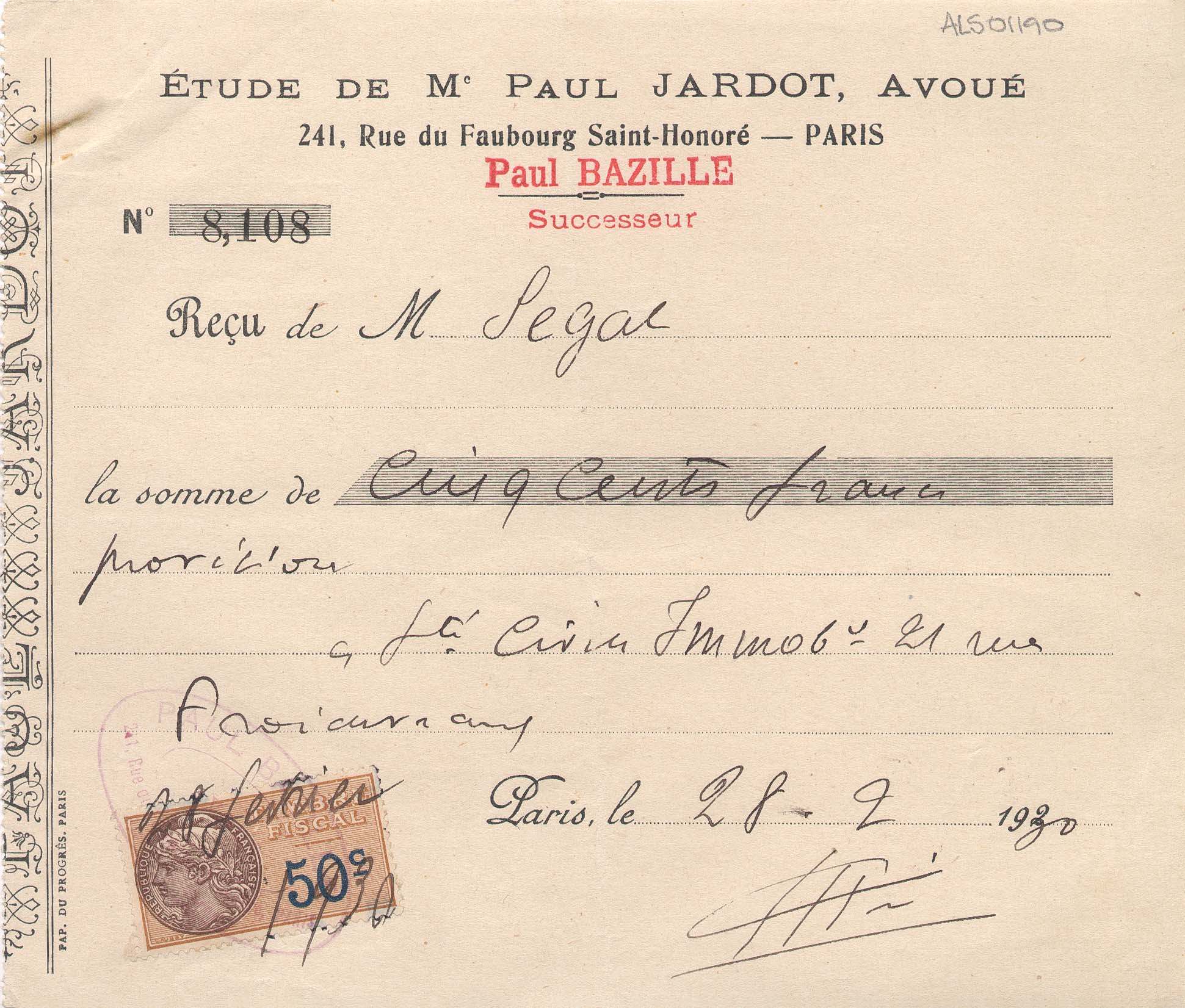 Recibo do escritório de advocacia de M. Paul Jardot, Paul Bazille, sucessor.