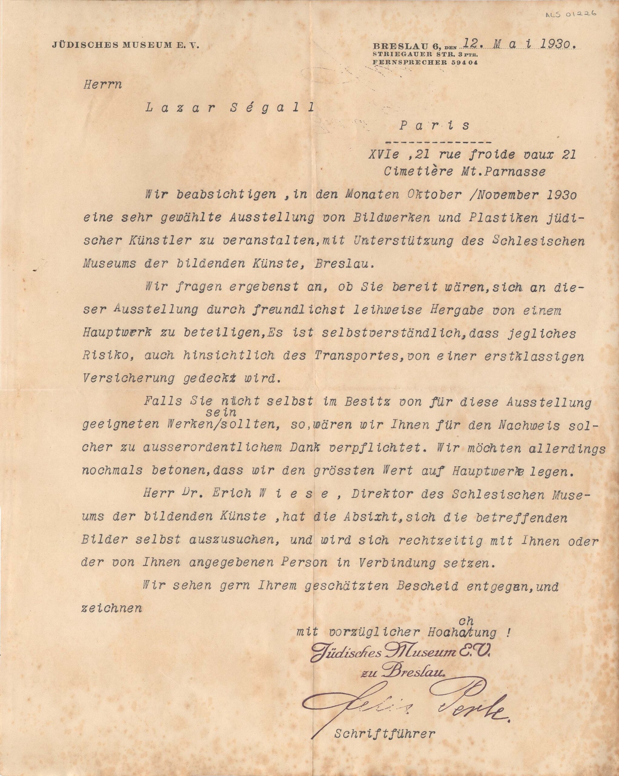 Folha timbrada: "Jüdisches Museum E. V."; assinado por Felix Perle, redator chefe