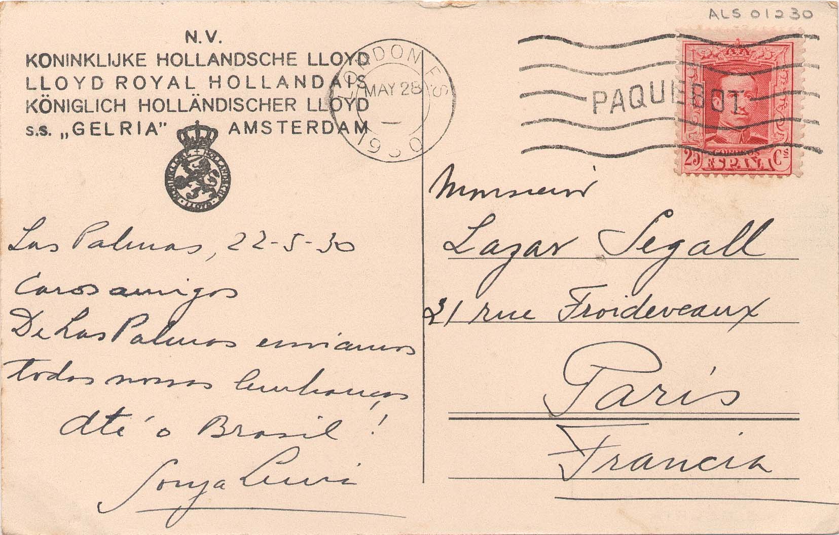 Pasta A-Z, letra L; frente do cartão: navio S.S. Gelria. Local: Las Palmas, Espanha Sonja Levi?