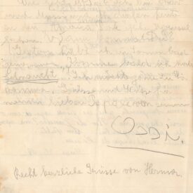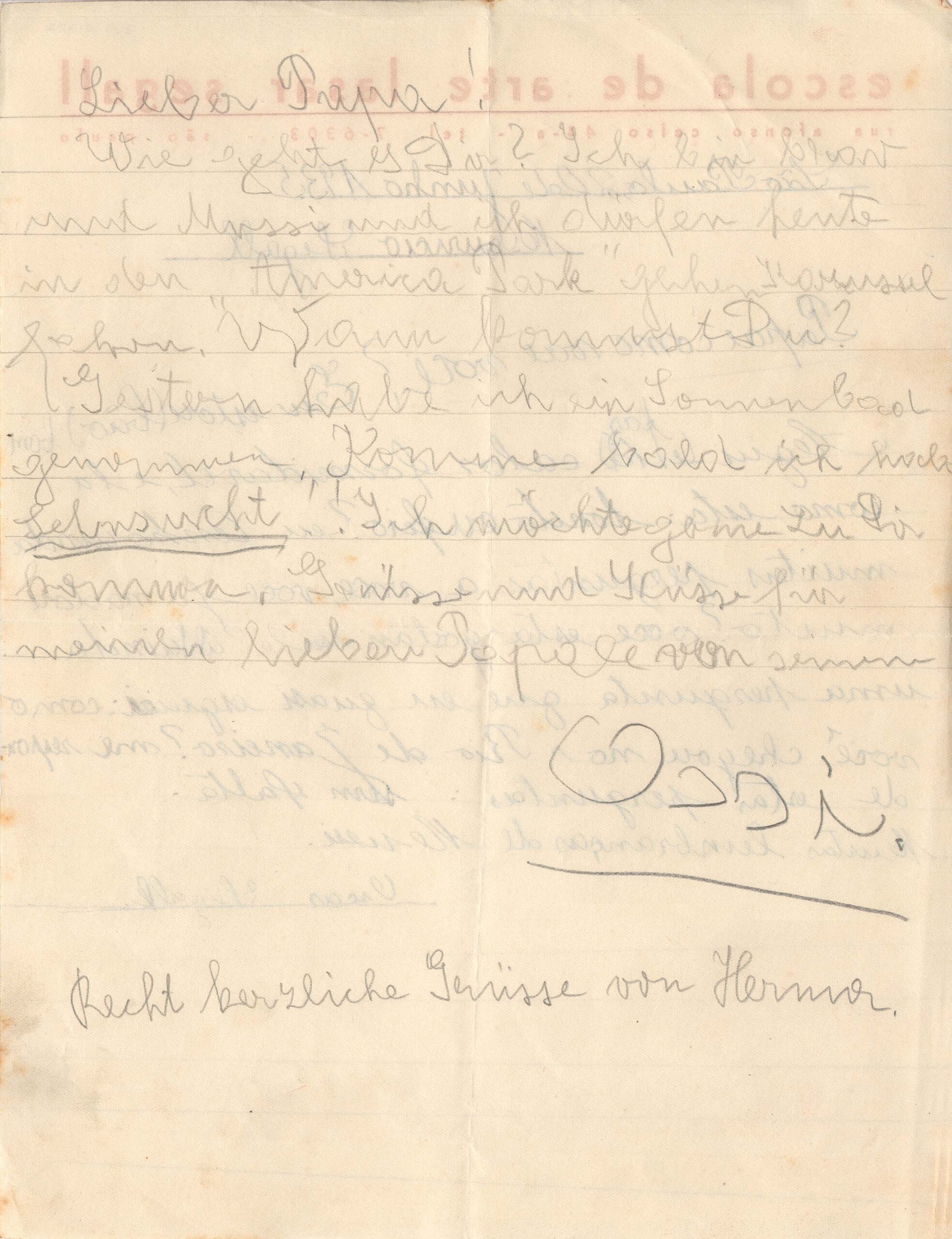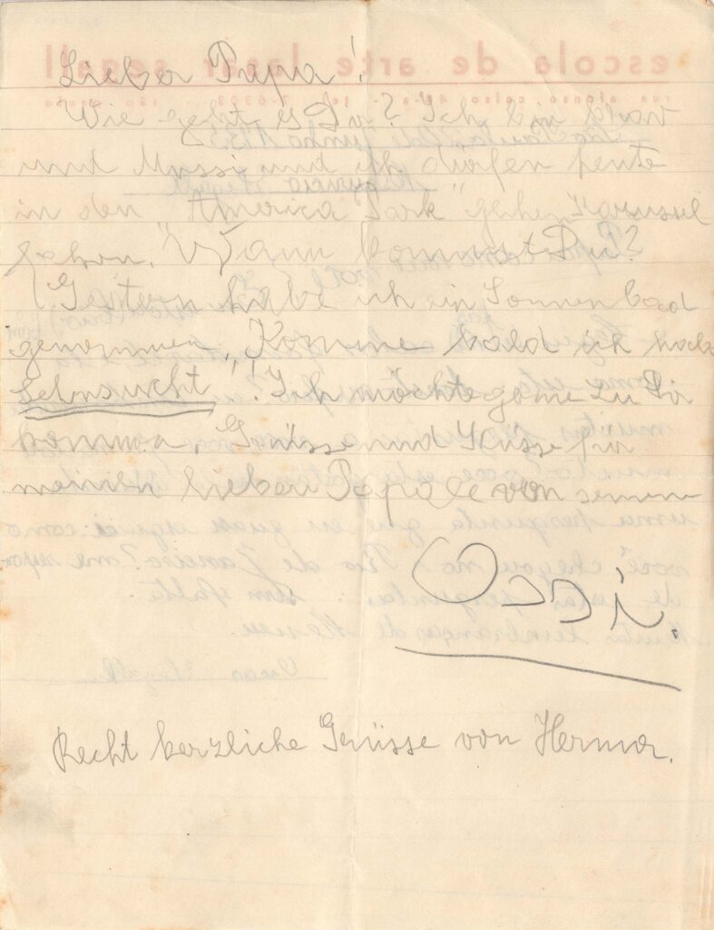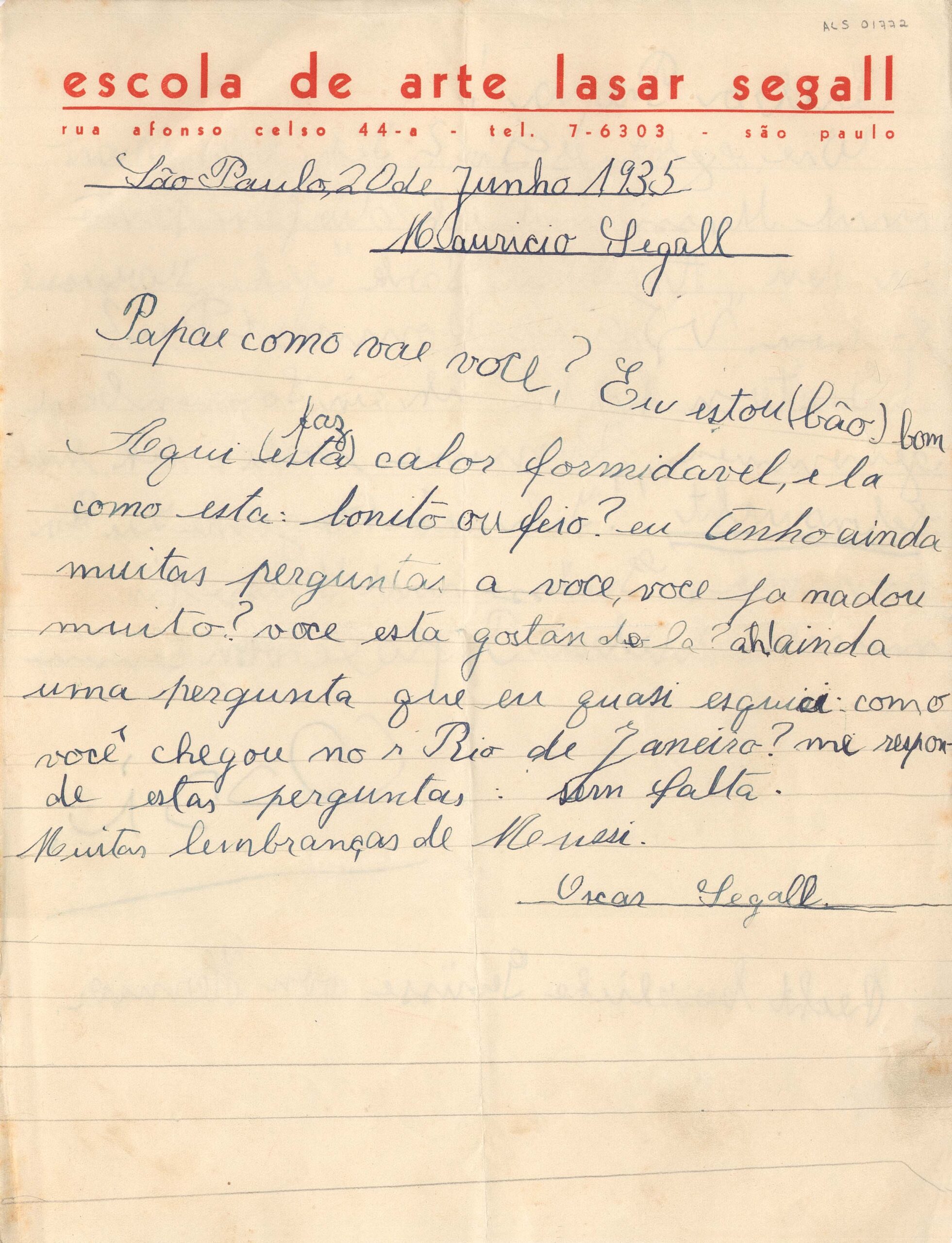 Diz que faz um "calor formidável" e pergunta como está lá: "bonito ou feio"?; faz várias perguntas, entre elas se Segall já nadou e como ele chegou ao Rio de Janeiro; no verso, a grafite, carta de seu irmão Oscar, em alemão, provavelmente feita com ajuda de Herma, que assina um PS