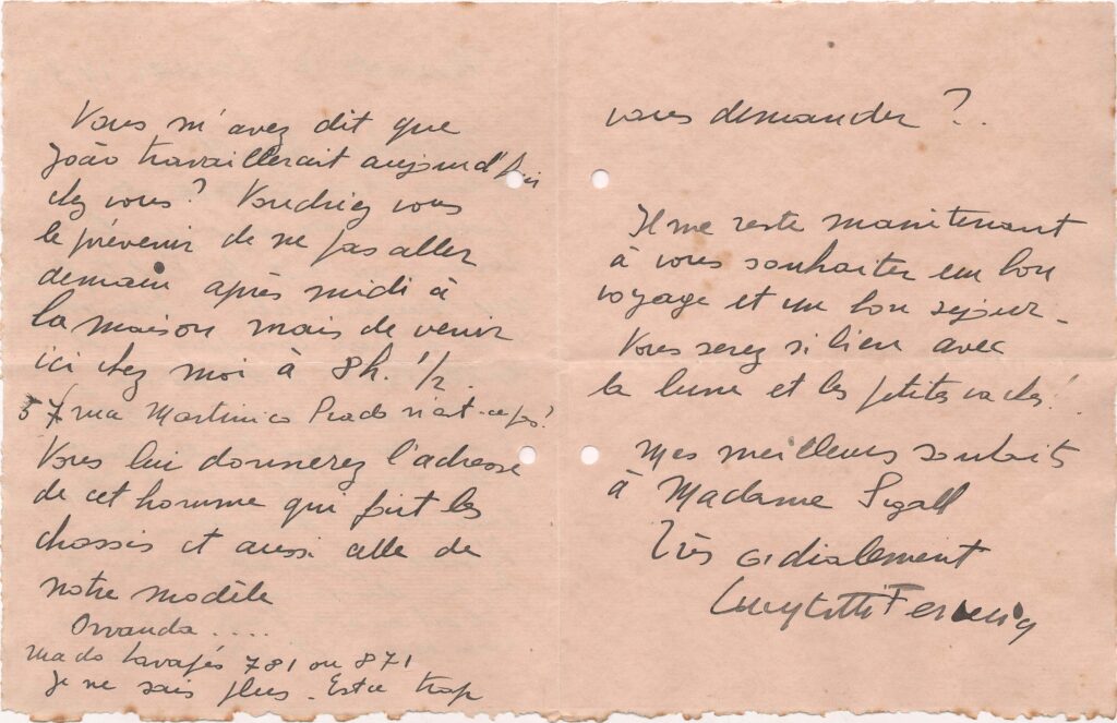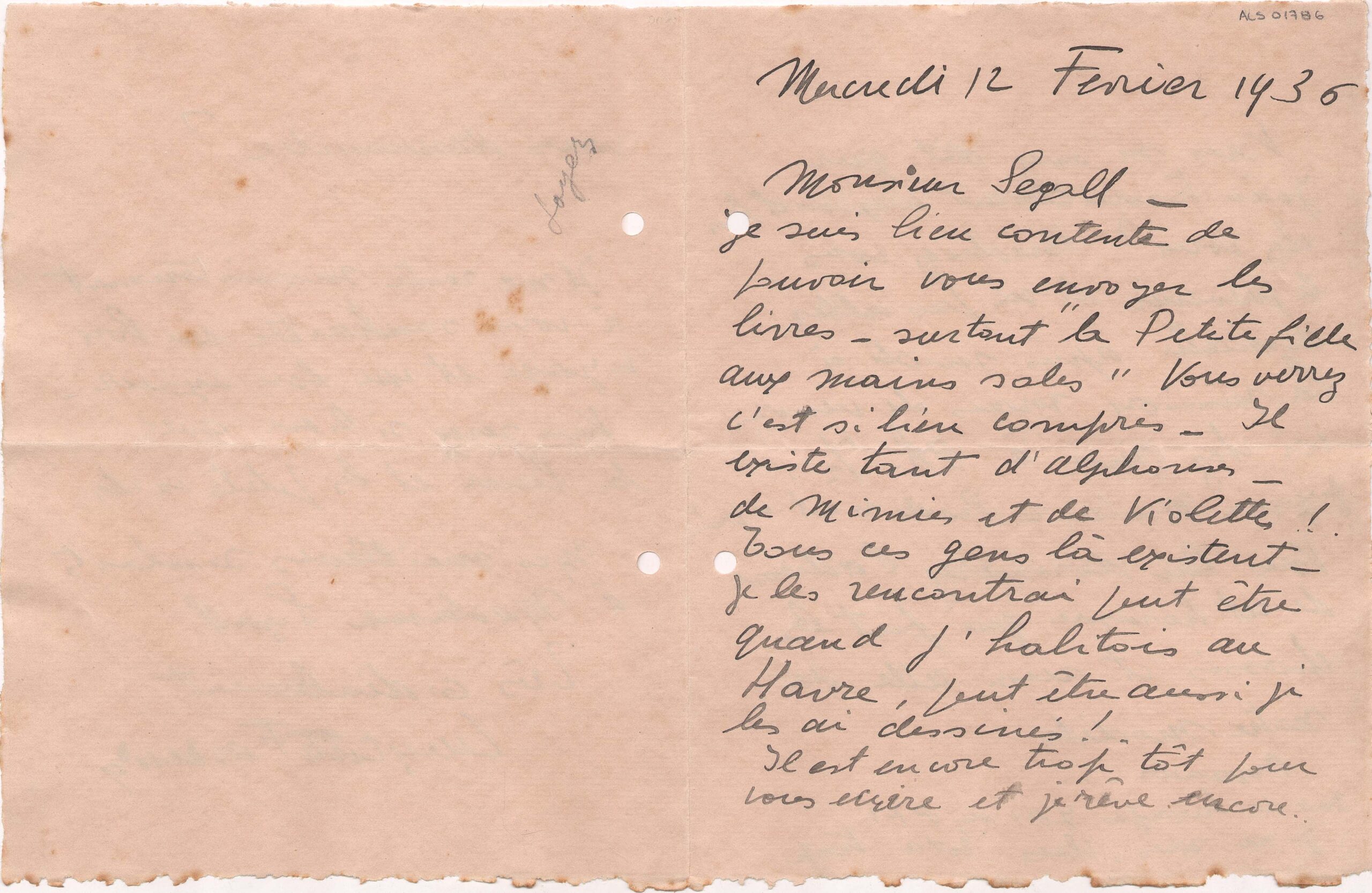 Envia livros a Lasar Segall; refere os personagens de "La petite fille aux mains sales"; fala que conheceu no Havre figuras semelhantes a esses personagens; pede que João vá a seu ateliê à Rua Martinico Prado 57; deseja boa viagem e estada junto "da lua e das pequenas vacas"