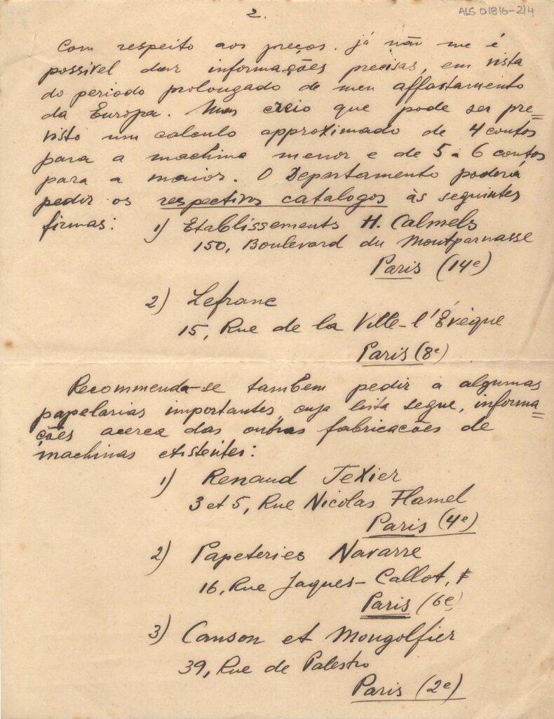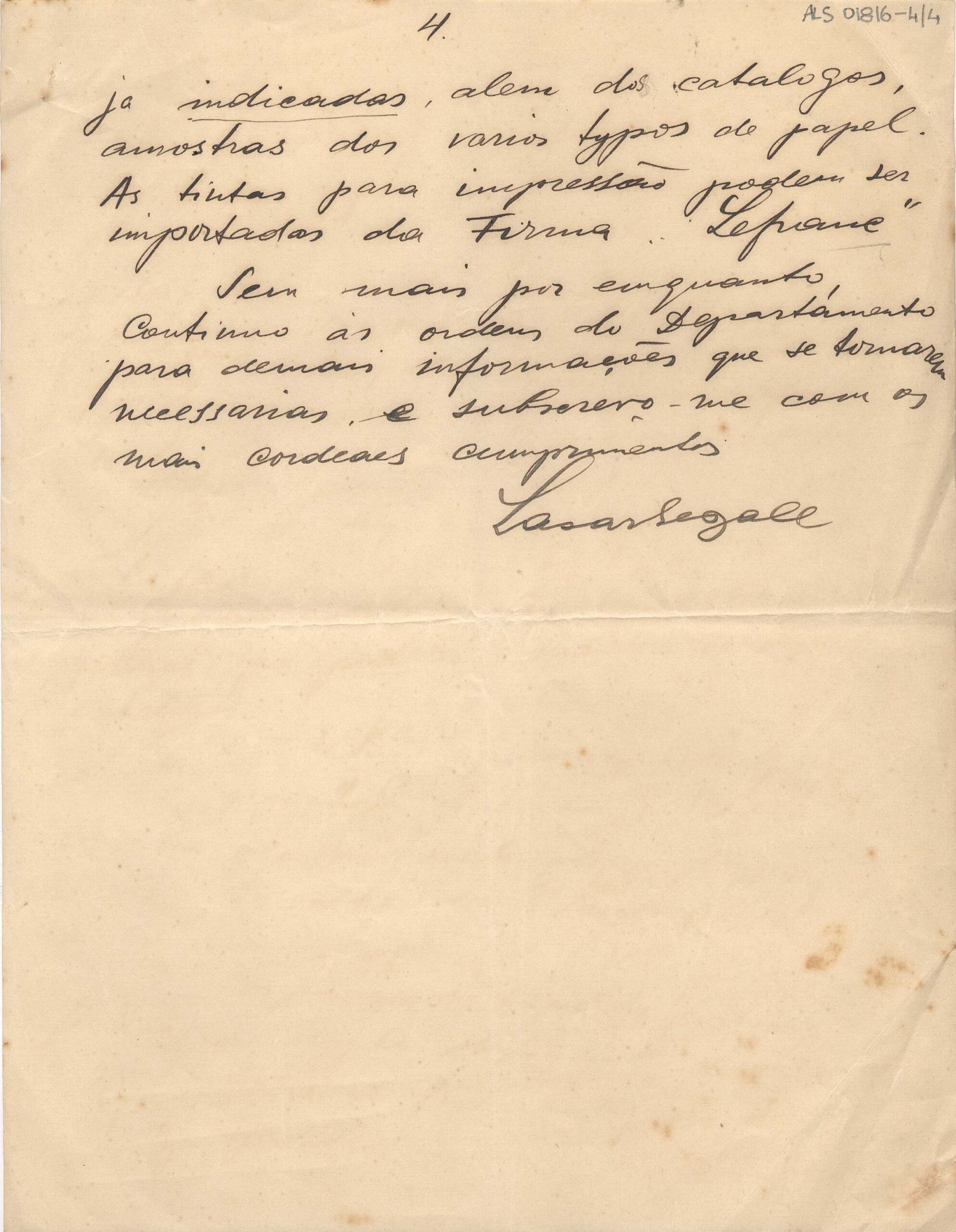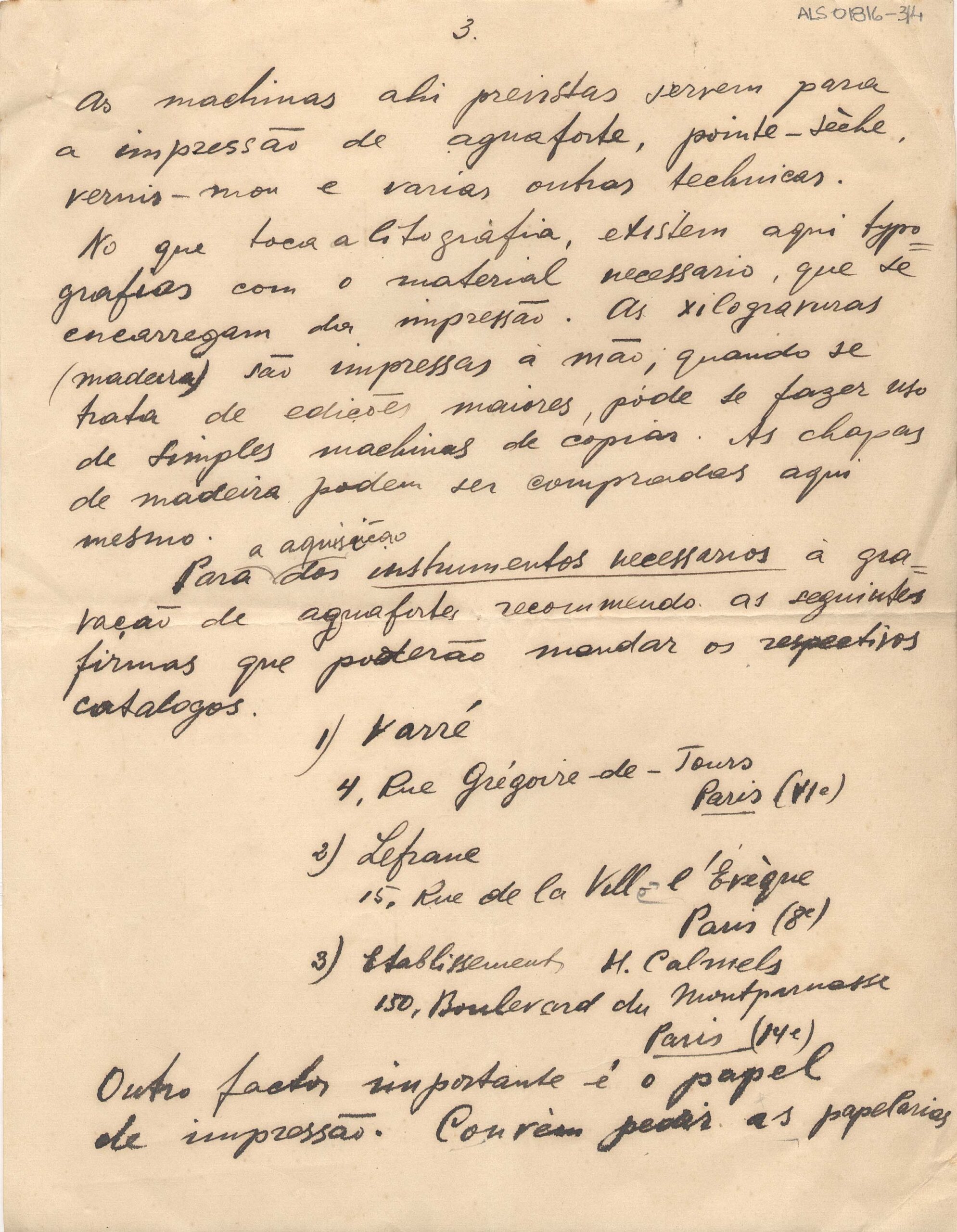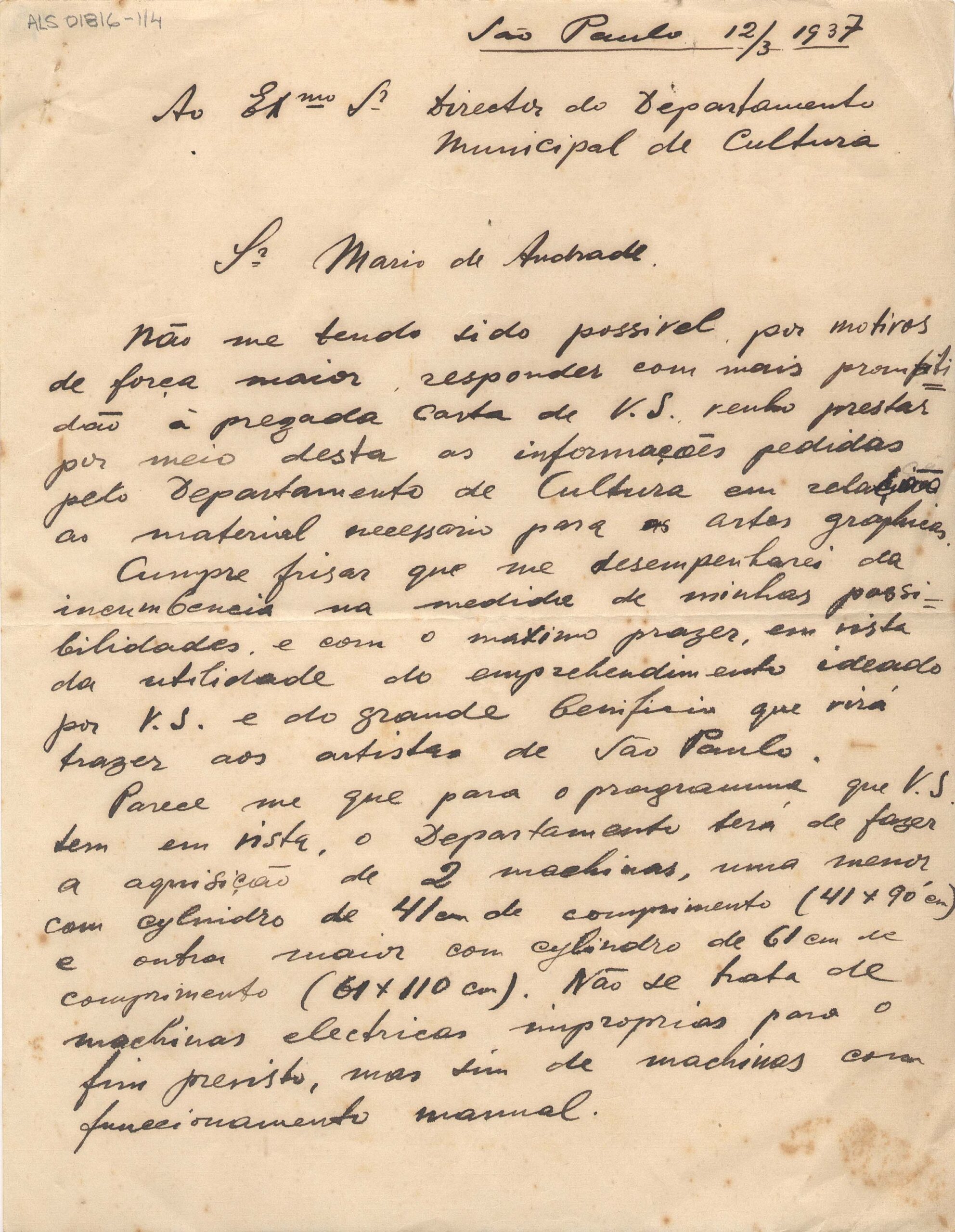 Segall responde à solicitação feita pelo Departamento de Cultura, fornecendo informações técnicas para aquisição de equipamento gráfico; duas prensas e material necessário para impressão de gravuras em várias técnicas