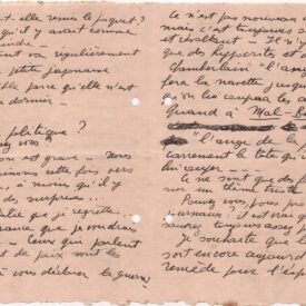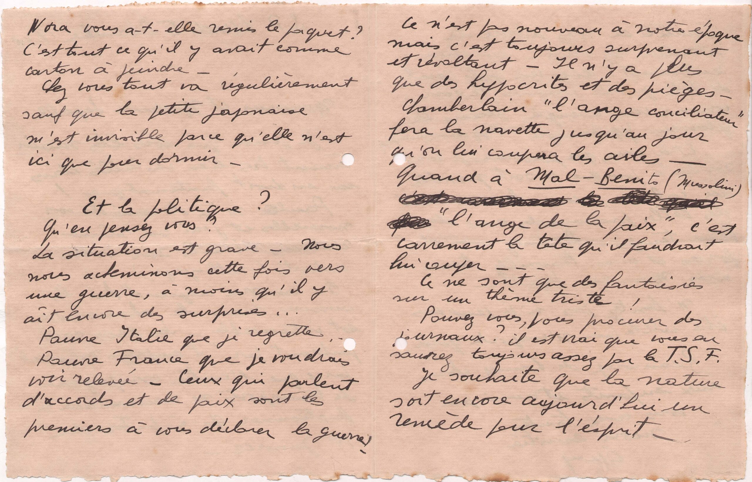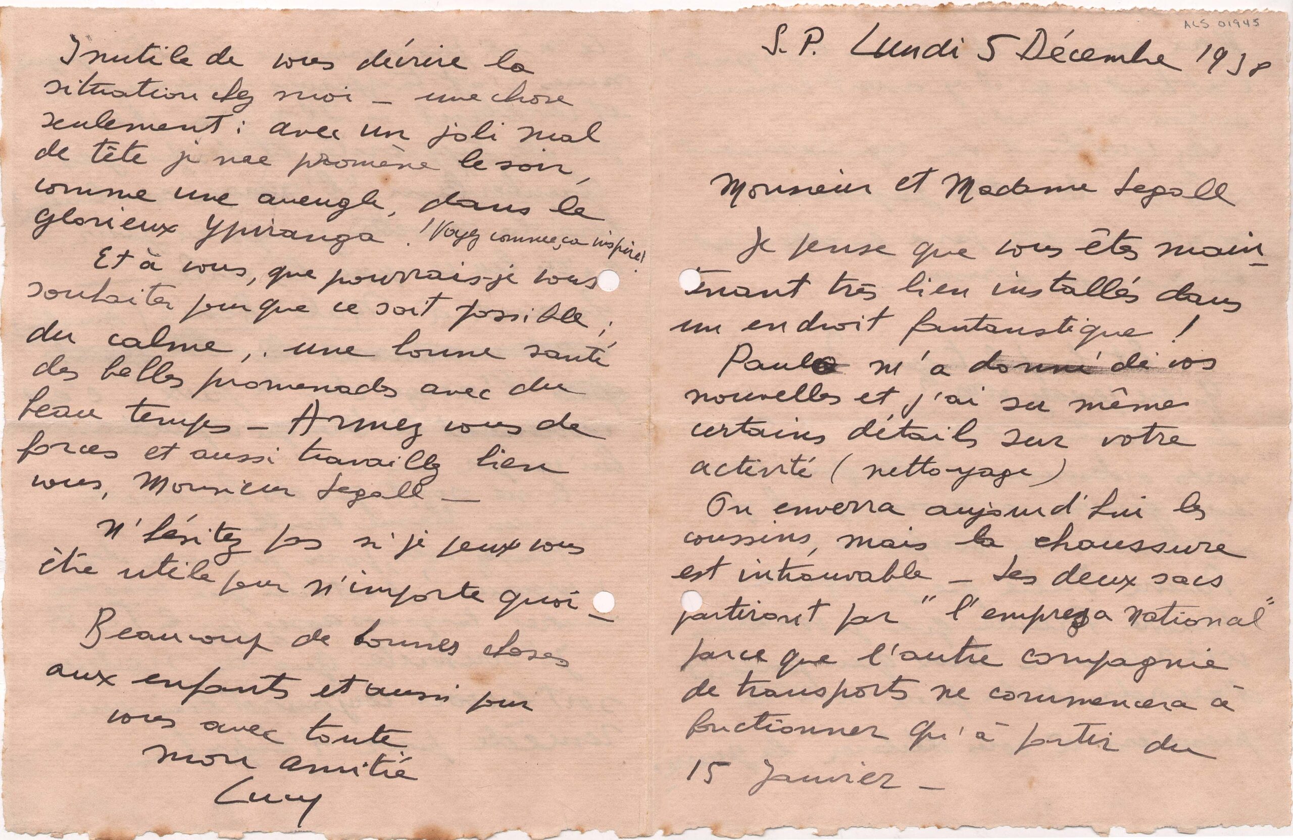 Lucy espera que o casal Segall esteja aproveitando a calma do campo, em Campos do Jordão; acredita que a natureza ainda seja um remédio para o espírito; pergunta se eles têm visto jornais; fala da guerra que se aproxima e cita Benito Mussolini e Arthur Neville Chamberlain; diz que passeia à noite pelo "maravilhoso Ipiranga"; deseja que Segall junte forças e trabalhe bem