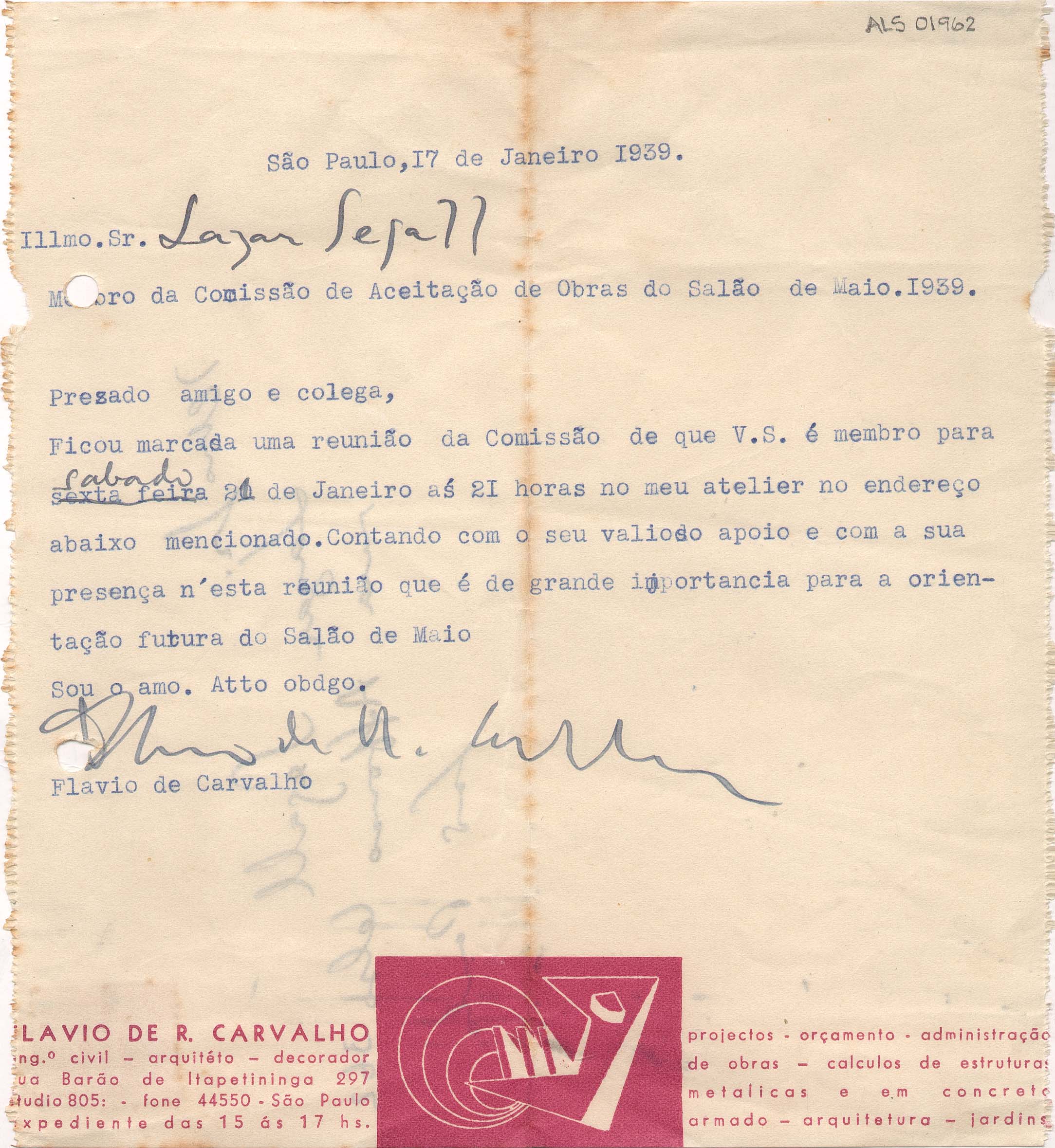 Papel timbrado: "Flavio de R. Carvalho"; assinatura e anotações manuscritas em tinta azul