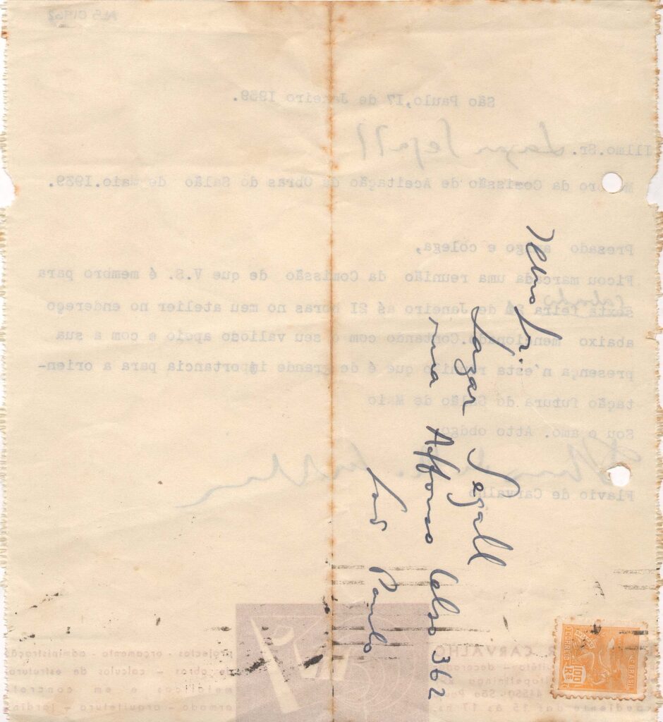 Informa que ficou marcada uma reunião da Comissão de organização do Salão de Maio, à qual Lasar Segall pertence