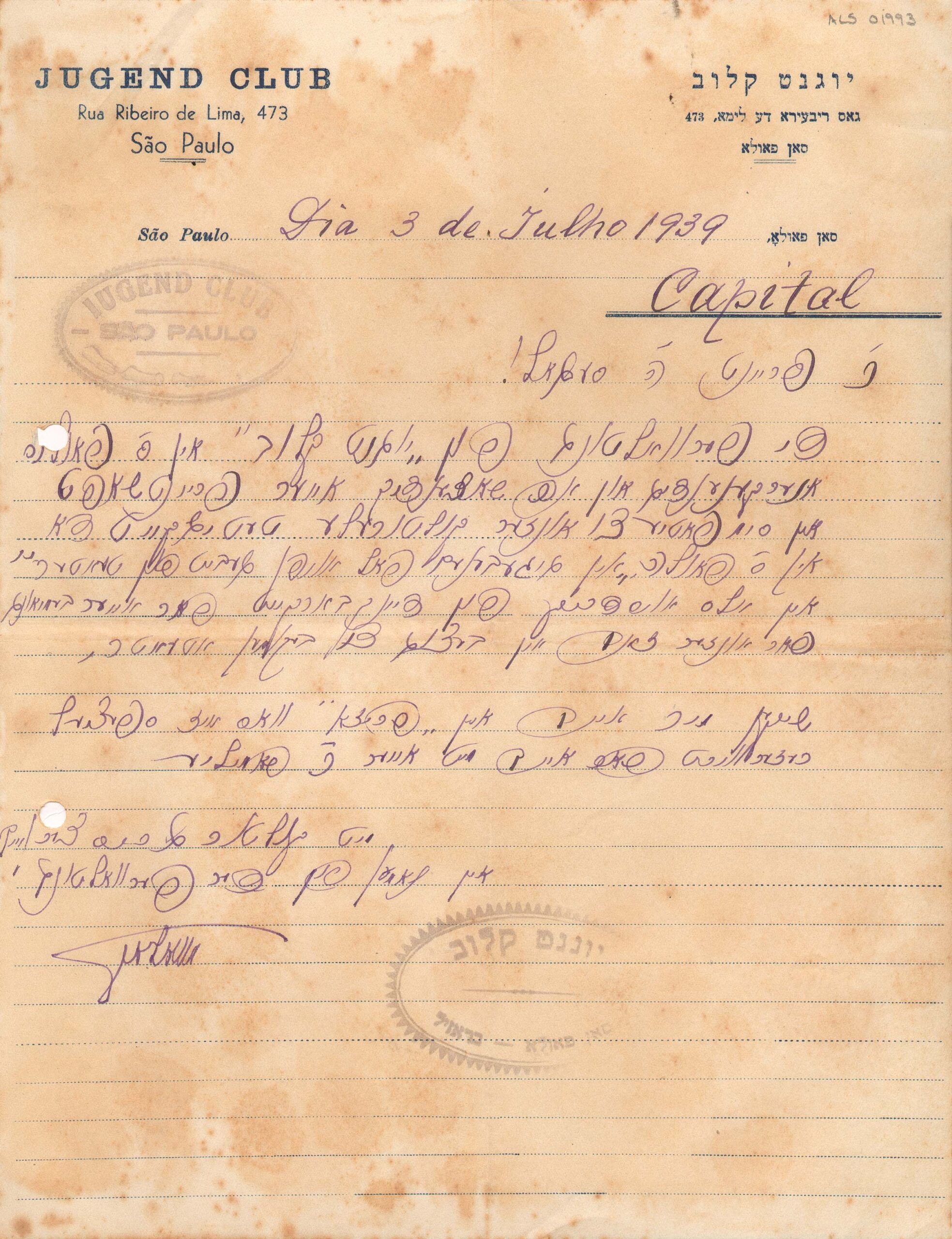 Papel timbrado: "Jugend Club Rua Ribeiro de Lima, 473 São Paulo"