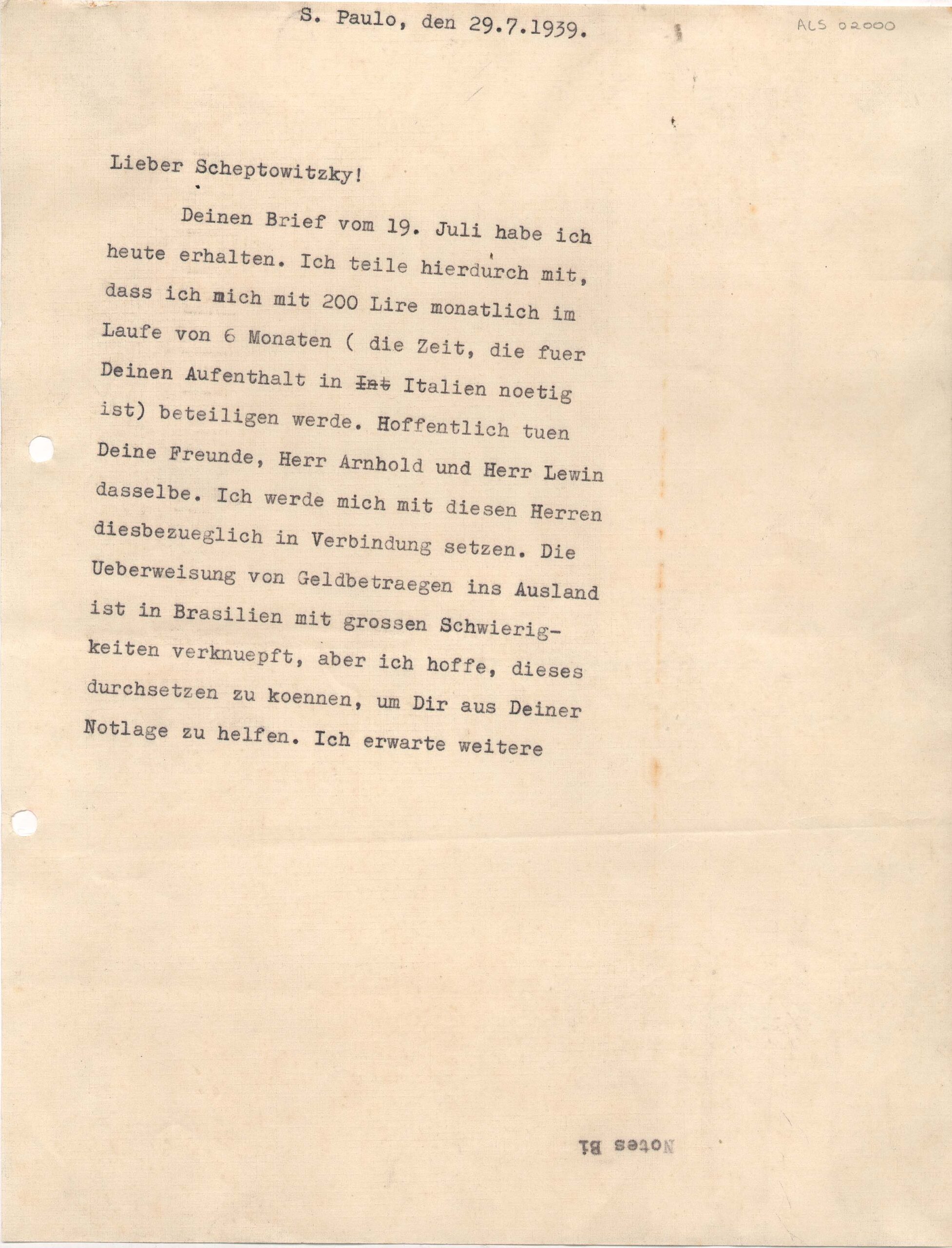 Acusa recebimento da carta de 19 de julho; informa que vai enviar 200 liras por seis meses, associando-se a Arnhold e Lewin, amigos de Scheptowitzky, nesse auxílio