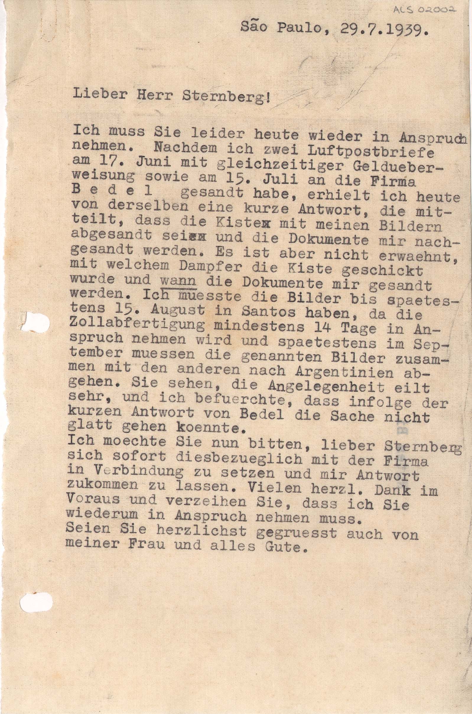 Trata do retorno das caixas com seus quadros, de Paris para São Paulo; diz que as caixas devem estar em Santos no máximo até 15 de agosto
