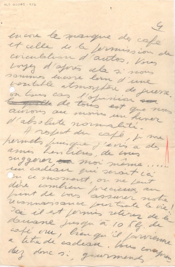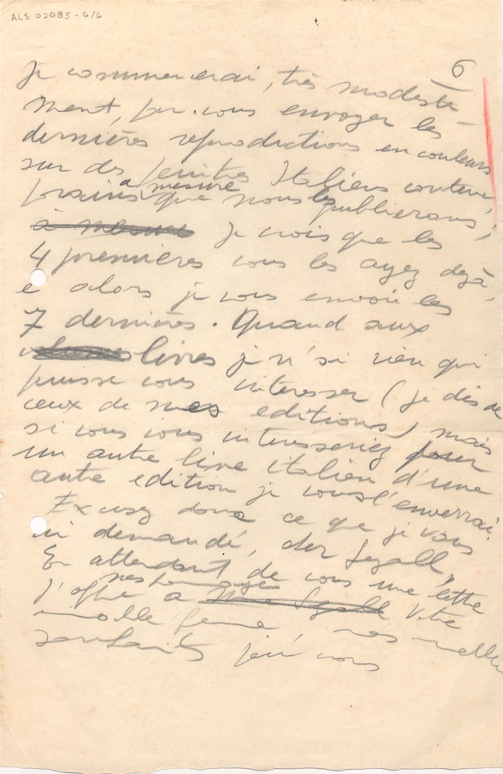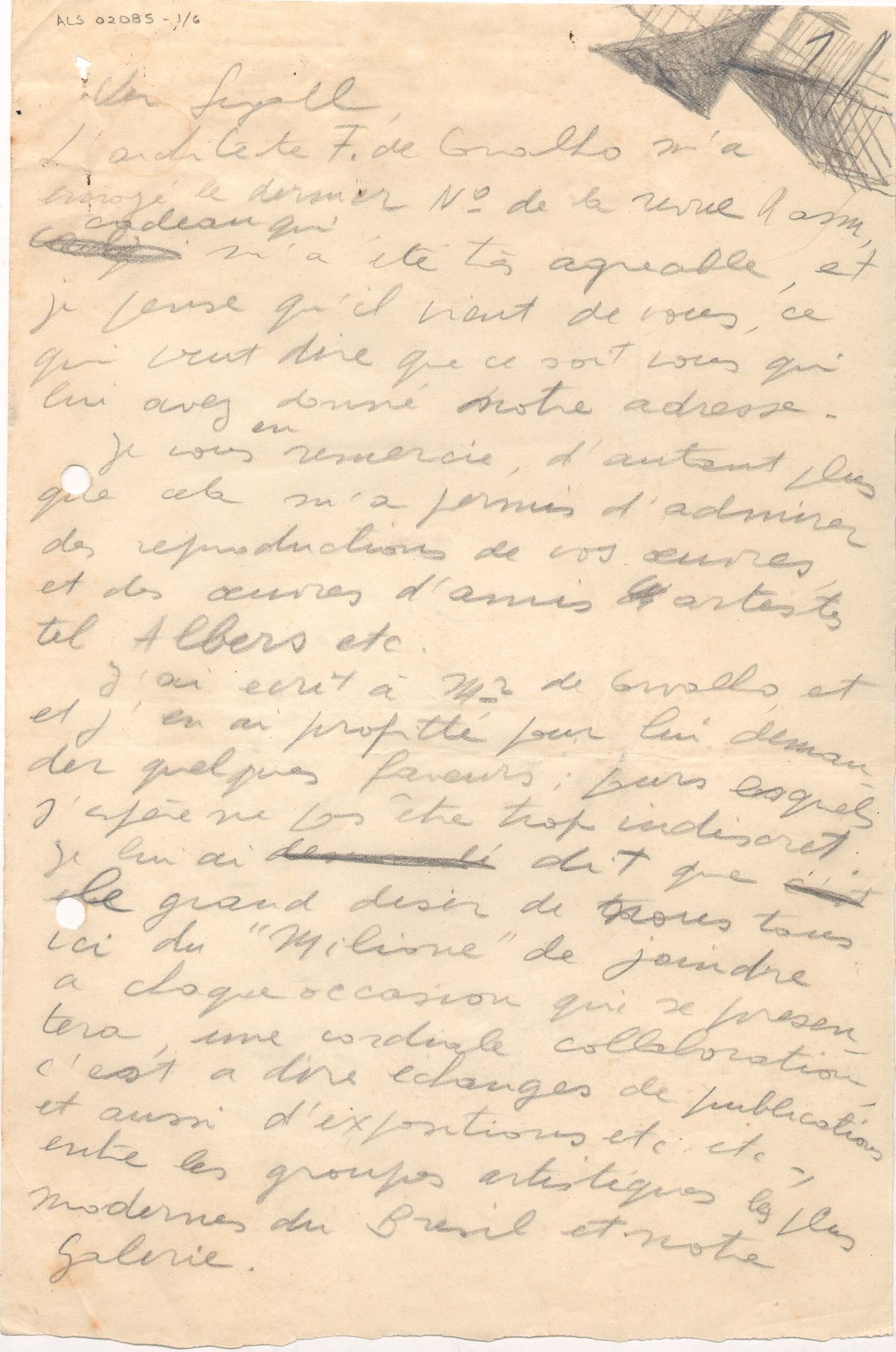 Desenho a grafite no canto superior direito da primeira folha; traços a lápis de cor destacam trechos nas págs. 2, 4 e 6 / Item Relacionado: Versão em francês do documento ALS 02084