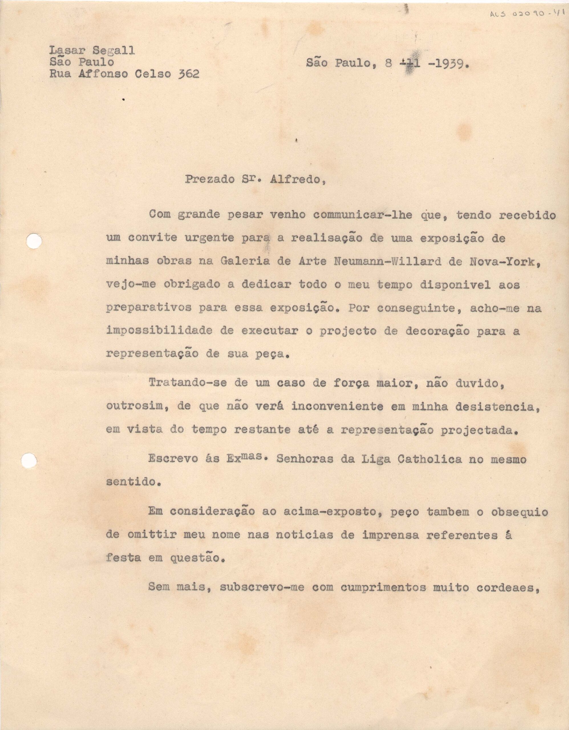 Desculpa-se por não poder realizar o projeto de decoração para a peça de Alfredo Mesquita; está totalmente dedicado à organização de sua exposição na Galeria Neumann-Willard, de Nova York; informa que envia correspondência no mesmo sentido à Liga das senhoras católicas