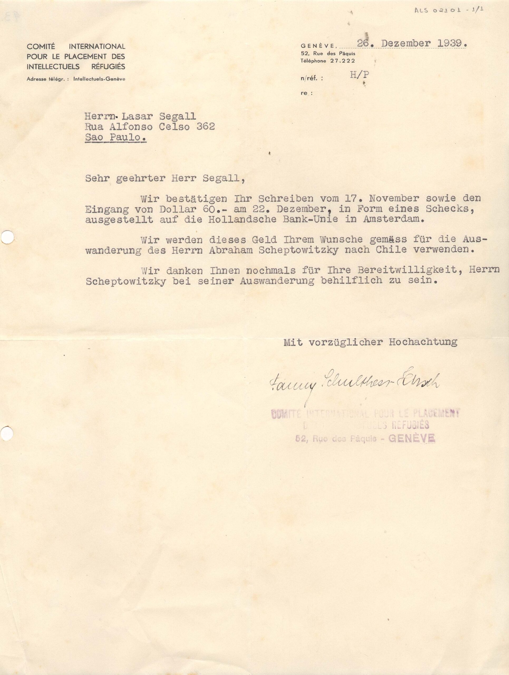 O Comité acusa recebimento da carta de Segall de 17 de novembro, bem como a entrada de 60 dólares, em forma de cheque, depositado em banco de Amsterdã; afirmam que utilizarão o dinheiro para a emigração de Abraham Scheptowitsky para o Chile