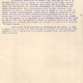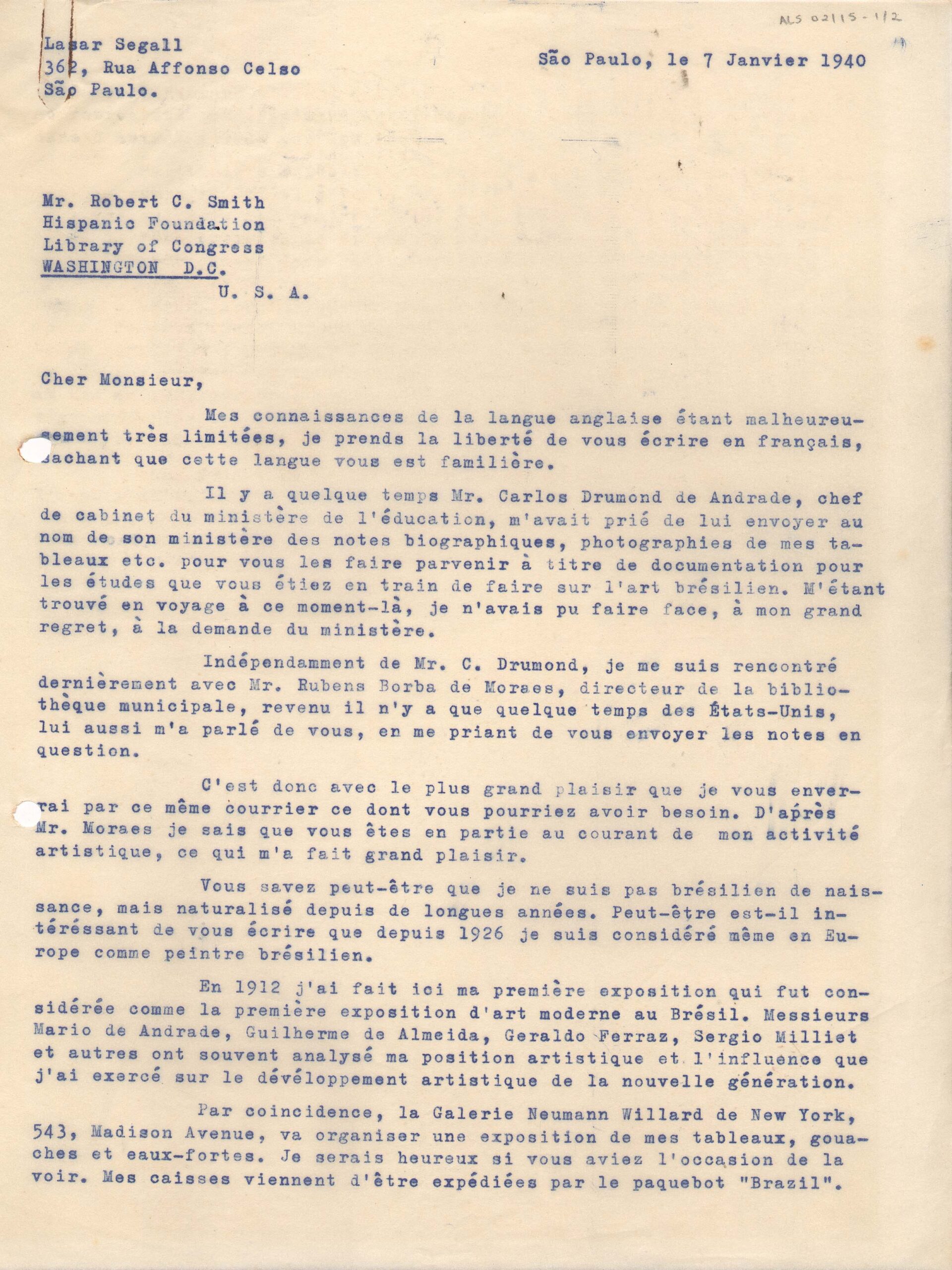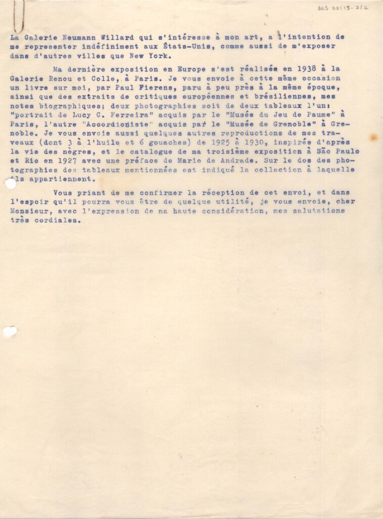 Desculpa-se por escrever em francês, por não dominar o inglês; envia as notas biográficas e fotografias solicitadas por Carlos Drummond de Andrade, do gabinete do Ministério da Educação, para alimentar seus estudos sobre a arte brasileira; diz que apesar de não nascido no Brasil é considerado mesmo na Europa um artista brasileiro; que realizou em 1912 [sic] as primeiras exposições de arte moderna no Brasil e que vários críticos brasileiros analisaram sua influência junto às novas gerações; informa sobre sua próxima exposição na Galerie Neumann Willard de Nova York; envia o livro de Paul Fierens, lançado à época de sua última exposição na França, em 1938, e o catálogo da exposição de 1927, em São Paulo