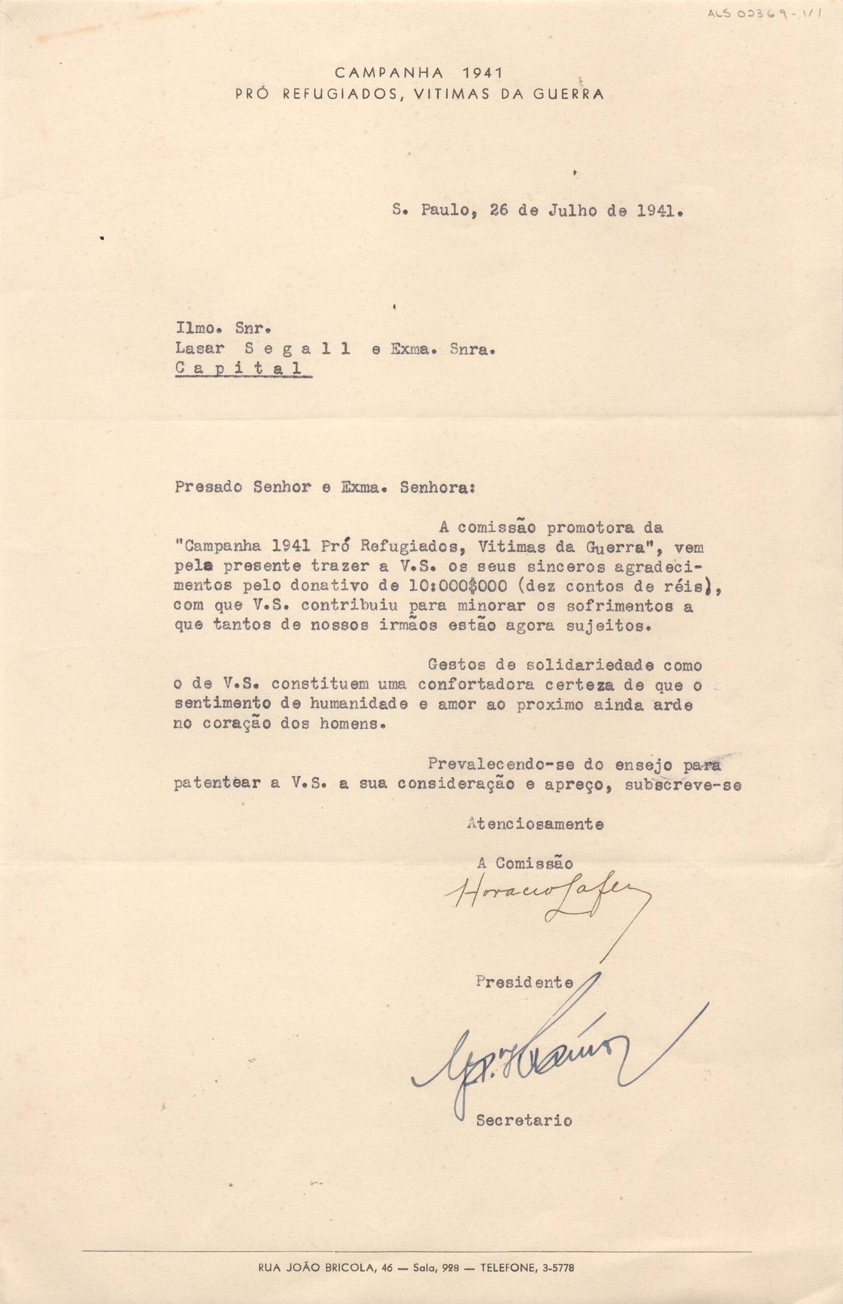 Agradecimento da comissão promotora da Campanha 1941 pró refugiados, vítimas da guerra, pelo donativo de dez contos de réis