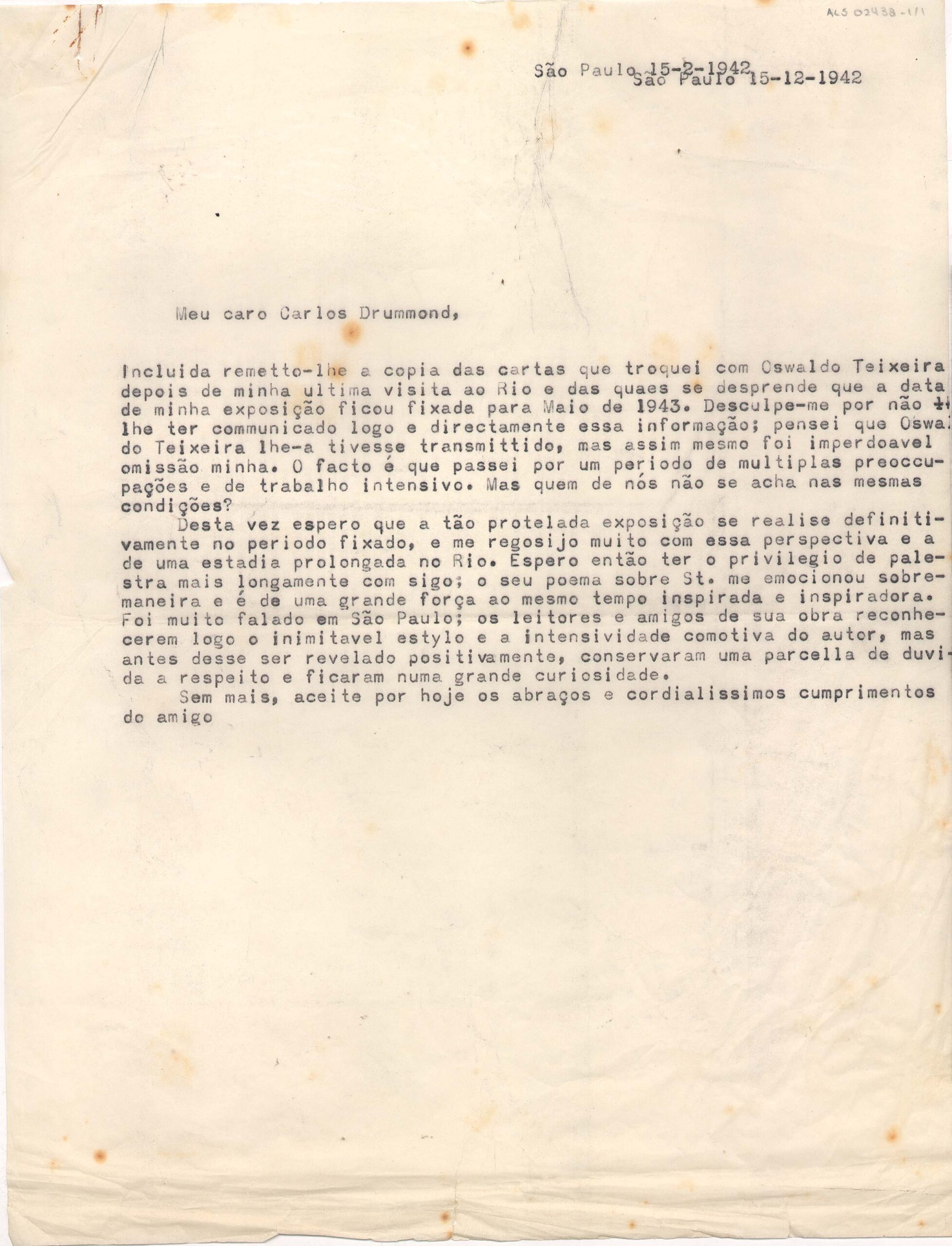 Segall anexa cópia das cartas trocadas com Oswaldo Teixeira, com a marcaçaão da data de sua retrospectiva para maio de 1943; espera que a data seja confirmada, sem mais adiamentos; diz que se emocionou com o novo poema de Drummond