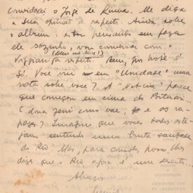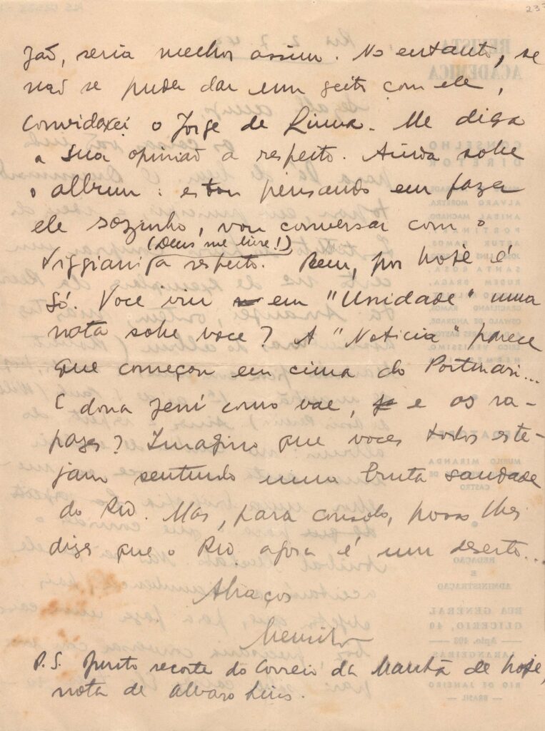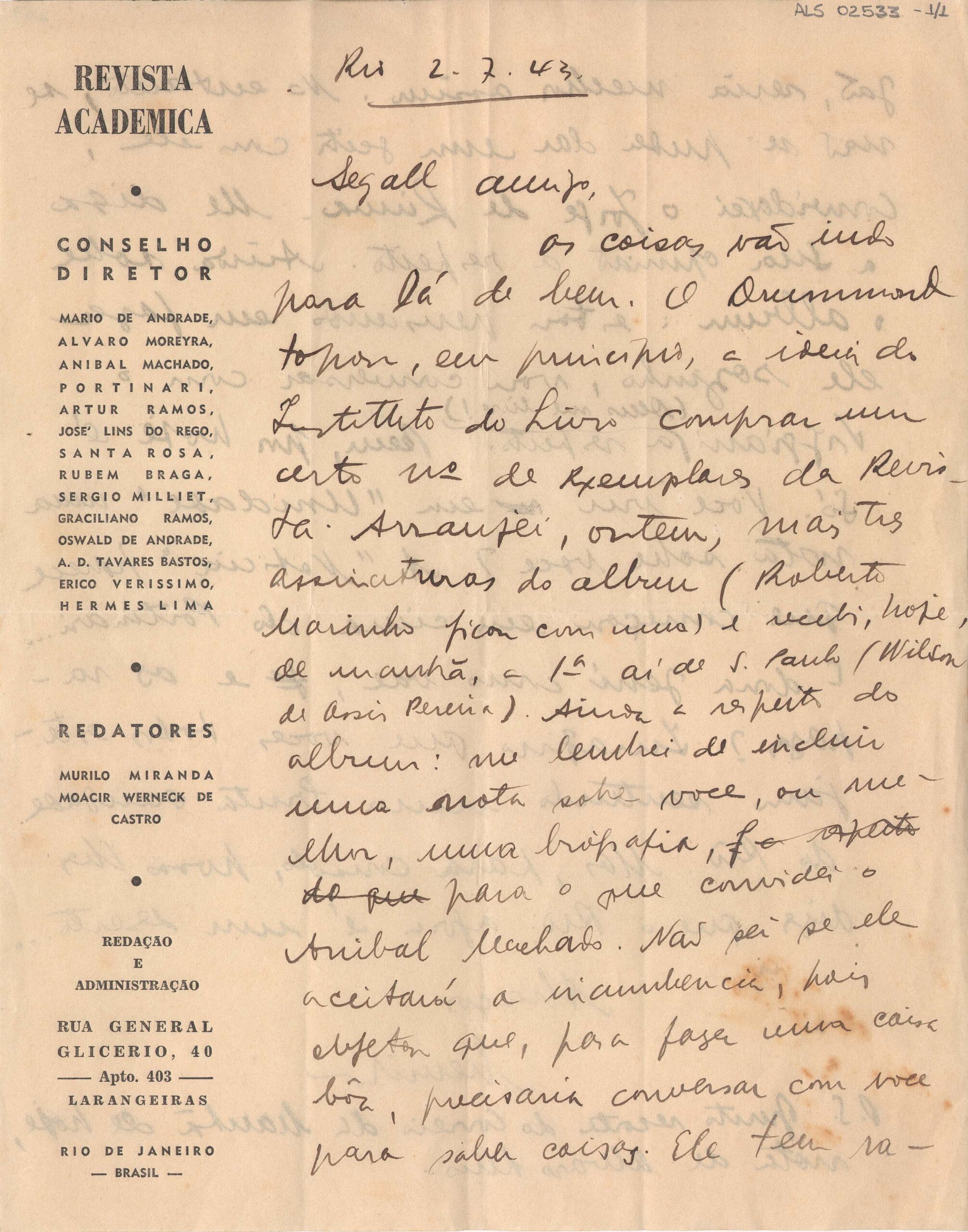 Informa que as coisas "vão indo para lá de bem"; o Drummond concordou em o Instituto do Livro comprar um certo número de exemplares da Revista Acadêmica; tem mais três assinaturas do álbum; resolveu incluir no álbum uma nota biográfica sobre Segall e convidou o Anibal Machado para isso, que quer entrevistar Segall; se não der certo com ele, convidará o Jorge de Lima; pergunta se o casal Segall sente falta do Rio que "agora é um deserto"; envia recorte do Correio da Manhã com uma nota de Álvaro Lins