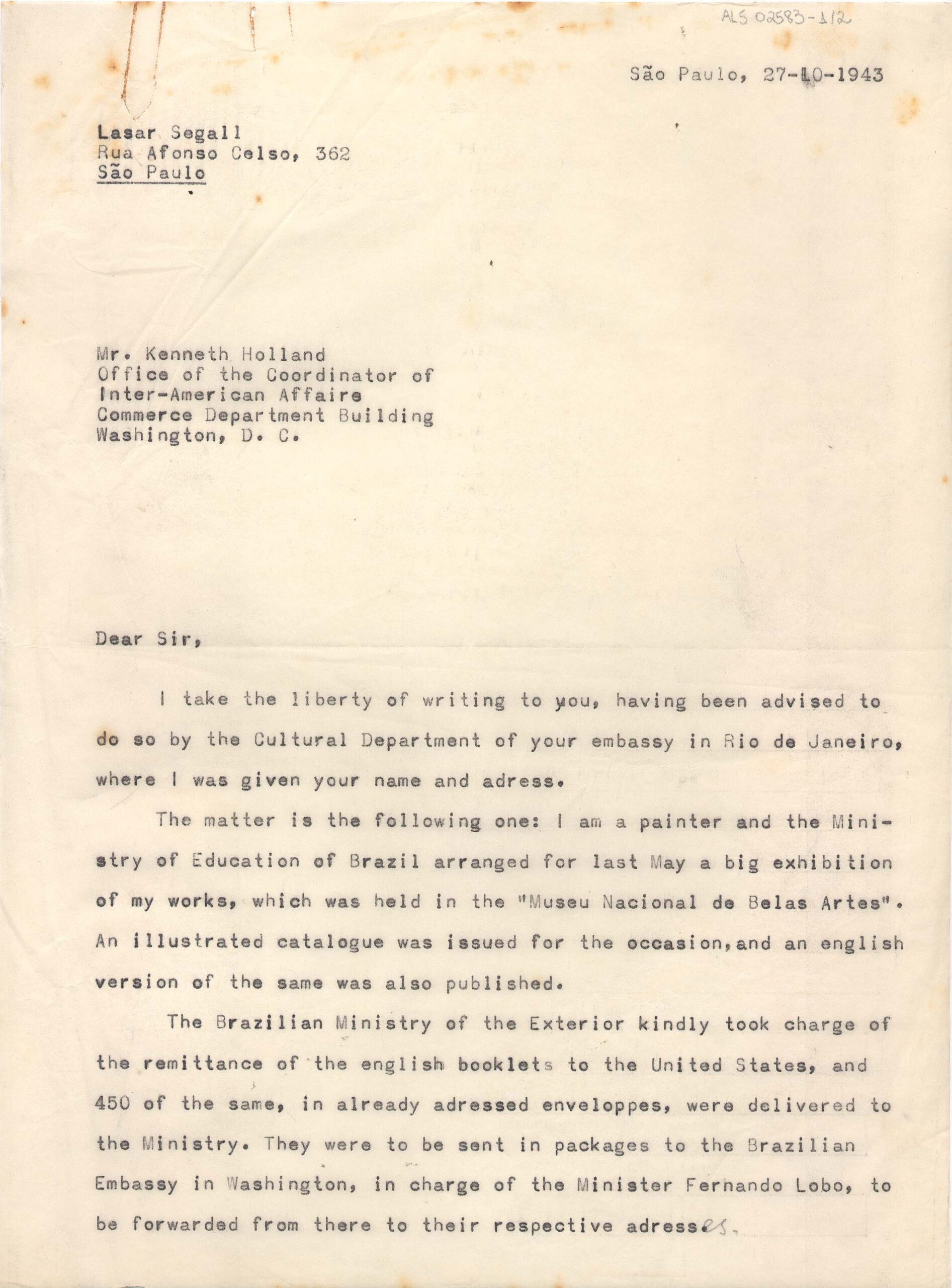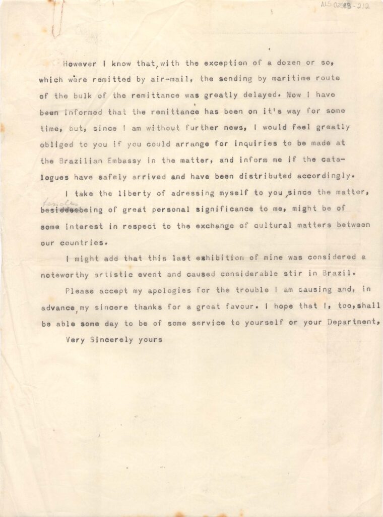Envio aos Estados Unidos de 450 catálogos da exposição de Segall no Museu Nacional de Belas Arte, Rio de Janeiro