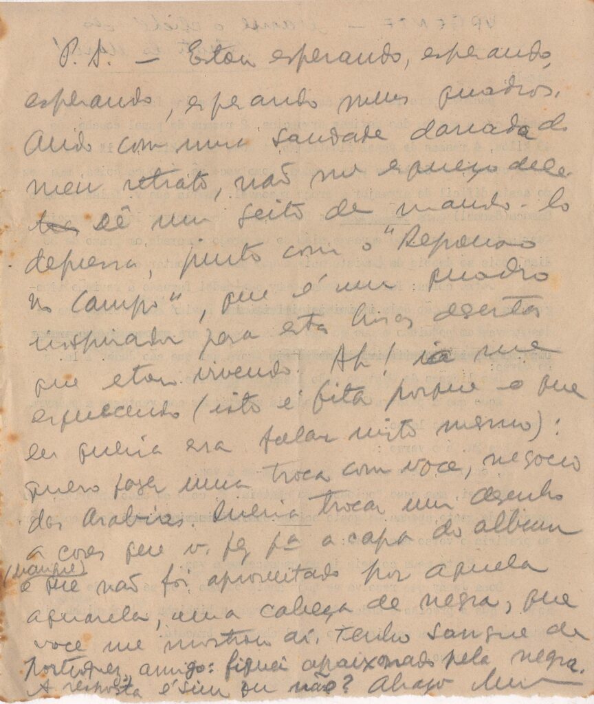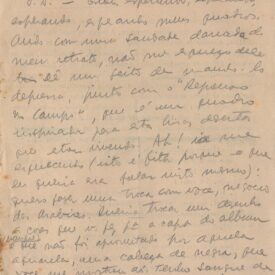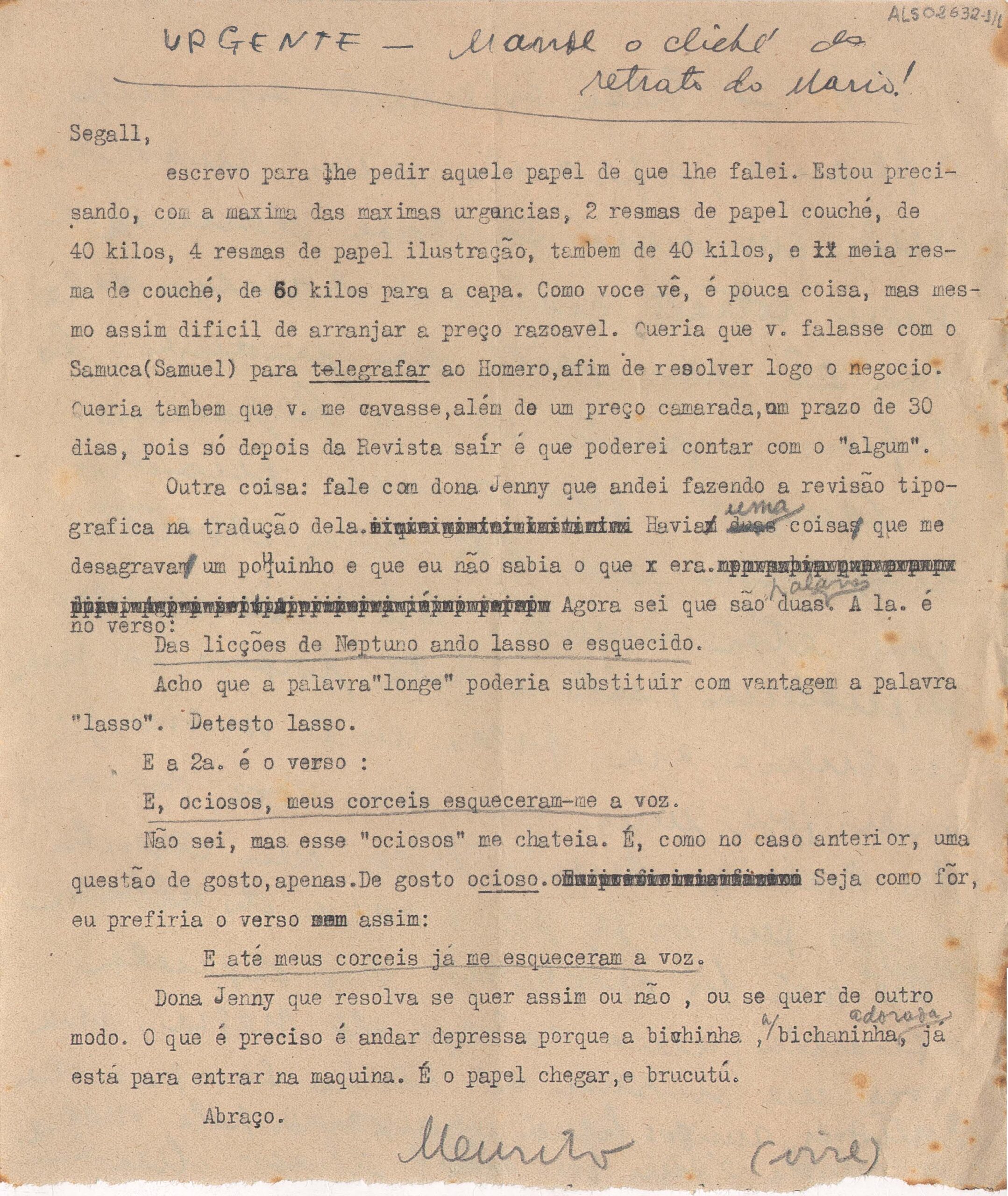 Pedido de envio do papel para o álbum Mangue; pedido para que Samuca [Samuel Wainer] resolva a questão com Homero ; revisão da tradução de Jenny K. Segall; pedido de envio urgente do clichê do retrato do Mário de Andrade; pede seus quadros de volta, inclusive o retrato de Murilo feito por Segall; propõe troca de desenho a cores por aquarela de cabeça de negra