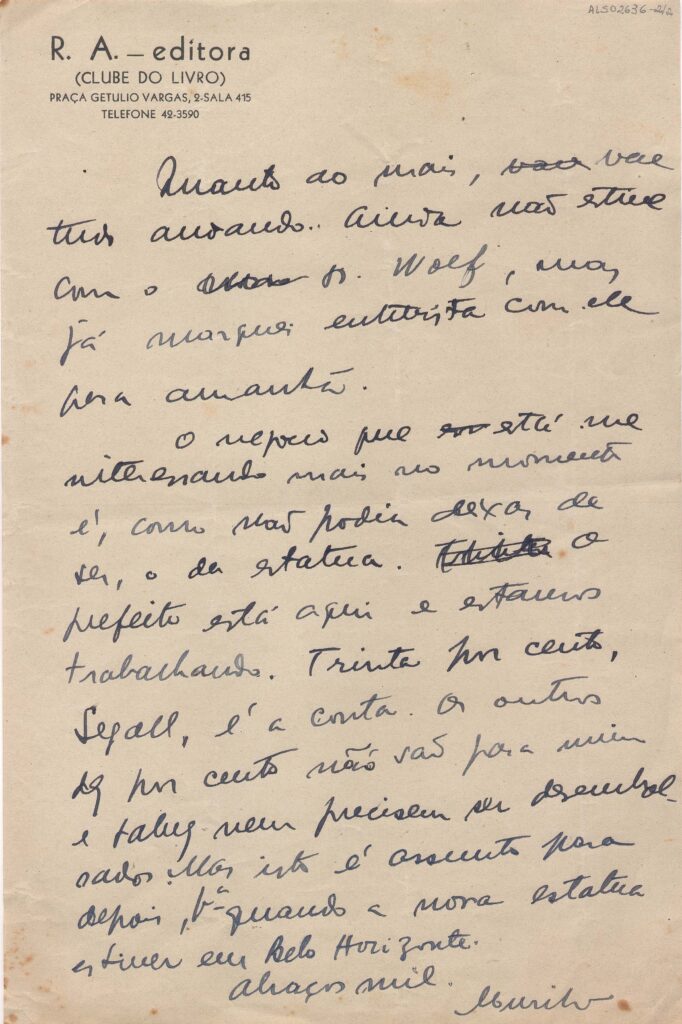 Papel timbrado "R.A. - editora (Clube do Livro) - Praça Getúlio Vargas, 2 - sala 415 - telefone: 42-3590"