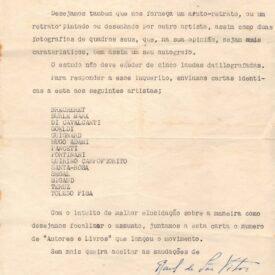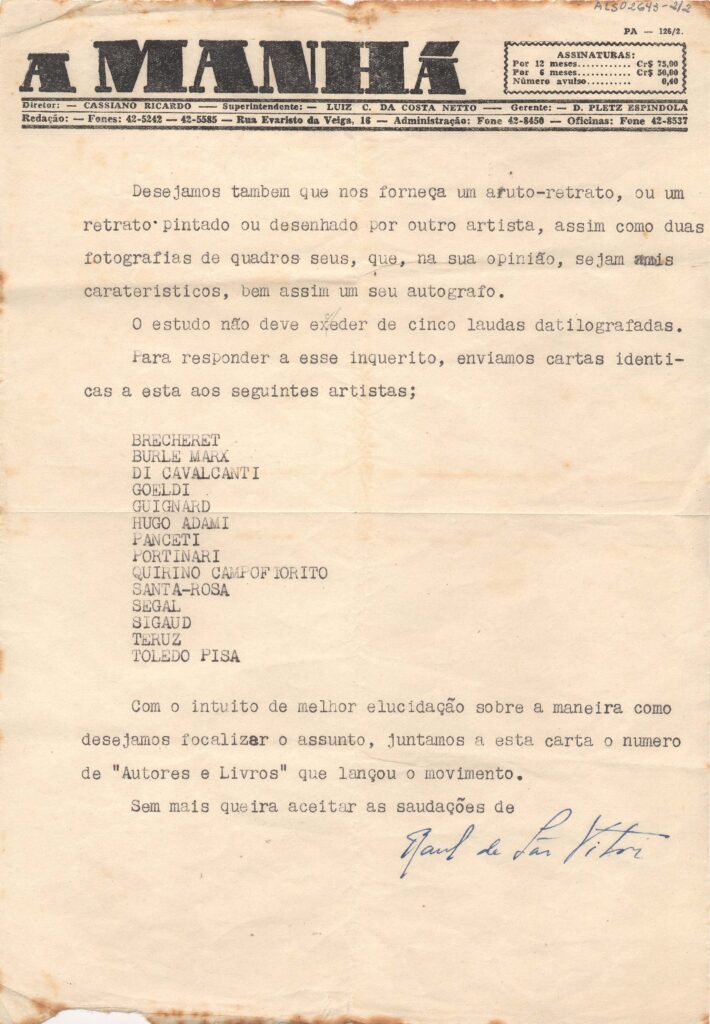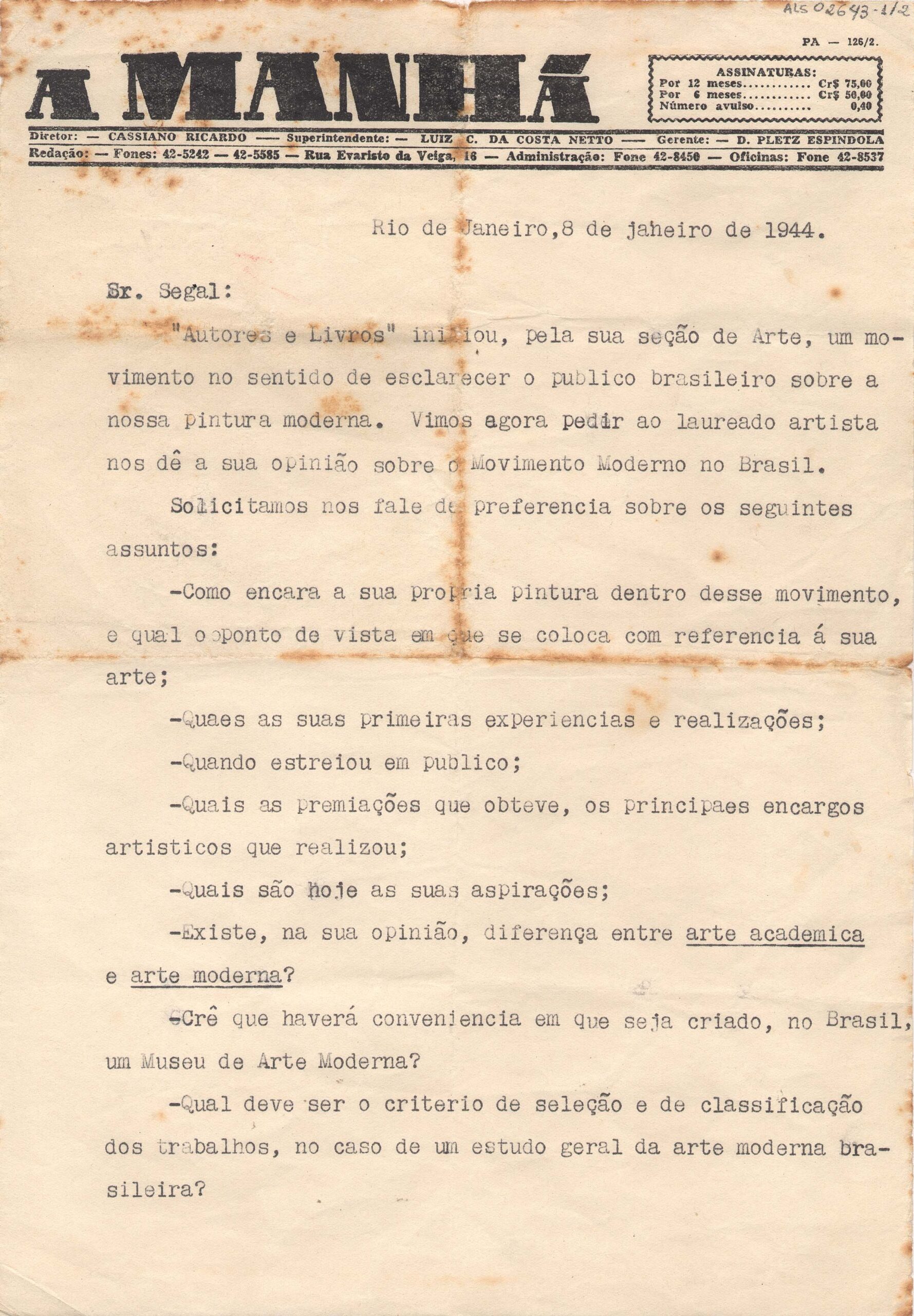 Informa que "Autores e livros" iniciou um movimento de esclarecimento do público sobre a pintura moderna brasileira; envia uma série de questões a serem respondidas por Segall, inclusive sobre a pertinência de criação de um Museu de Arte Moderna; solicita um texto sobre suas obras e carreira artística; pede sua opinião sobre o Movimento Moderno no Brasil; pedido de um retrato ou autorretrato de Segall, duas fotografias de trabalhos e um autógrafo