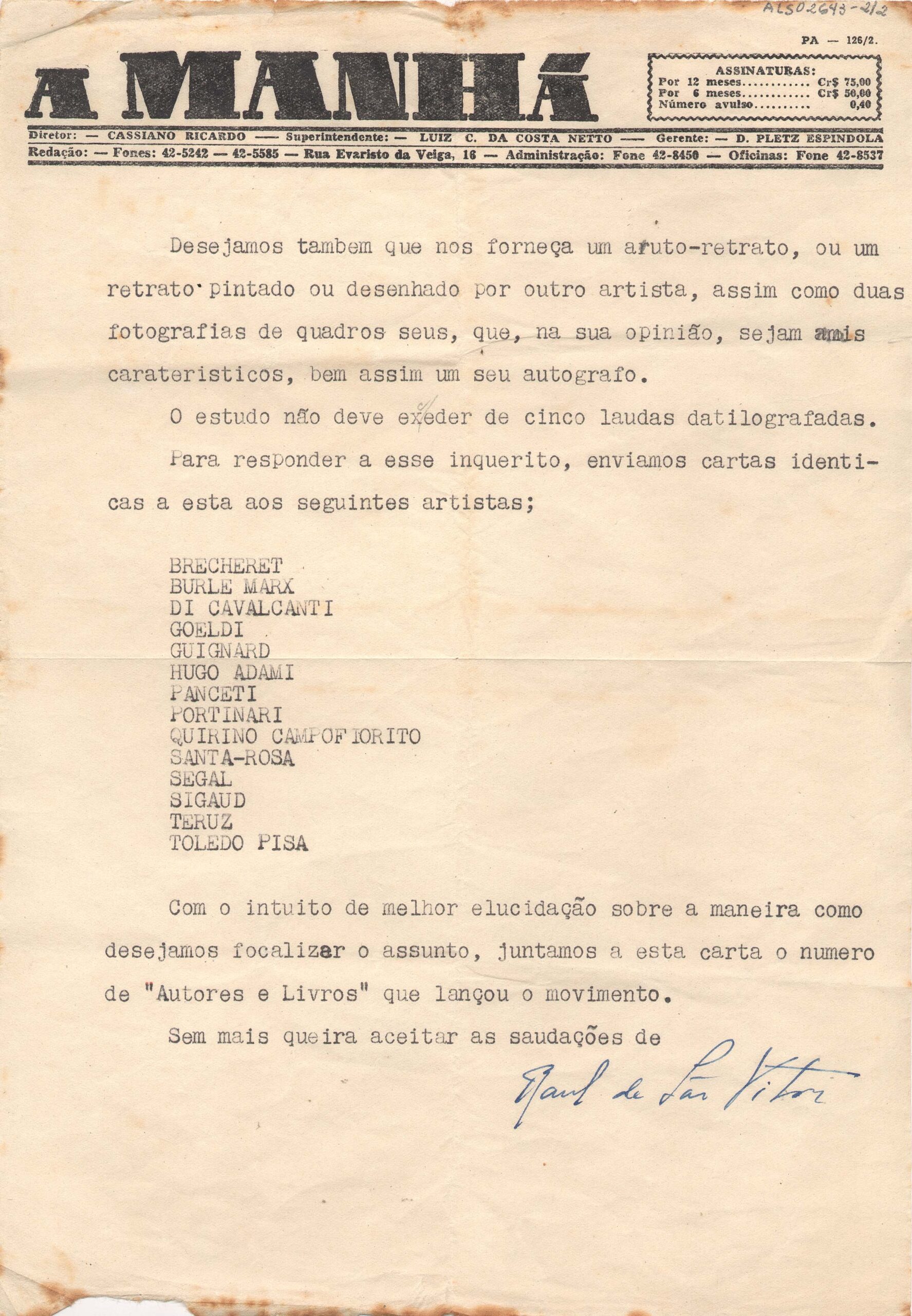 Papel timbrado: "A Manhã"; assinatura manuscrita a tinta azul na pág. 2, c. i. d.; correções a lápis pág 2