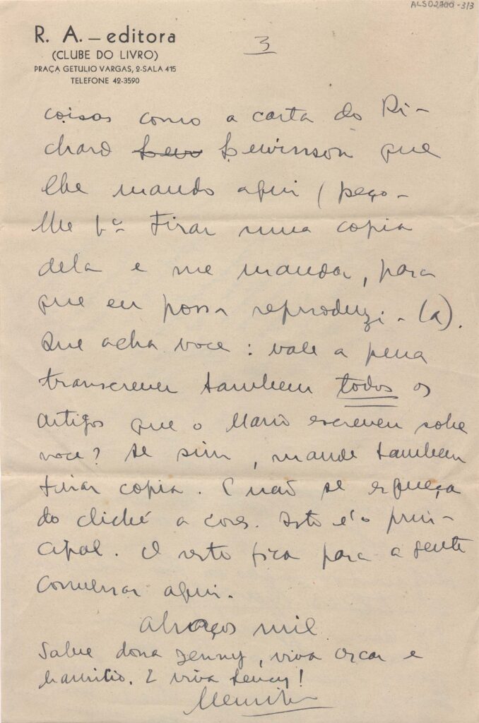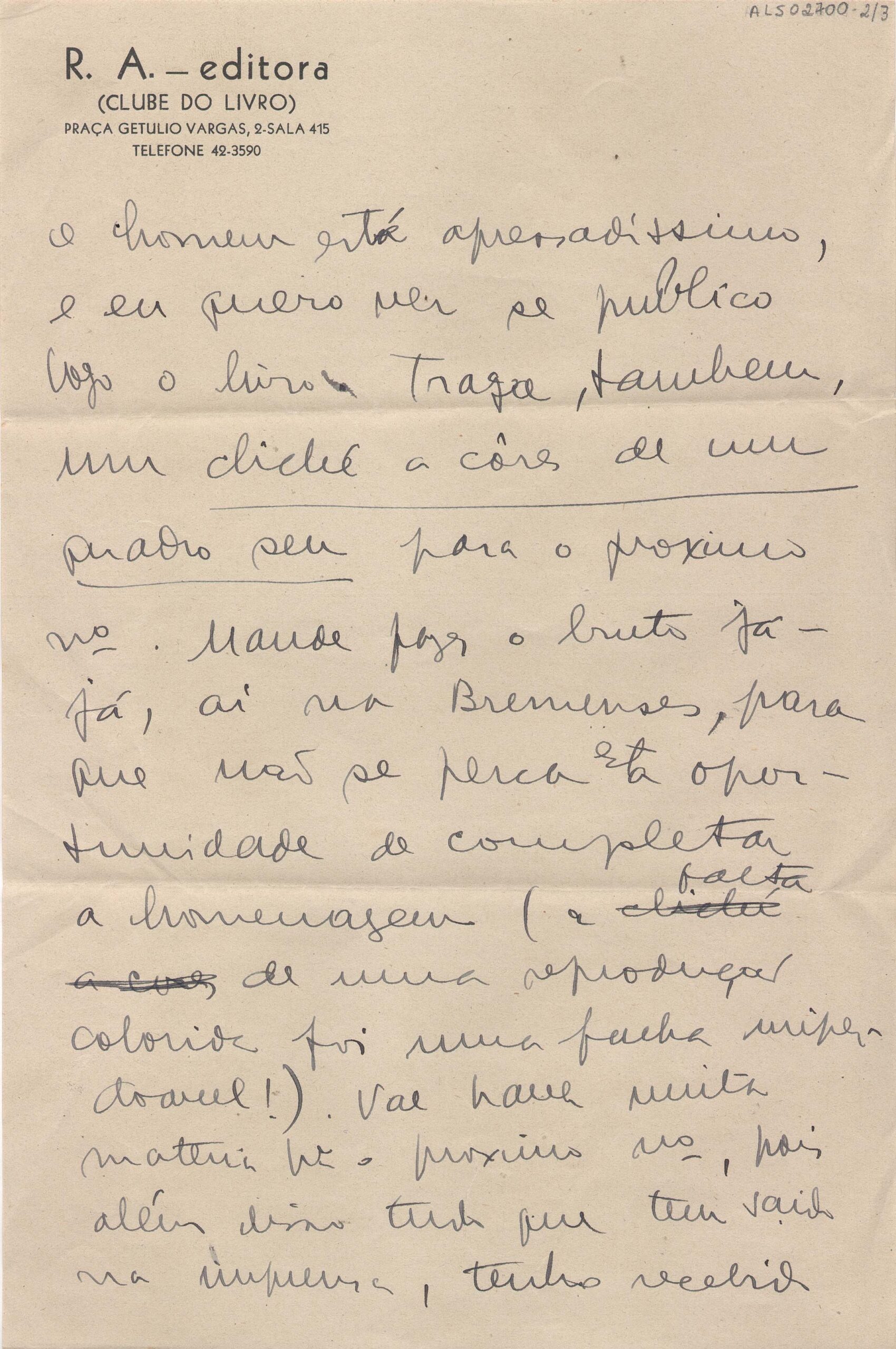 No verso da folha 3, rascunho da carta resposta (ALS 02701) manuscrita por Segall a grafite / Item Relacionado: Cita a carta de Richard Lewinsohn (ALS 02698); carta resposta de Segall (ALS 02701)