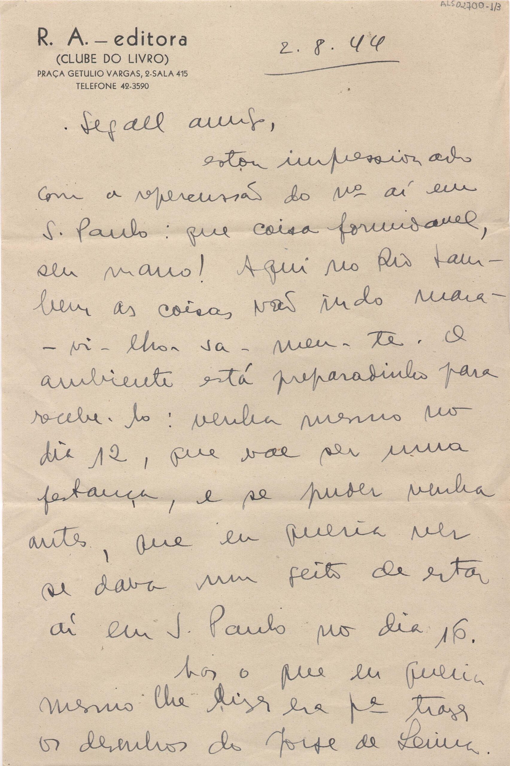 Diz que está impressionado com a repercussão do número da Revista Acadêmica em São Paulo; diz que no Rio as coisas também estão indo muito bem; que o ambiente está preparado para recebê-lo, e que Segall devia mesmo ir mesmo no dia 12, que vai ser uma festança; Murilo pretende estar em São Paulo no dia 16; mas que o urgente é Segall levar os desenhos do Jorge de Lima, que está apressado, e Murilo pretende publicar o livro [Poemas negros] logo; para Segall também levar cliché a cores de um quadro para o próximo número da revista; fala que já tem muitas matérias para o próximo número; envia a carta de Richard Lewinsohn (ALS 02698) que pretende reproduzir; pergunta se vale a pena transcrever todos os artigos que Mário de Andrade escreveu sobre Segall