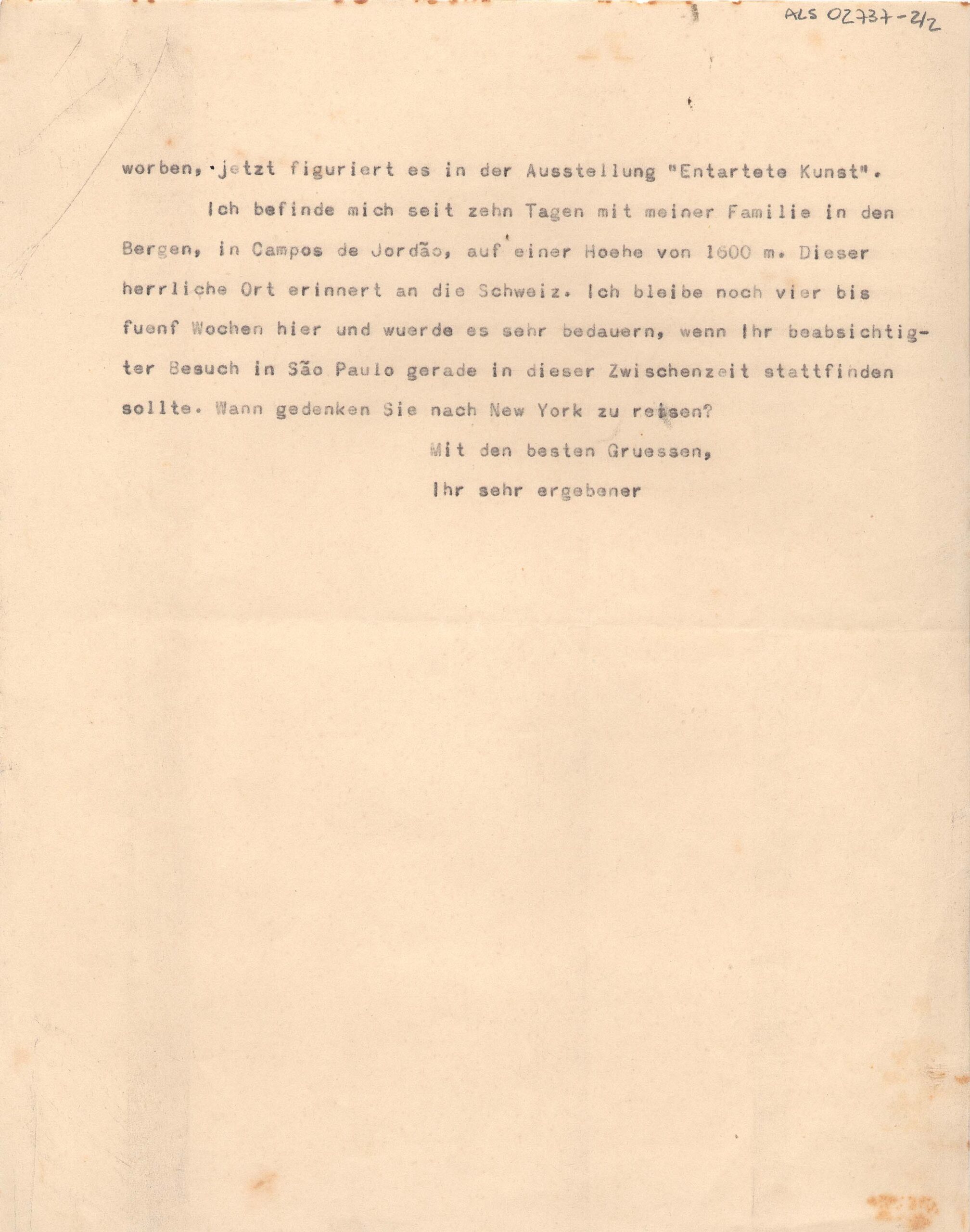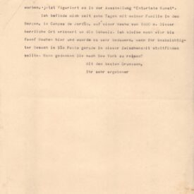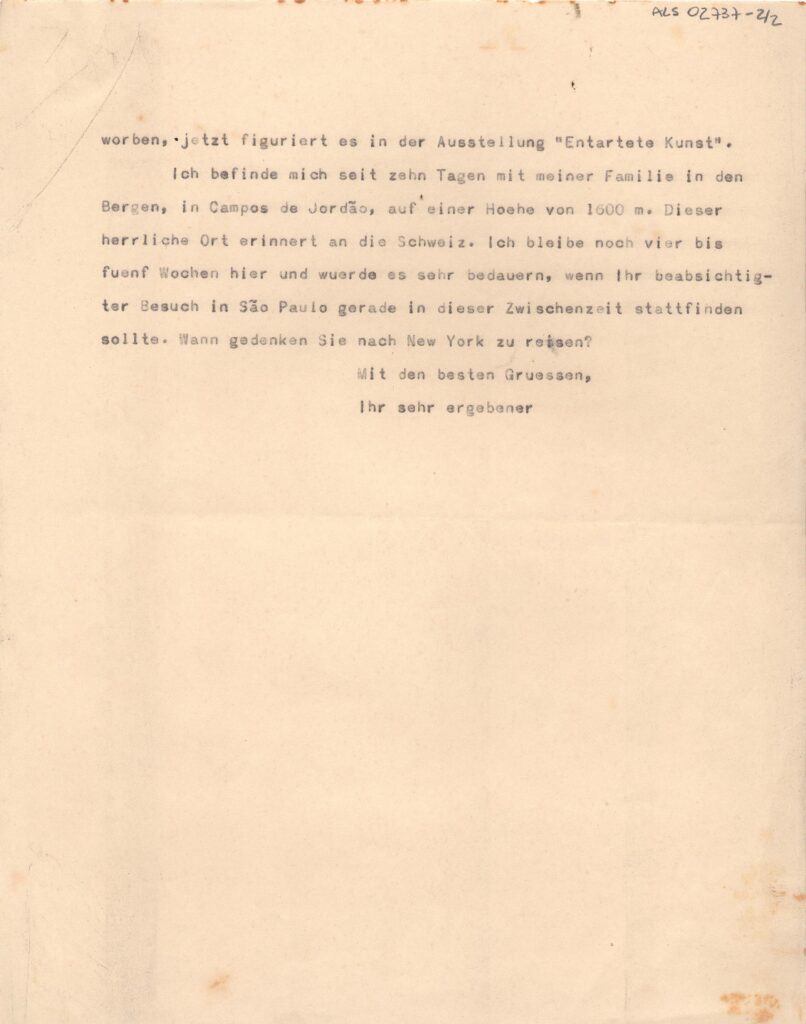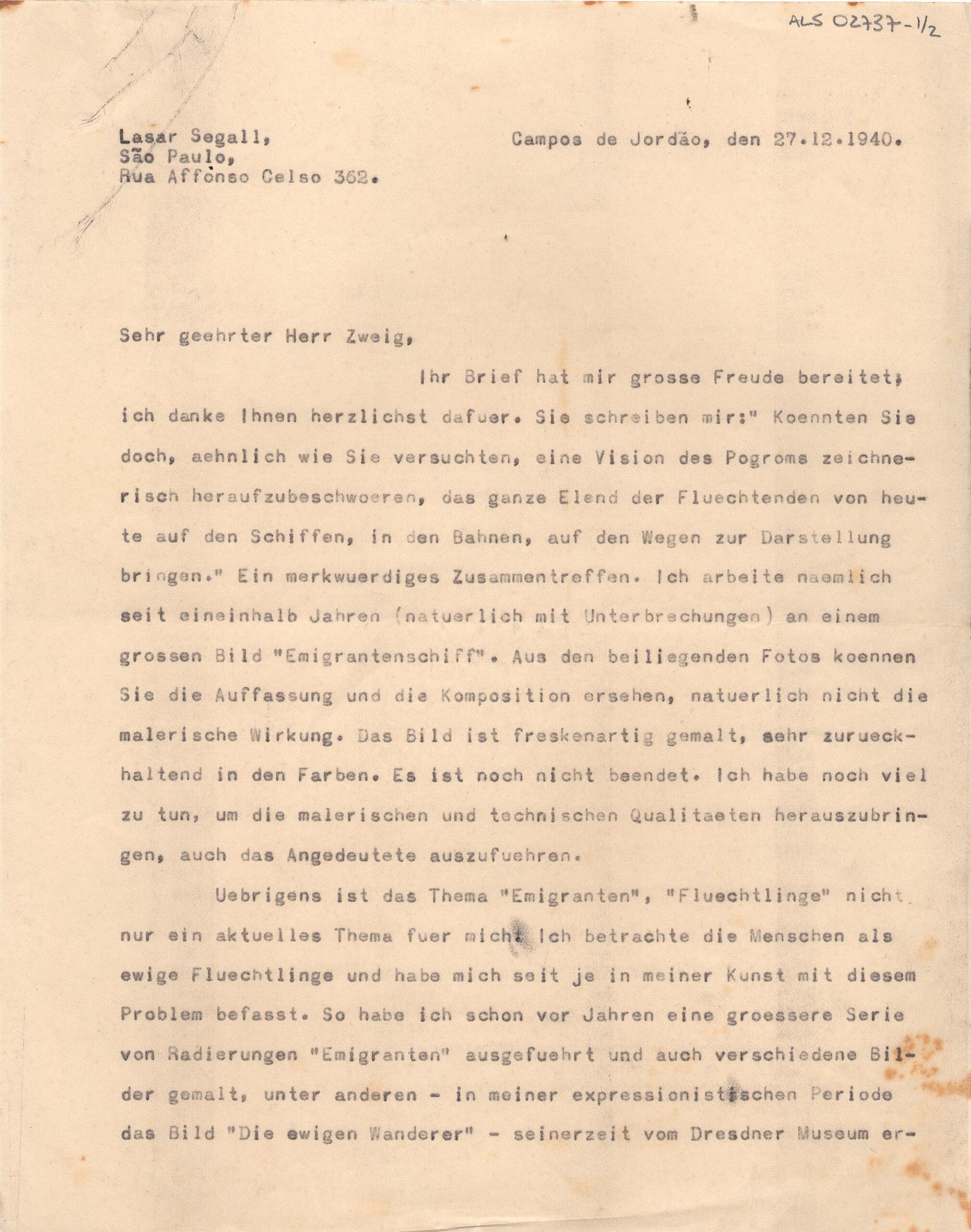 Respondendo à carta em que Stefan Zweig sugere que Segall seria o artista certo para traçar uma visão dos pogroms, uma homenagem aos refugiados de todos os tempos, Segall responde que esse tema não é novo para ele; diz que está trabalhando em uma grande tela, Navio de emigrantes, e que considera os homens como eternos refugiados; que também trabalhou o tema Emigrantes em uma grande série de gravuras; e que no período expressionista criou a tela Eternos caminhantes, à época adquirida pelo Museu de Dresden, e que figurou na exposição Arte Degenerada; está passando uma temporada em Campos do Jordão, lugar que lembra a Suíça