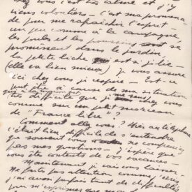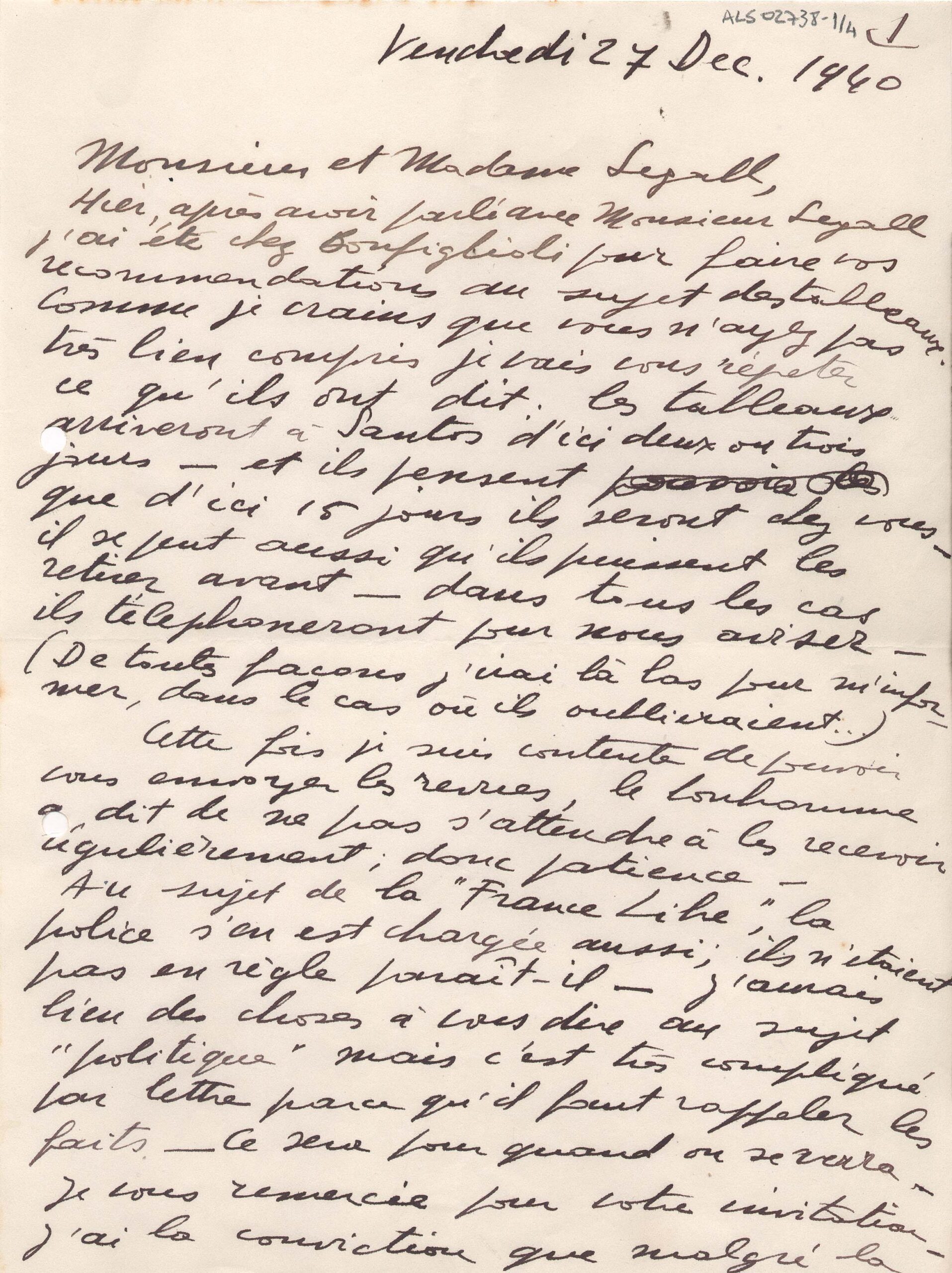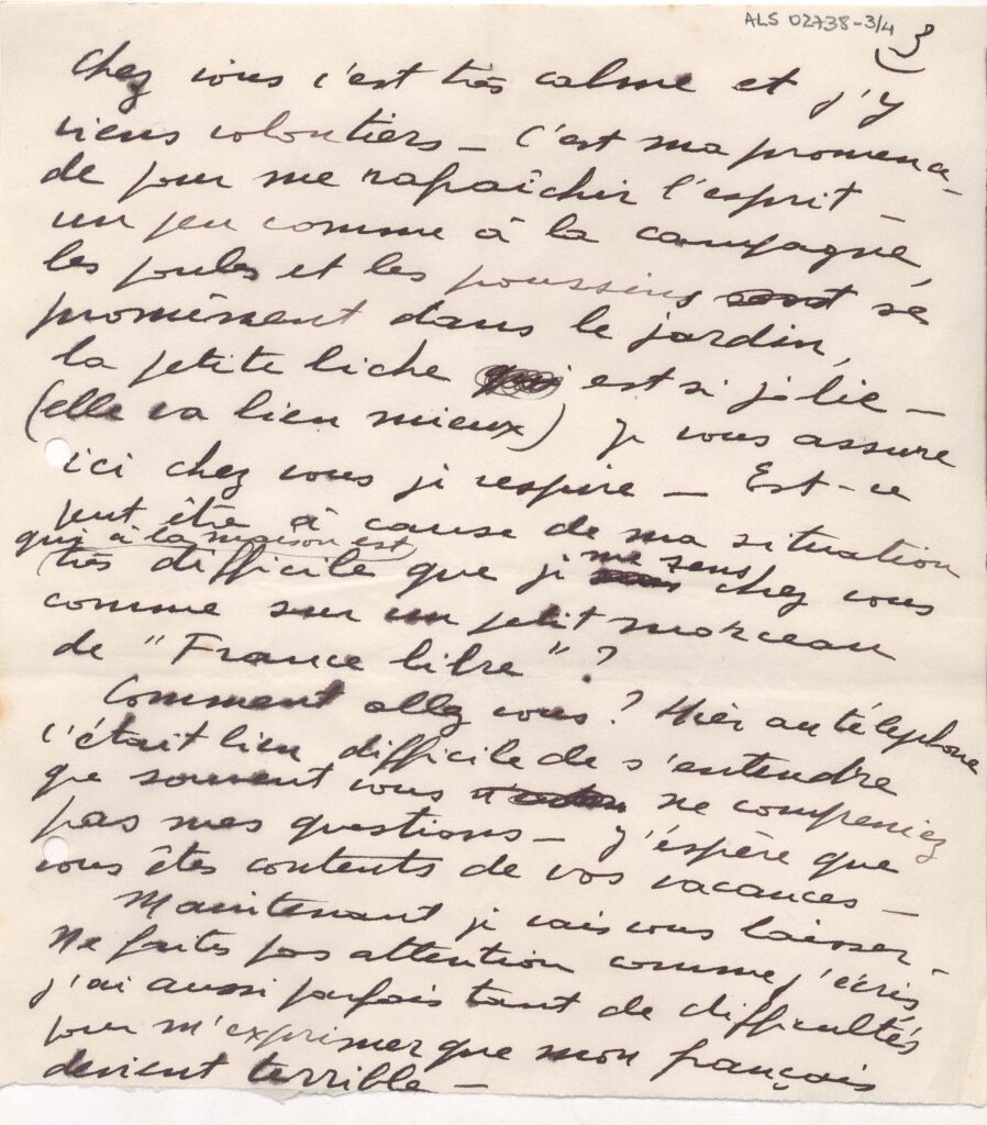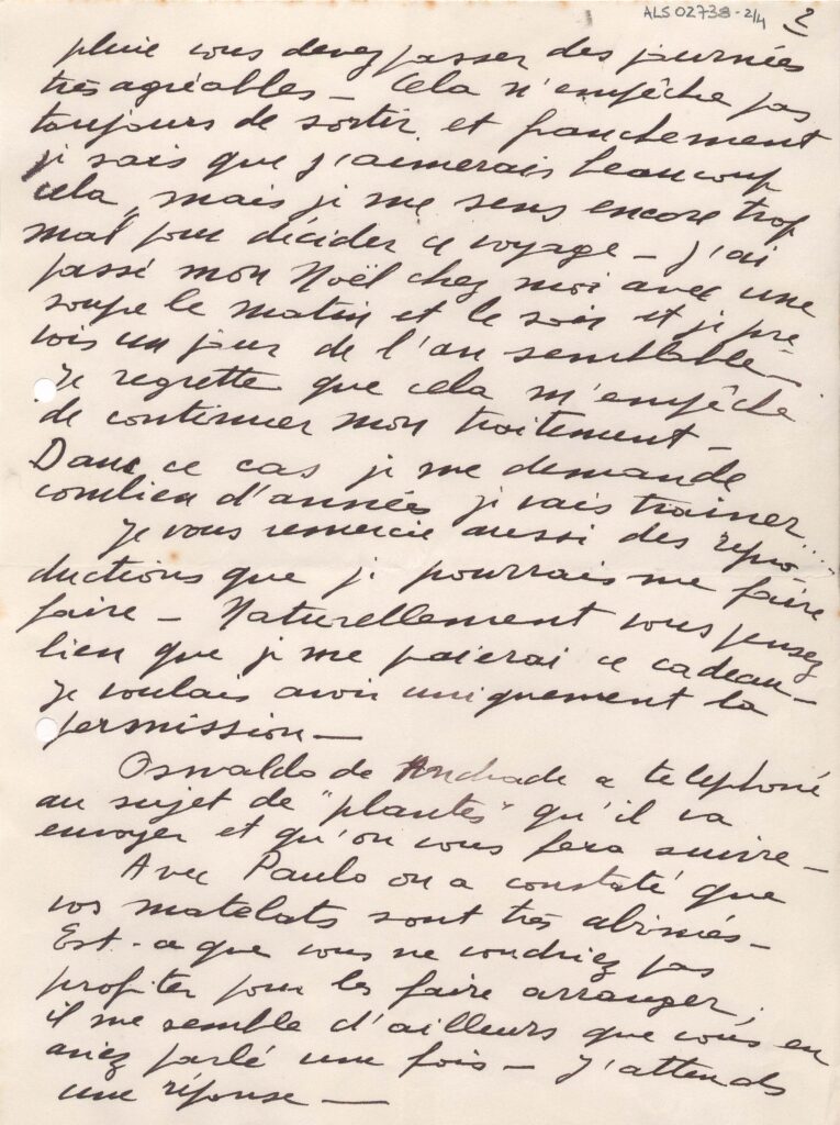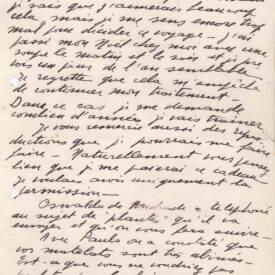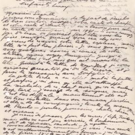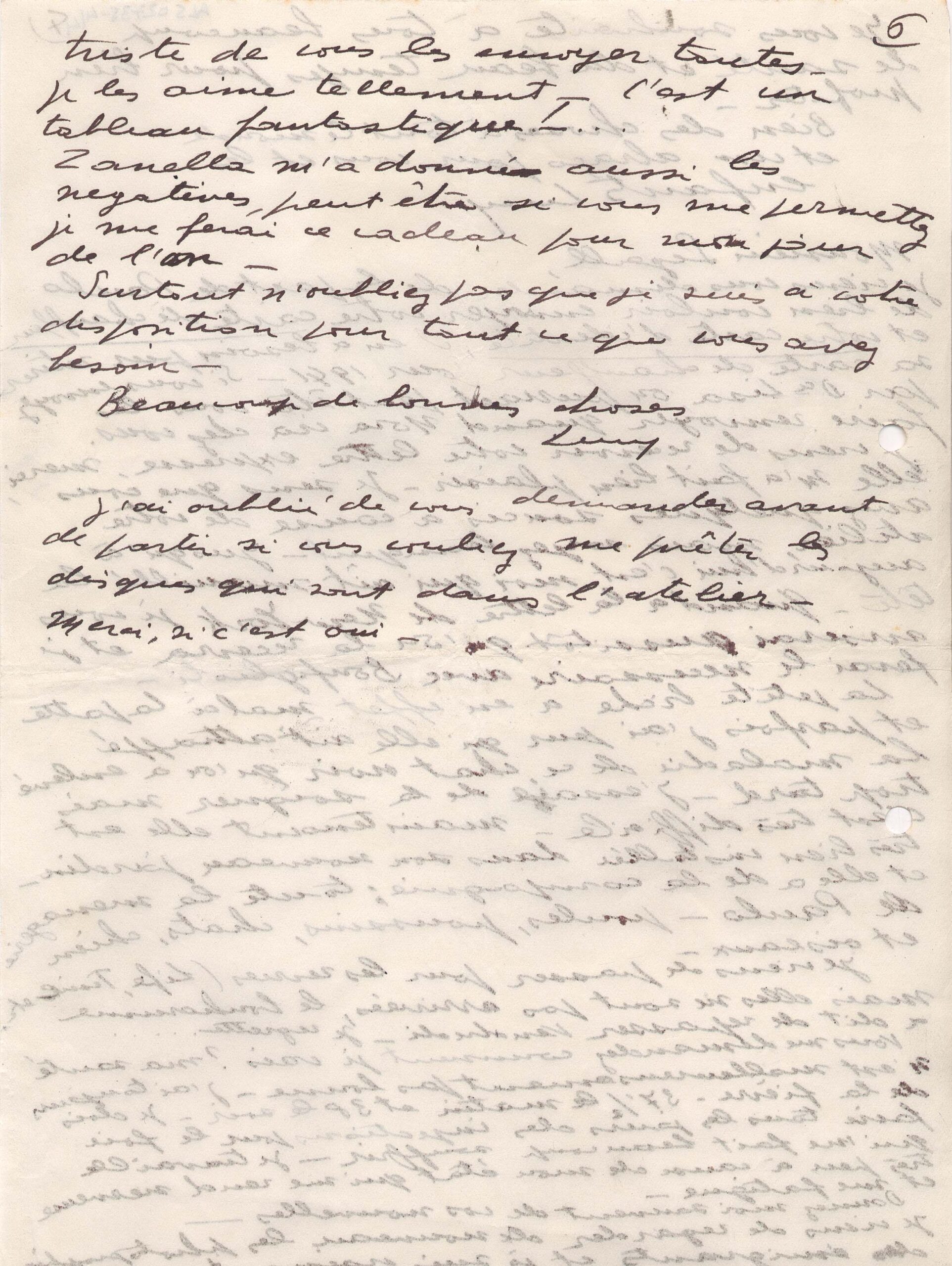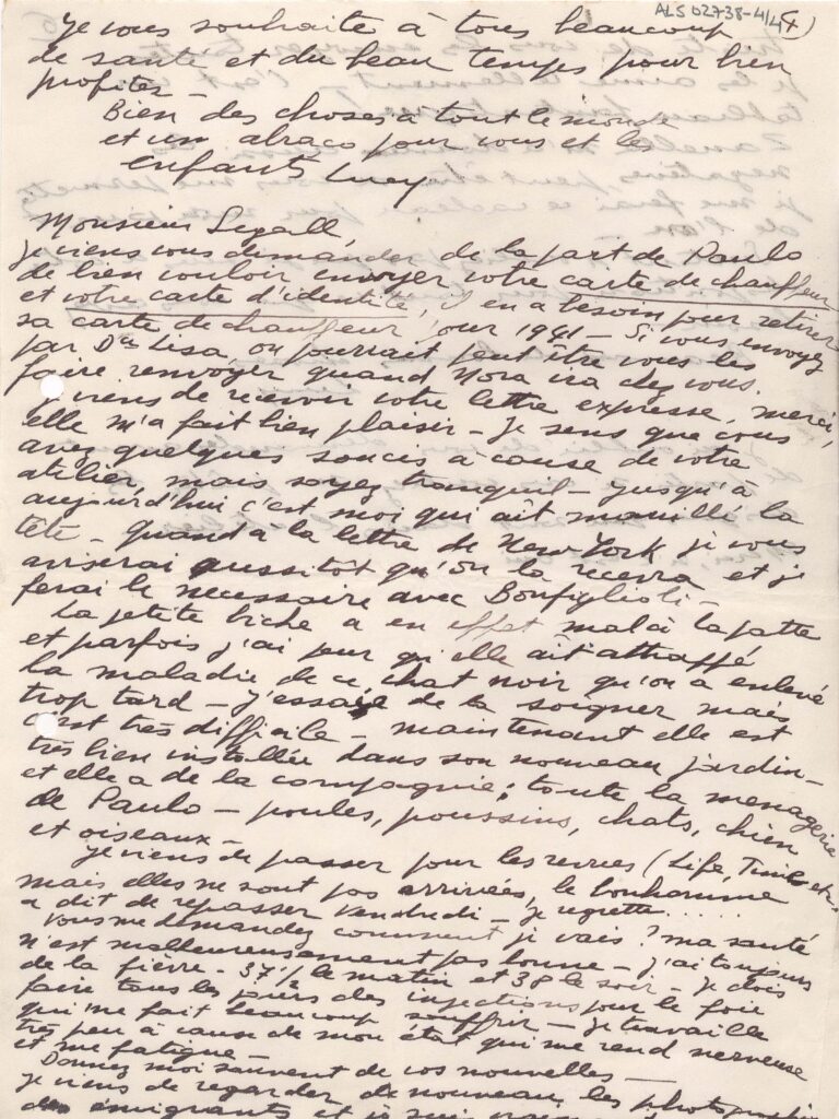 Lucy diz que está resolvendo, com o escritório despachante Bonfiglioli o retorno dos quadros, que chegam em Santos em dois ou três dias; envia revistas; diz que falará pessoalmente sobre os assuntos políticos; Oswald de Andrade telefonou a propósito das "plantas"; vê as galinhas, pintinhos e a pequena corça passeando no jardim, onde se sente em um pedaço da "França livre"; pede a Segall que envie documentos para renovar a carta de motorista; refere as fotografias da tela "Emigrantes", que não se cansa de olhar