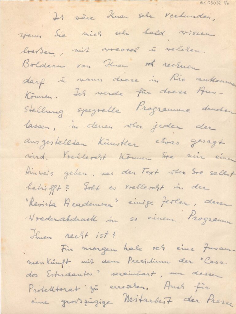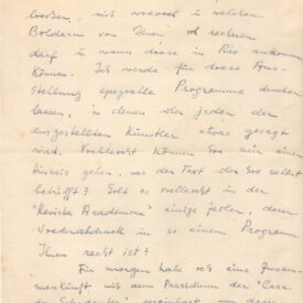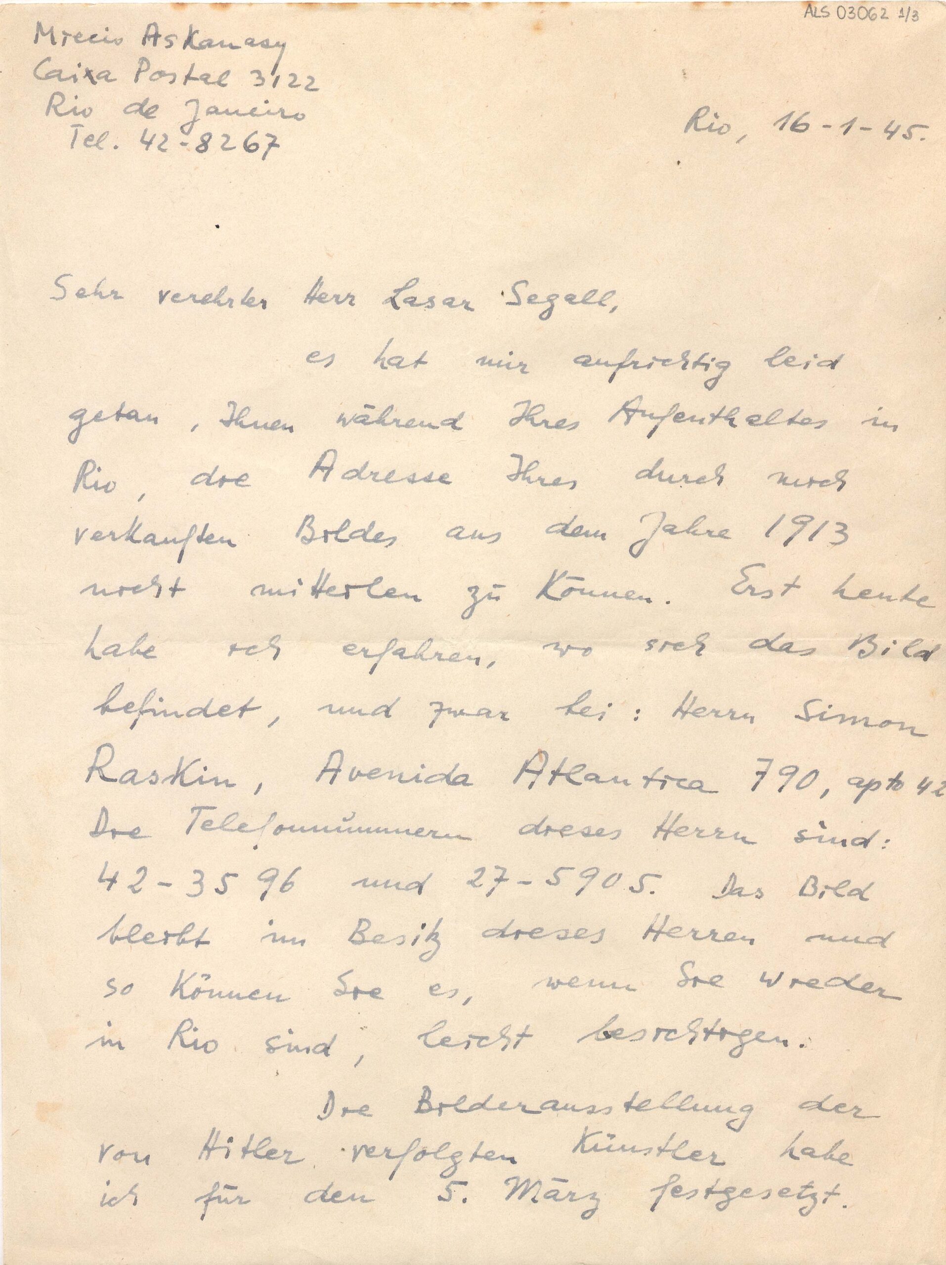 Dá notícia a Lasar Segall de um quadro seu de 1913, pertencente à coleção de Simon Raskin, no Rio de Janeiro; e que quando Segall vier ao Rio, poderá ver o quadro; fornece endereço e telefone do proprietário da obra; diz que a exposição dos artistas perseguidos por Hitler ficou marcada para 5 de março e que terá uma programação especial