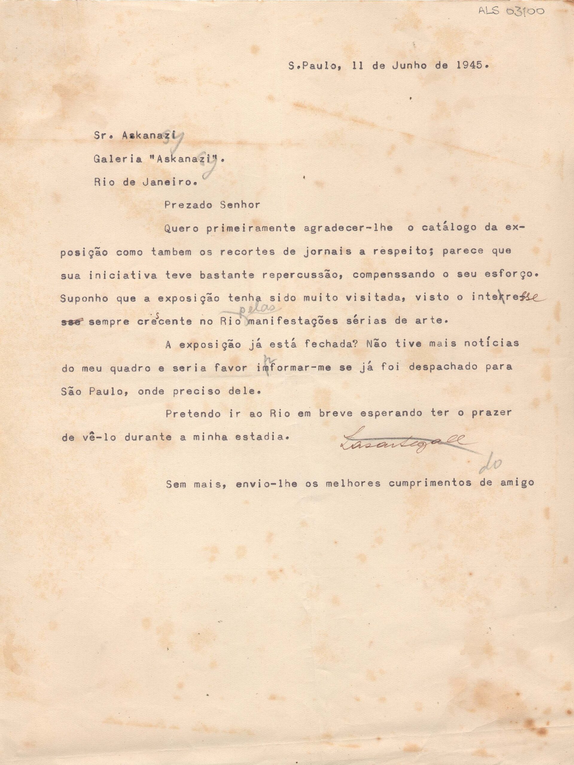 Carta datiloscrita a tinta preta com correções a grafite; assinatura de Lasar Segall, canto inferior direito a tinta sépia, riscada