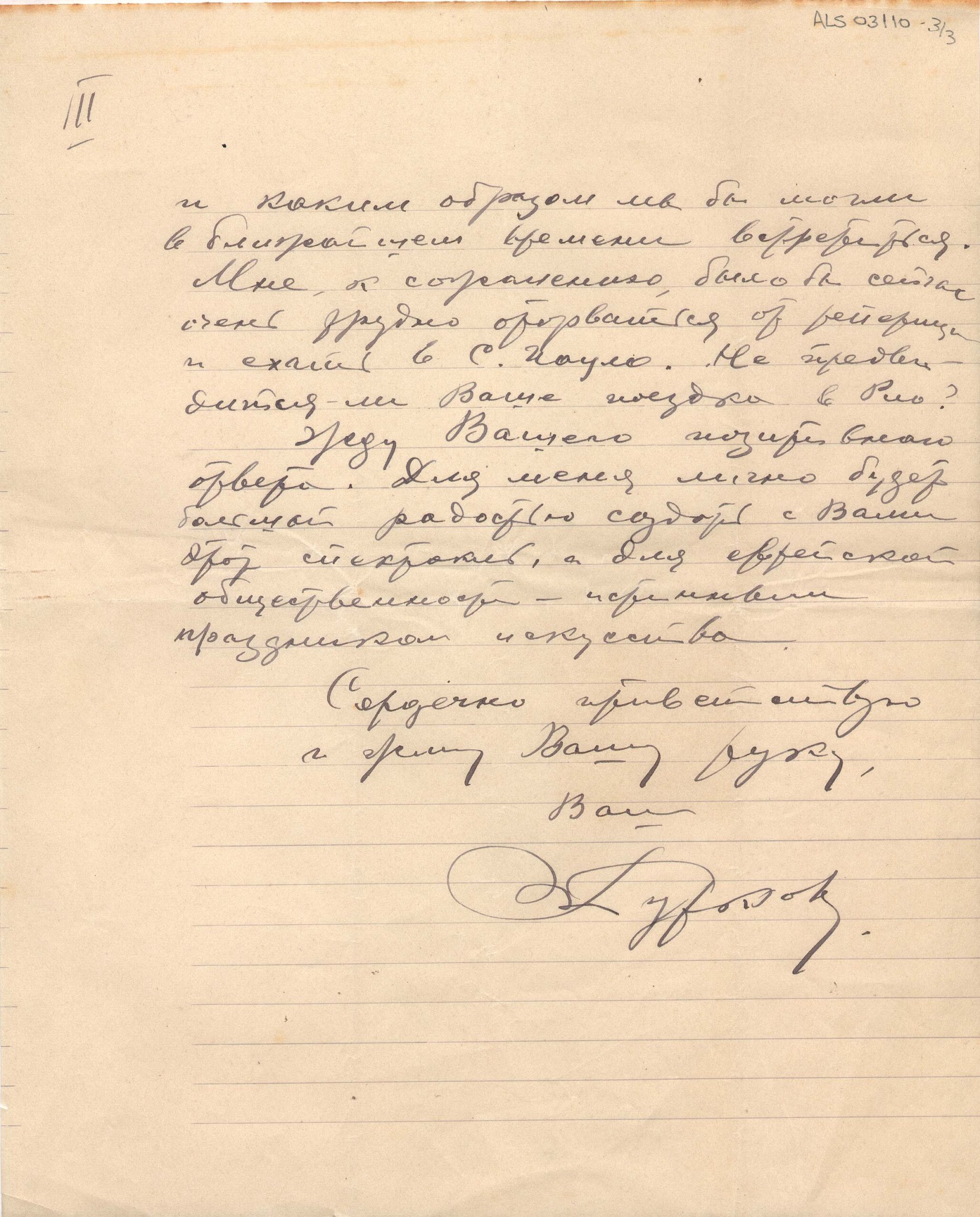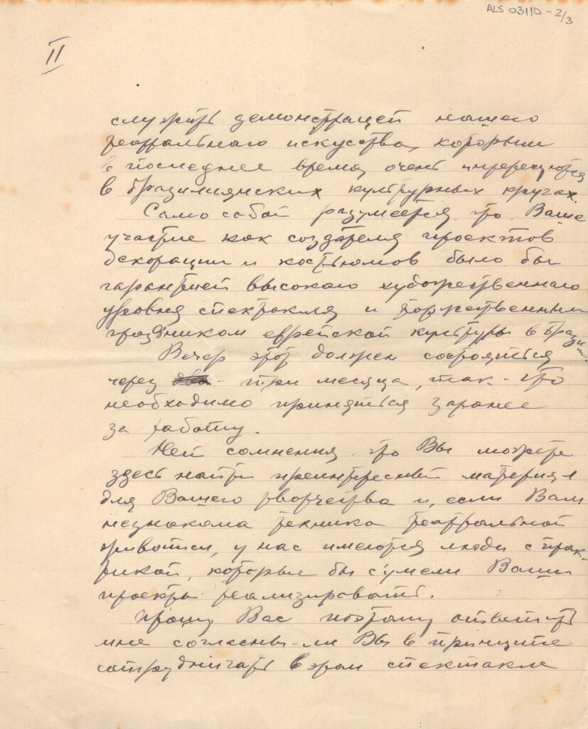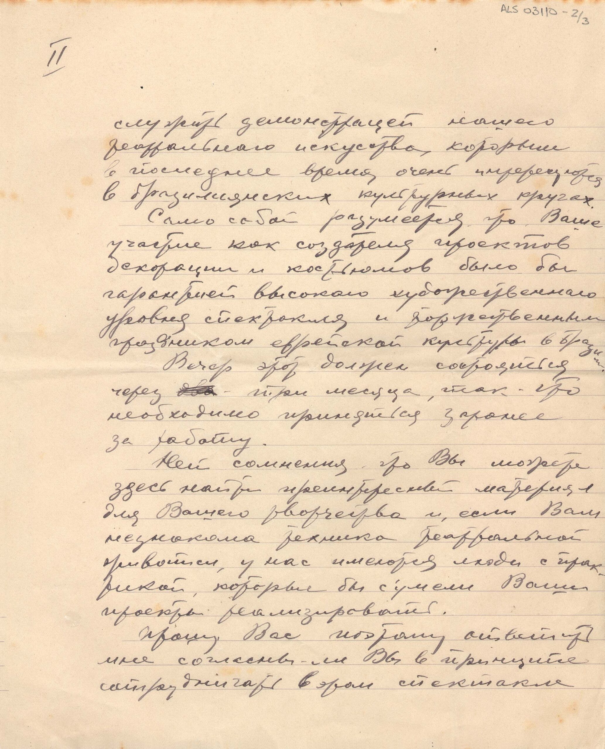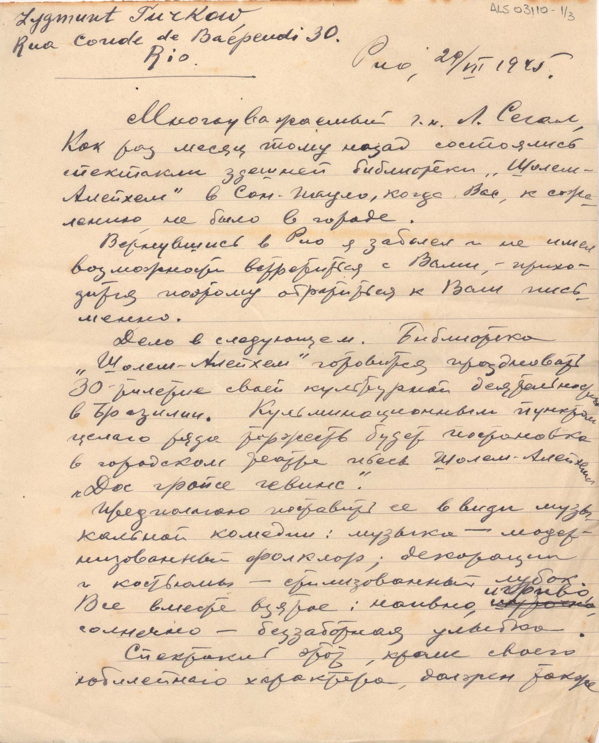 Turkow convida Segall a realizar os cenários e figurinos da peça Dos groisse guevins, de Scholem Aleichem, afirmando que "sua participação como criador dos projetos de cenário e figurino seria a garantia de um alto nível artístico para o espetáculo e uma celebração solene da cultura judaica no Brasil"; espera receber em breve a resposta afirmativa de Segall, contando também que ele possa ir ao Rio para que possam se encontrar