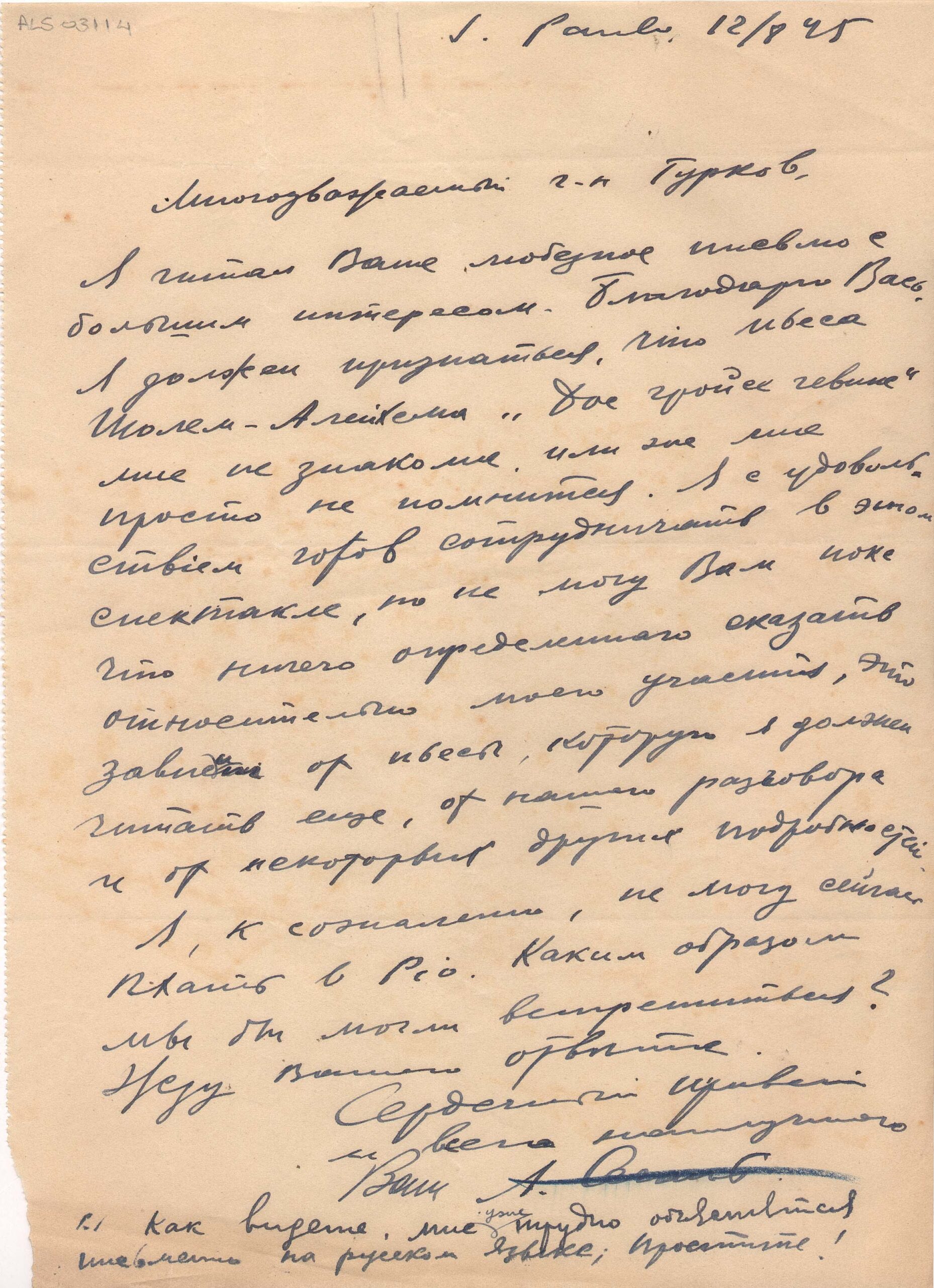 Diz que leu a carta de Turkow com grande interesse e agradece; não conhecia a peça de Scholem Aleichem ou se esqueceu dela, mas está disposto a colaborar nesse espetáculo; no momento não pode dar uma resposta definitiva em relação à sua participação, diz que depende da peça, que deve ler, da conversa que devem ter e de outros detalhes; informa não poder ir ao Rio de Janeiro e pergunta como poderiam se encontrar; diz, no PS: "como vê, já tenho dificuldade em me expressar por escrito em russo; perdão!"