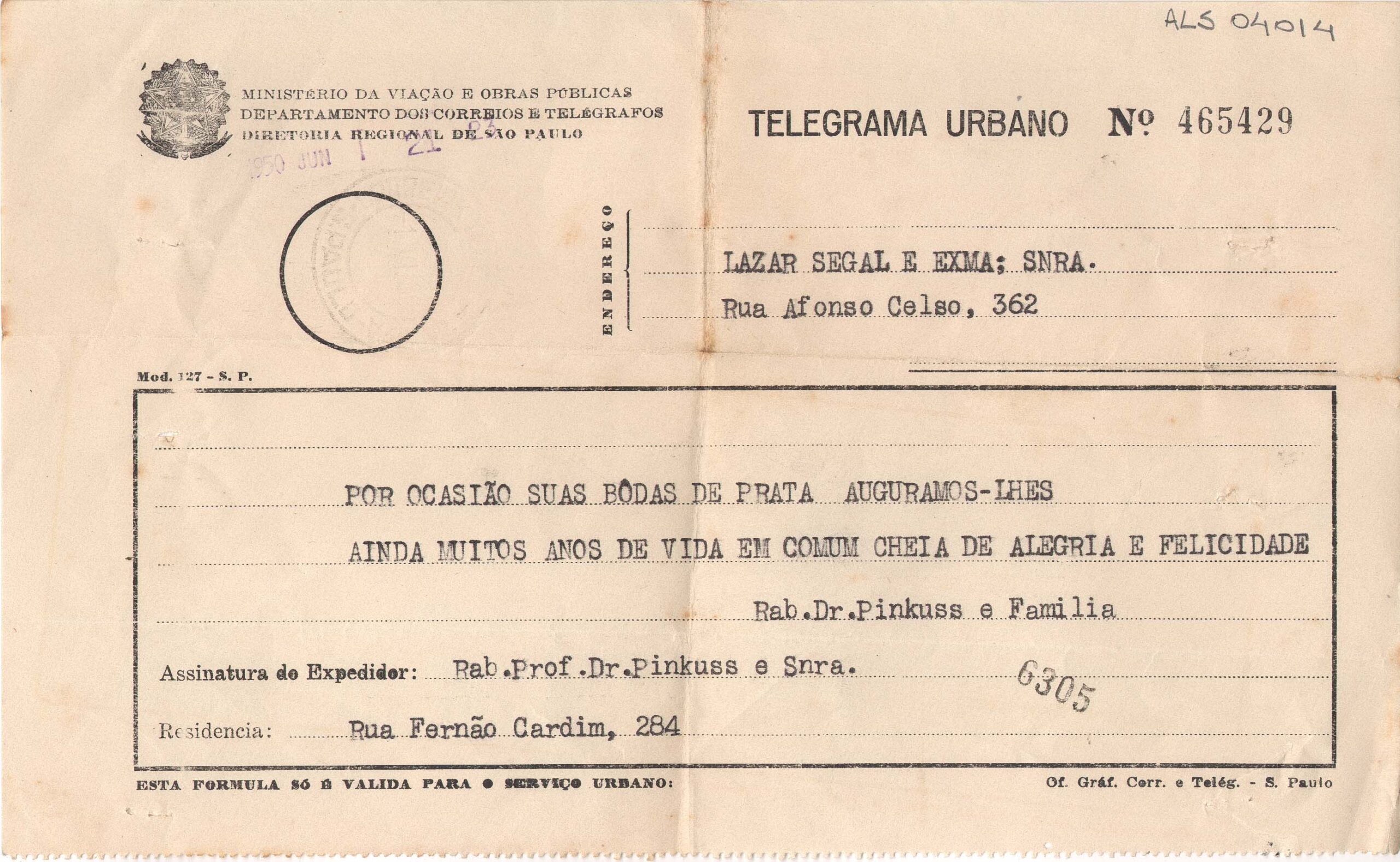 Felicitações pelas bodas de prata de Lasar Segall e Jenny Klabin Segall