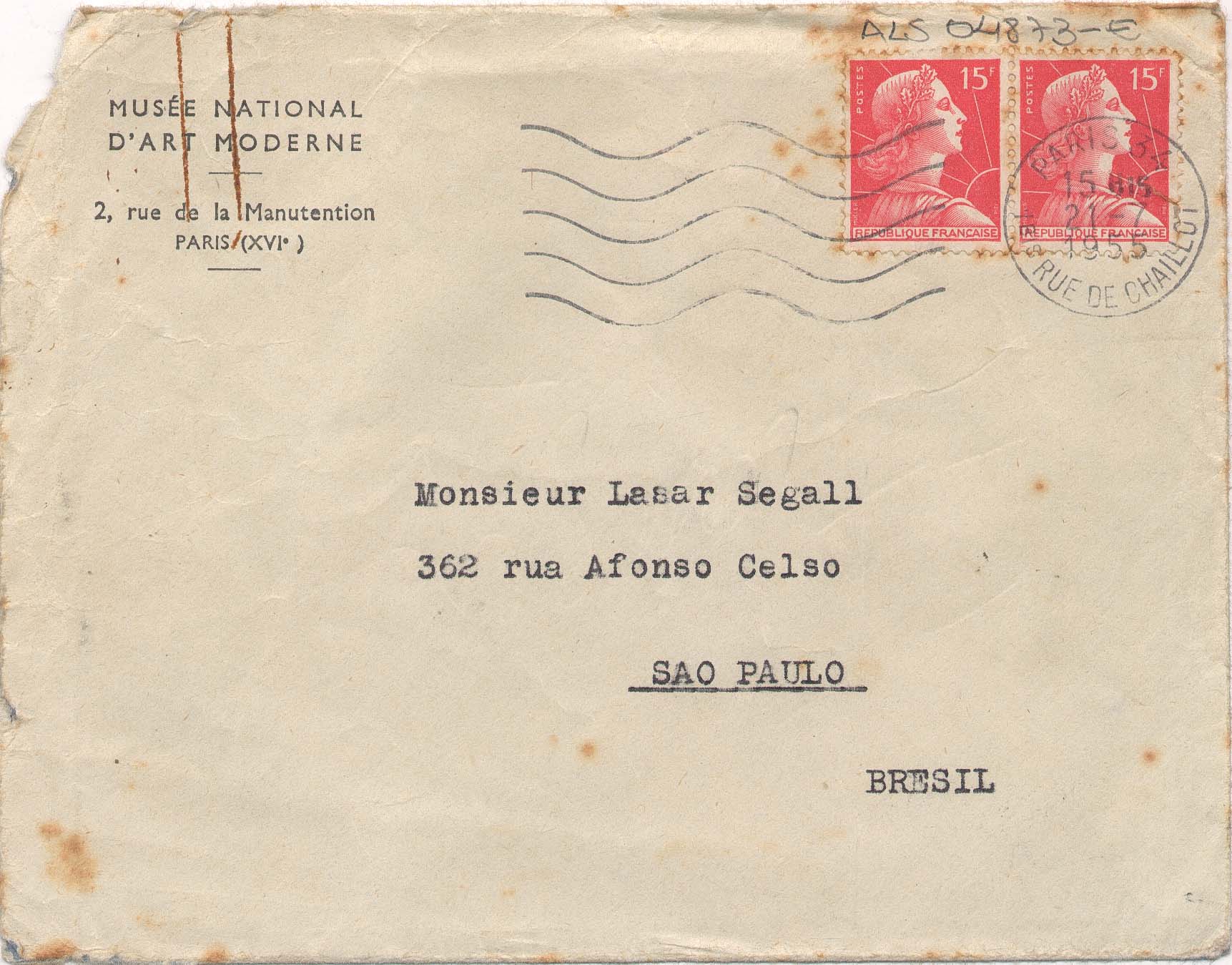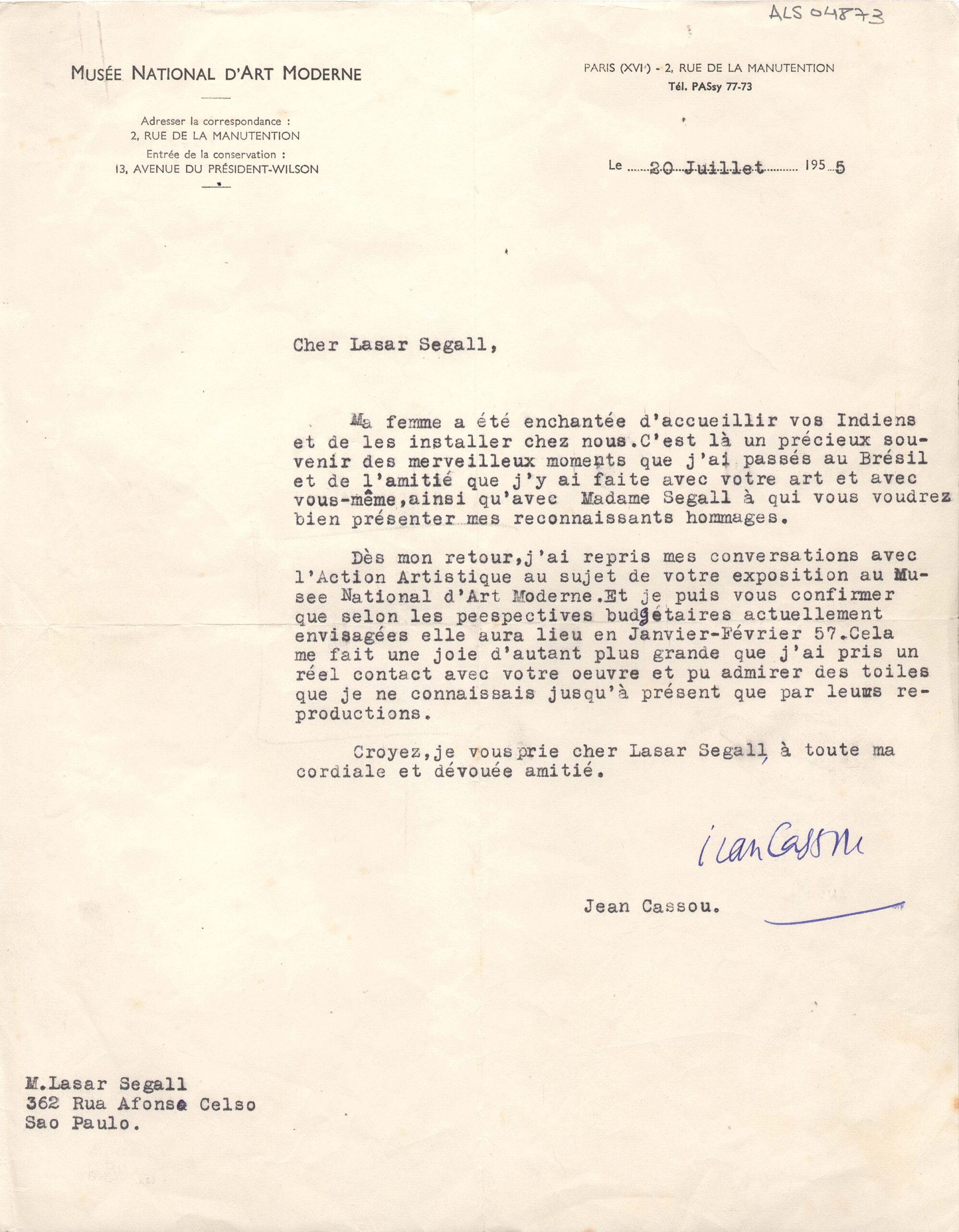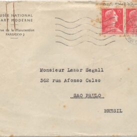 Papel timbrado: "Musée National D`Art Moderne"; assinatura em tinta azul; acompanha envelope