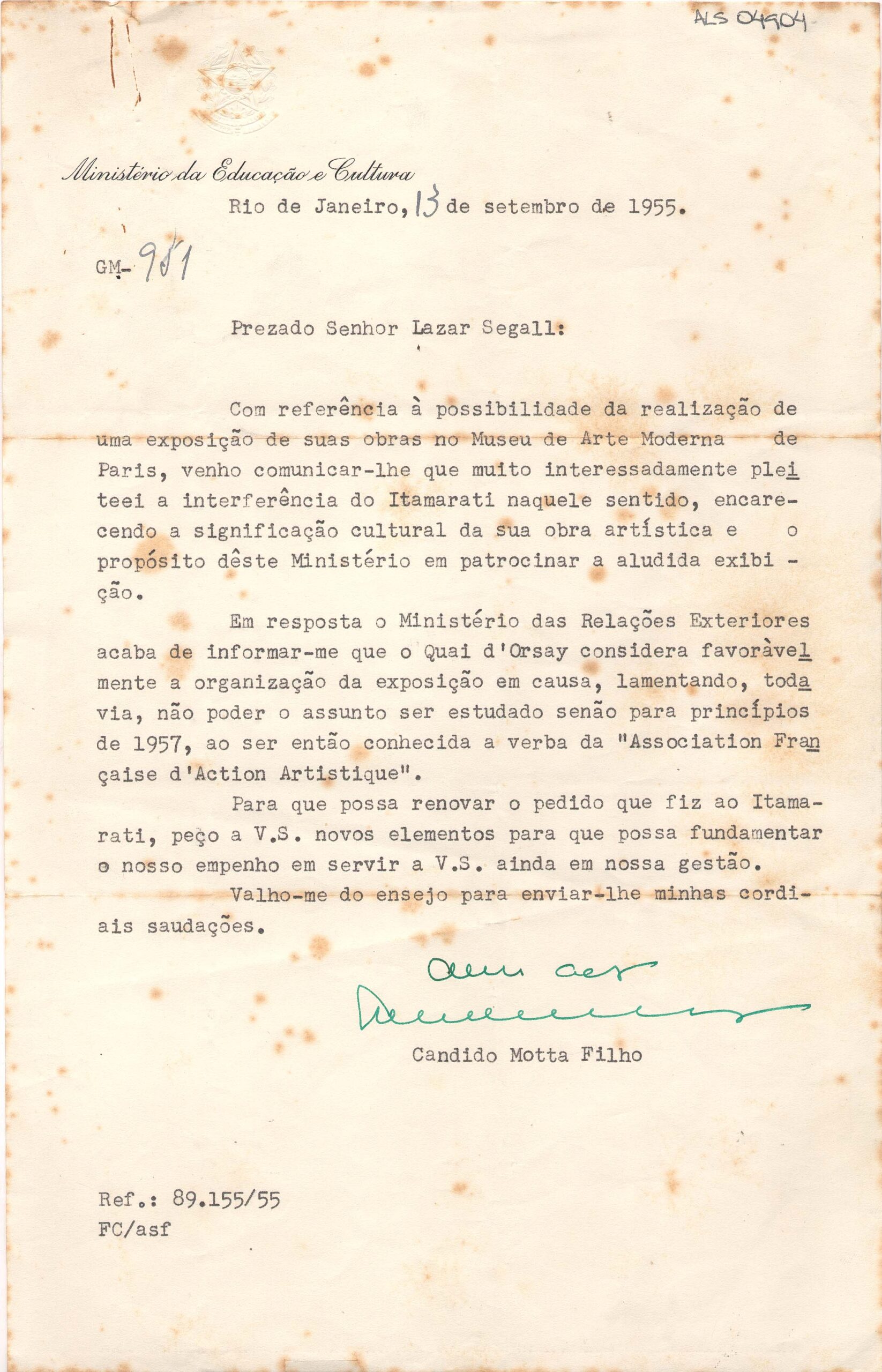 Papel timbrado: "Ministério da Eduacação e Cultura"; assinatura em tinta verde / Item Relacionado: Tem como anexo o doc: ALS 04904