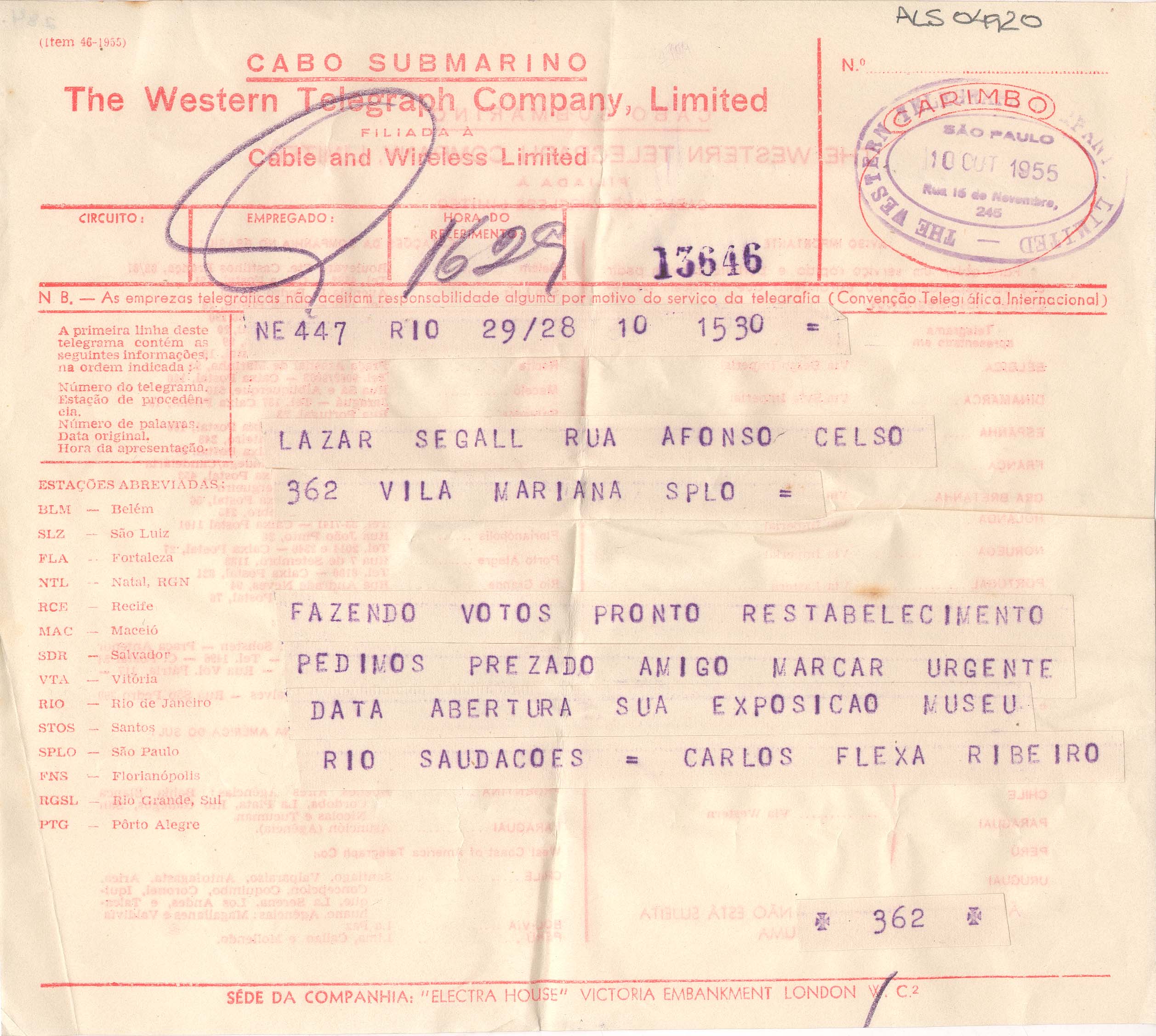Pedido de urgência para que Lasar Segall marque a data de sua exposição no Museu de Arte Moderna do Rio de Janeiro