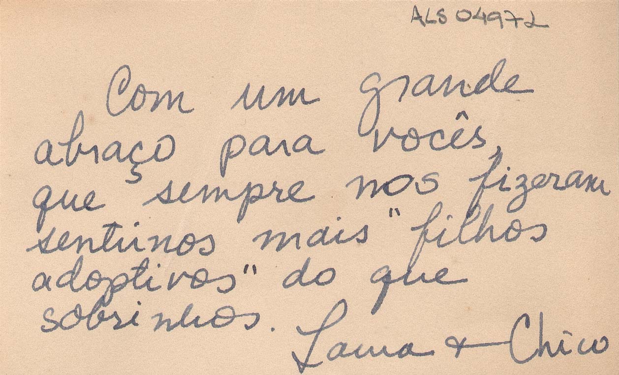 Manuscrito: "Com um grande abraço para vocês que sempre nos fizeram sentir nos mais "filhos adoptivos" do que sobrinhos. Laura e Chico"