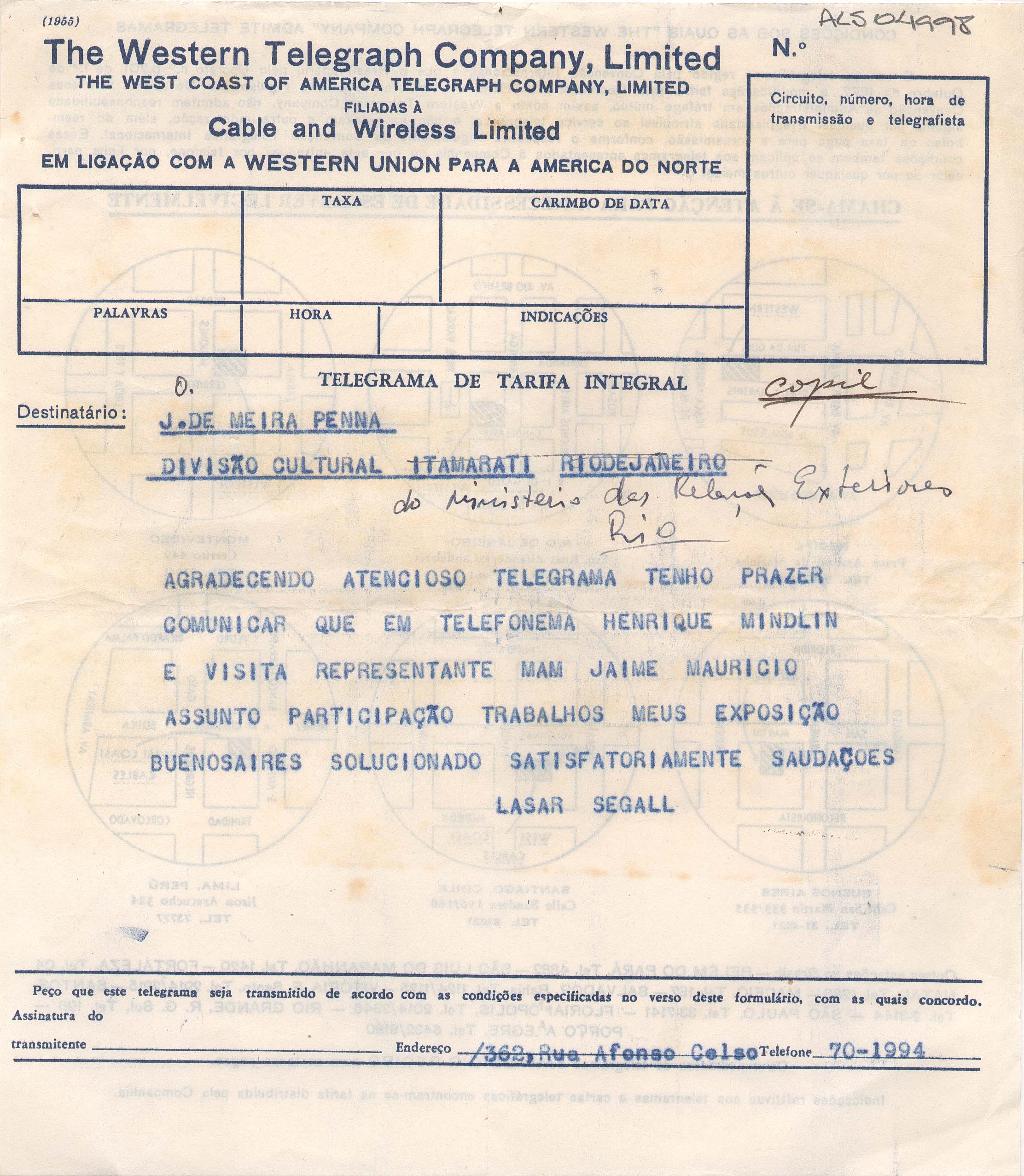 ALS Pasta: (Correspondência para Segall 2 - gaveta II - anos 40 e 50) [letra Vera dHorta]