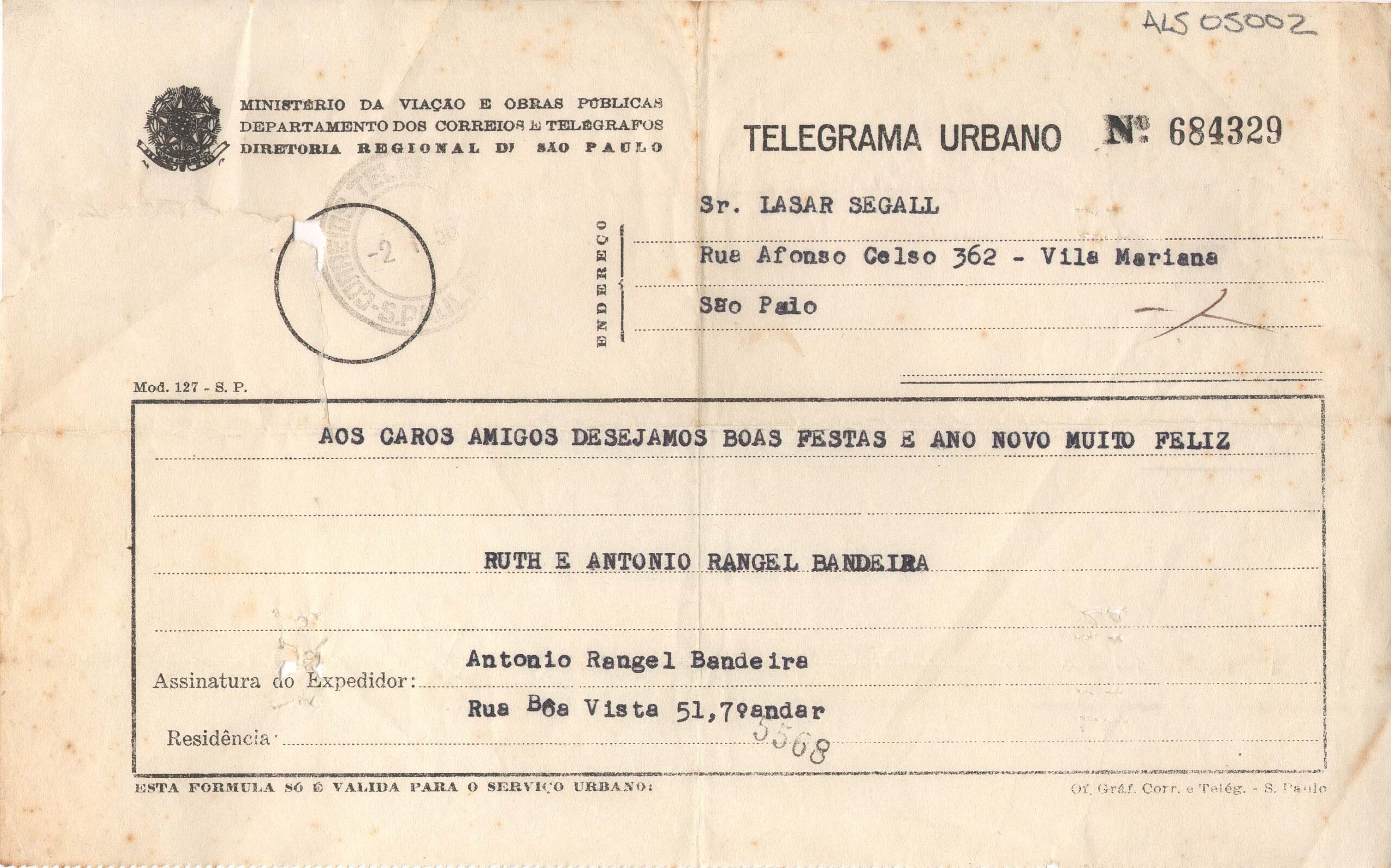 ALS Pasta: (Correspondência para Segall - anos 50 - gaveta 1) [letra Vera dHorta]
