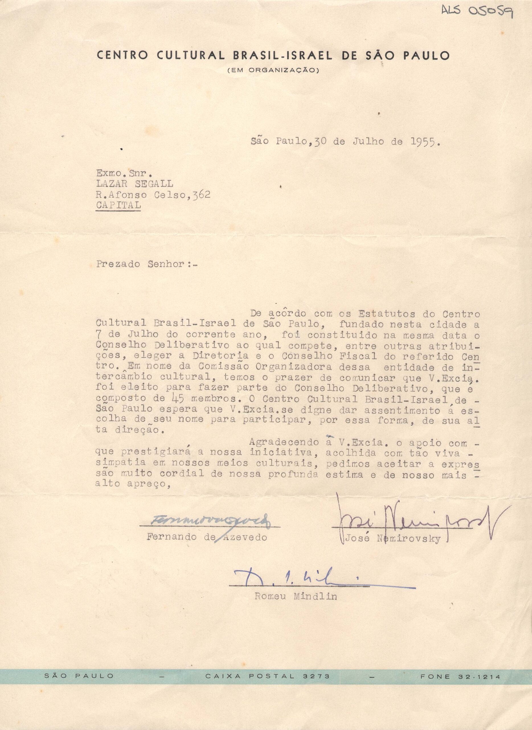 Papel timbrado: "Centro Cultural Brasil-Israel de São Paulo"; três assinaturas em tinta azul