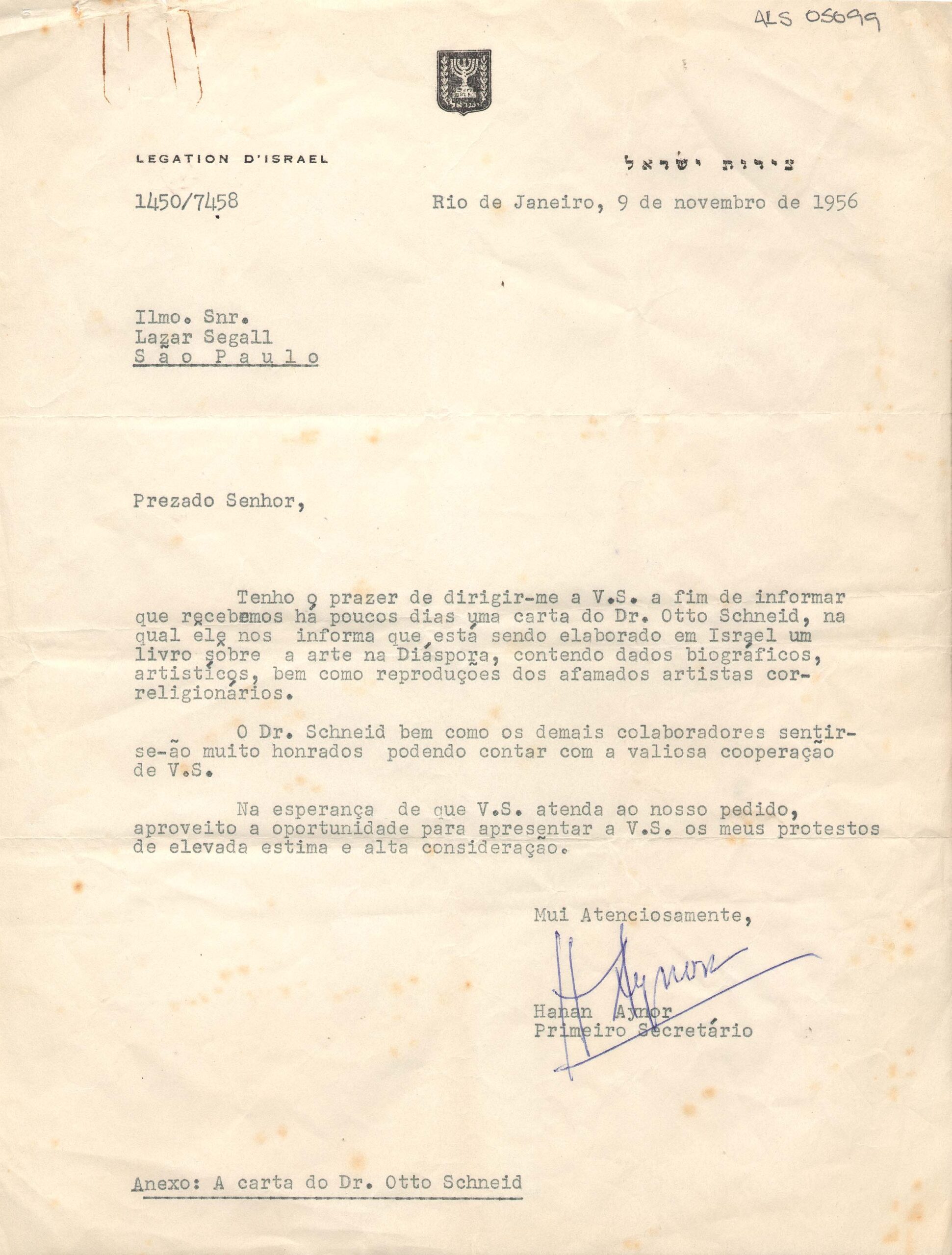 Papel timbrado: "Legation d´Israel"; assinatura em tinta azul / Item Relacionado: Tem como anexo o doc: ALS 05098