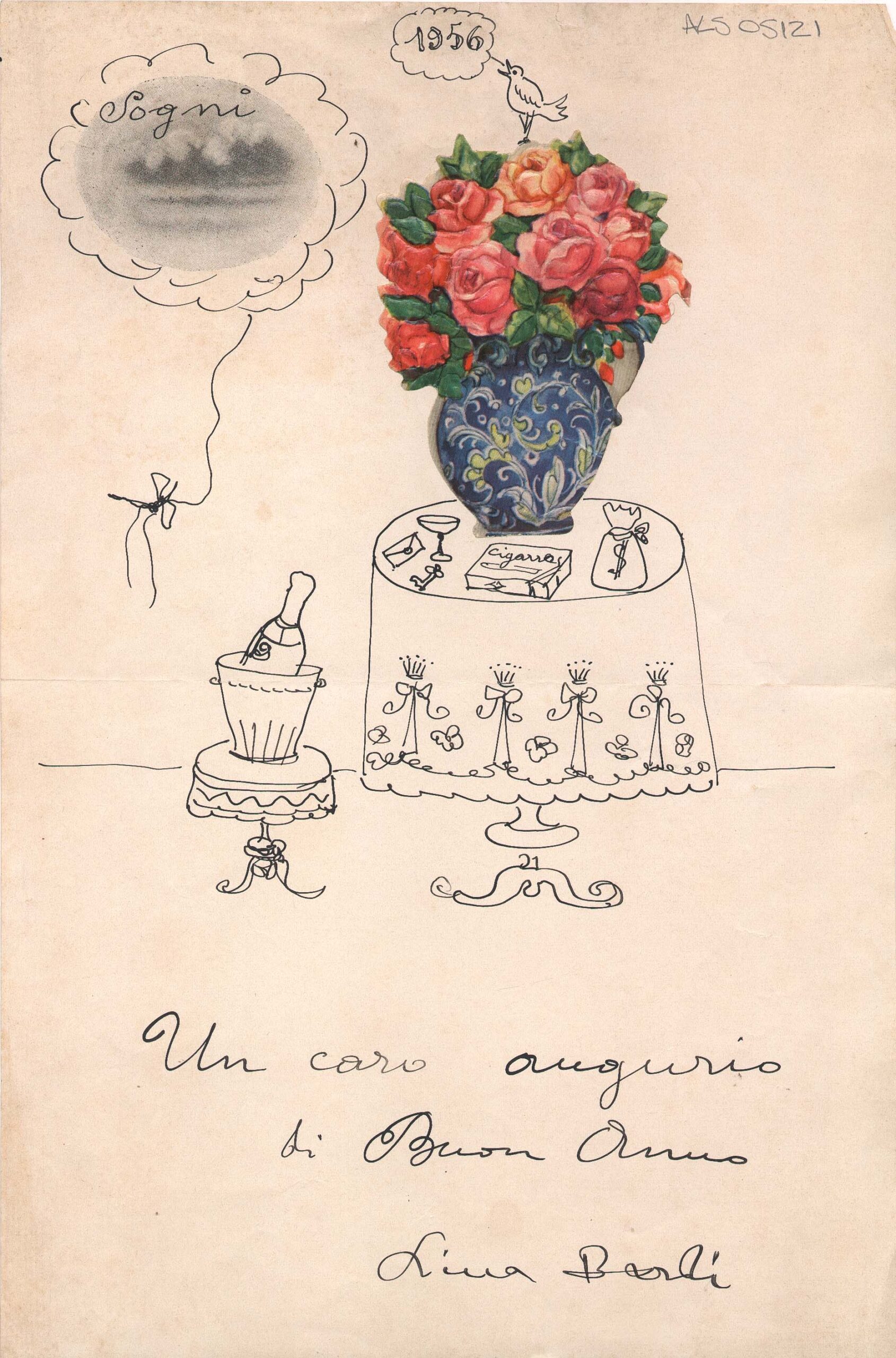 Desenho feito por Lina Bardi em caneta preta, colagem