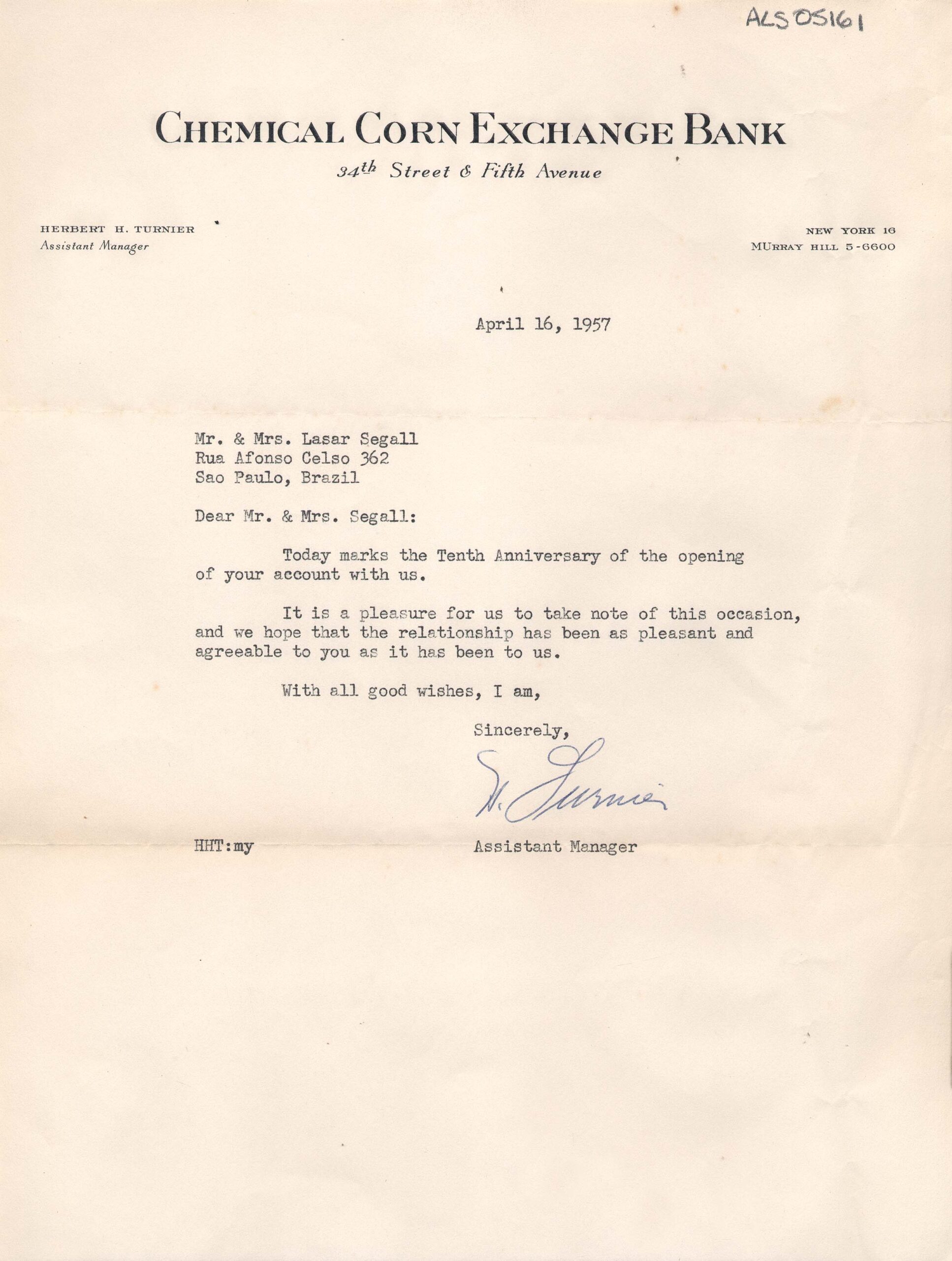Papel timbrado: "CHEMICAL CORN EXCHANGE BANK"; assinatura em tinta azul, acompanha envelope